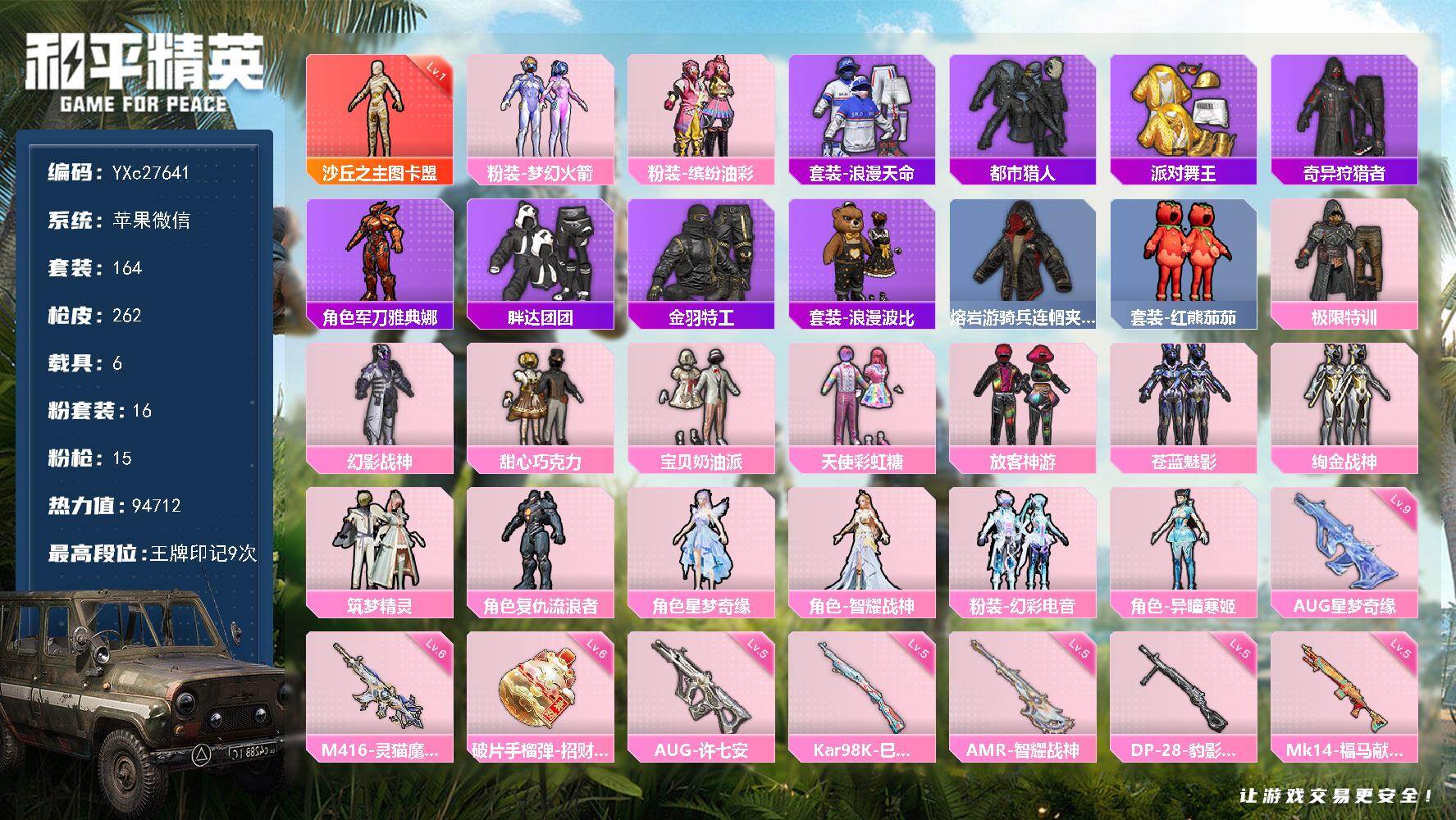PX_2557259-图卡盟,都市,金鞋,巧克力,猪妹,放客,极限特训,满级AUG星梦,6把计数枪,番茄,胖达,粉熊包,满地铁天赋】YXc27641-【可二次】【因赛季更新游戏段付以上号为准!】 ,苹果V-1红装5稀有7载具16粉装15特效枪16热门164套装262枪皮,9印记,历史卓越王牌11星, 【1红装】,沙丘之主-图卡盟,(1级), 【5稀有】,奇异狩猎者,都市猎人,浪漫天命,派对舞王,派对舞王(金靴子), 【7载具】,星河领航(磐石银),宝马X6M(曼岛绿),时空跃影(星辉银),灵鼠银迹,黑曜夜骑,幽焰风驰摩托车,萌兔起飞僚机, 【16粉装】,梦幻火箭,宝贝奶油派,天使彩虹糖,甜心巧克力,异瞳寒姬,星梦奇缘,幻影战神,智耀战神,幻彩电音,缤纷油彩,放客神游,筑梦精灵,极限特训,苍蓝魅影,绚金战神,复仇流浪者, 【15特效枪】,SCAR-L-梦幻火箭,(1级),SCAR-L-灵驹仙姬,(3级),P90-魔童闹海敖丙,(3级),M416-灵猫魔法师,(6级),AKM-幽焰骑士,(3级),Kar98K-巳巳如意,(5级),DP-28-豹影疾电,(5级),AUG-许七安,(5级),AUG-星梦奇缘,(9级),AMR-智耀战神,(5级),GROZA-精灵之光,(2级),M416-风花雪月,(1级),MG3-洛神天依,(2级),Mk14-福马献瑞,(5级),破片手榴弹-招财进宝,(6级), 【16热门】,红熊茄茄,鹰眼刺客,兔兔白日梦,激萌罗小黑,迅捷狂鲨,浪漫波比,金羽特工,胖达团团,团圆交子,瑞龙福将,水银刺客,狂沙舞者,漫步者,极速红龙,军刀雅典娜,M762-瑞龙福将, 【1飞行器】,幻海精灵飞行器, 【5头盔】,梦幻火箭头盔,甜心宝贝头盔,百万伏特头盔,深海小丑鱼头盔,夏日绵绵冰头盔, 【4背包】,梦幻火箭背包,甜心宝贝背包,萌熊伴侣背包,深海小丑鱼背包,