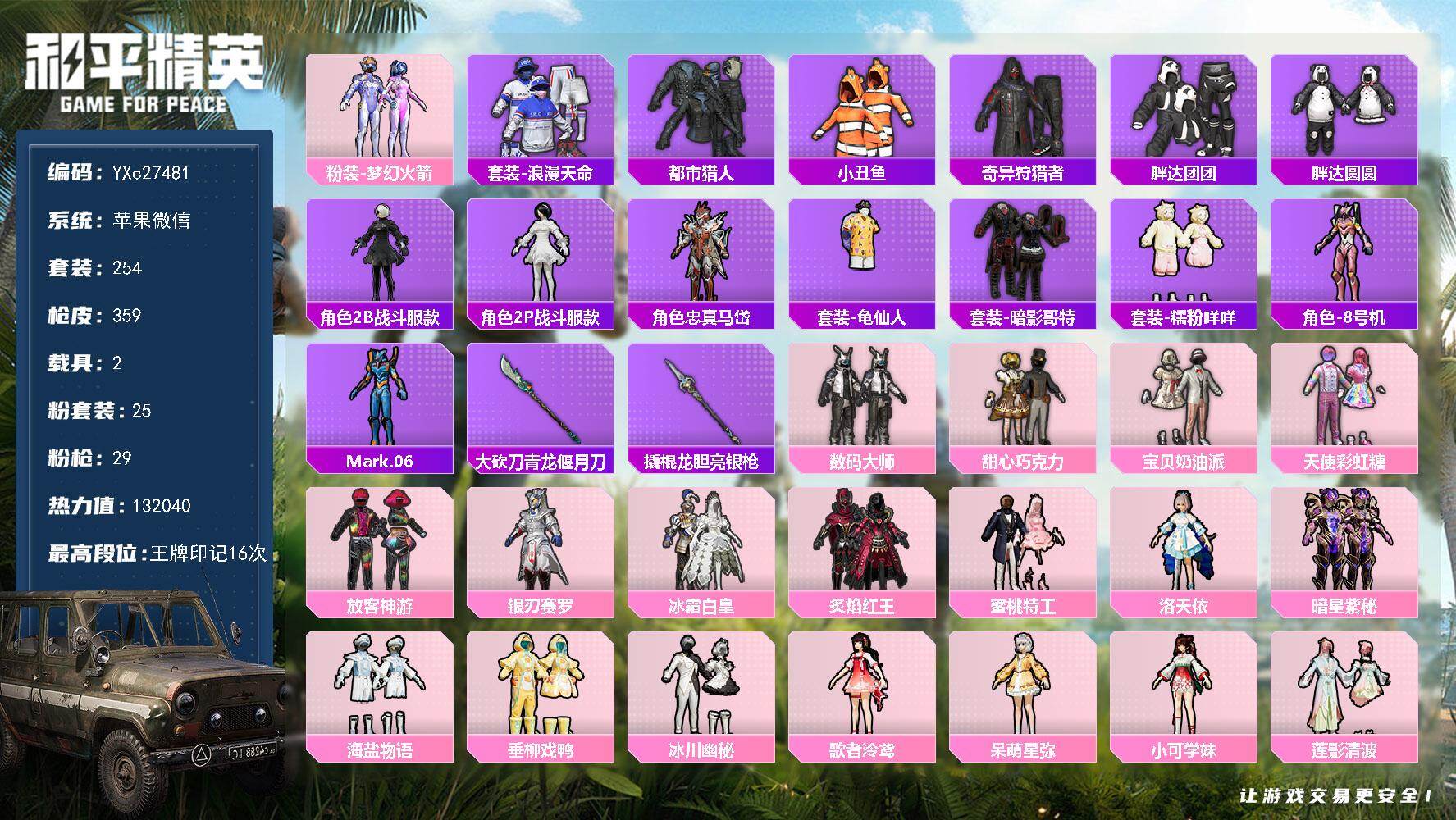 PX_2557218-??,新101,巧克力,放客,3级AUG星梦,粉熊包,满地铁天赋】YXc27481-【无二次】【因赛季更新游戏段付以上号为准!】 ,苹果V-3稀有2载具25粉装30特效枪33热门254套装359枪皮,16印记,历史绝世王牌21星, 【3稀有】,奇异狩猎者,都市猎人,浪漫天命, 【2载具】,护世瑞兽,星梦玉骢, 【25粉装】,觉醒初号机,梦幻火箭,美琪,美雪,狂花道·不知火舞,宝贝奶油派,天使彩虹糖,甜心巧克力,洛天依,星穹咏叹调,创世救赎,呆萌星弥,小可学妹,垂柳戏鸭,放客神游,莲影清波,数码大师,歌者泠鸢,冰川幽秘,冰霜白皇,炙焰红王,银刃赛罗,蜜桃特工,海盐物语,暗星紫秘, 【29特效枪】,M416-五爪金龙,(3级),SCAR-L-金蛇镇世,(1级),SCAR-L-锦绣绵绵,(5级),M416-墨龙九天,(3级),M416-电玩时刻,(5级),AKM-炫紫旋律,(1级),AKM-白勺歌姬,(7级),AKM-绿萝繁花,(5级),Kar98K-巳巳如意,(5级),M762-青锋波束,(5级),DP-28-豹影疾电,(5级),AUG-暖羊咩咩,(5级),AUG-星梦奇缘,(3级),ARX-无垠阁,(4级),蜜獾-异瞳寒姬,(4级),UMP45-量子极限,(5级),Mk14-甜梦熊击,(5级),AMR-鸢尾晶梦,(2级),GROZA-镜光银凌,(4级),GROZA-巴啦啦小魔仙,(7级),UMP45-相思残雪,(7级),M416-暖熊萌萌,(6级),M417-第五大道,(4级),汤姆逊-冰川粉黛,(7级),MG3-洛神天依,(3级),AKS-74U-森灵之息,(5级),ACE32-萌骑漫游,(2级),SCAR-L-青春物语,(5级),破片手榴弹-粉粉猫爪,(6级), 【33热门】,8号机,Mark.06,小丑鱼,龟仙人,2B战斗服款,2P战斗服款,浪漫假日,青涩年华,晶辉守护,小狗蛇点点,糯粉咩咩,鹰眼刺客,软萌银虎,胖达圆圆,胖达团团,TJB战队服,裁决冥王,梦起落英,暗夜契约,暗影哥特,团圆交子,瑞龙福将,纯白誓言,狂沙舞者,漫步者,破蛋小黄鸡,英勇保护者,Kar98K-终极赛罗,AKM-奇异狩猎者,M762-瑞龙福将,M24-奇异狩猎者,S686-奇异狩猎者,M24-香水柠檬, 【5飞行器】,龙翔九天飞行器,梦幻火箭飞行器,幻海精灵飞行器,千面幻镜飞行器,天之羽翼飞行器, 【4头盔】,童趣迷兔头盔,梦幻火箭头盔,甜心宝贝头盔,百万伏特头盔, 【7背包】,银河战甲背包,梦幻火箭背包,甜心宝贝背包,百万伏特背包,萌熊伴侣背包,神秘黑猫背包,甜蜜誓约背包,