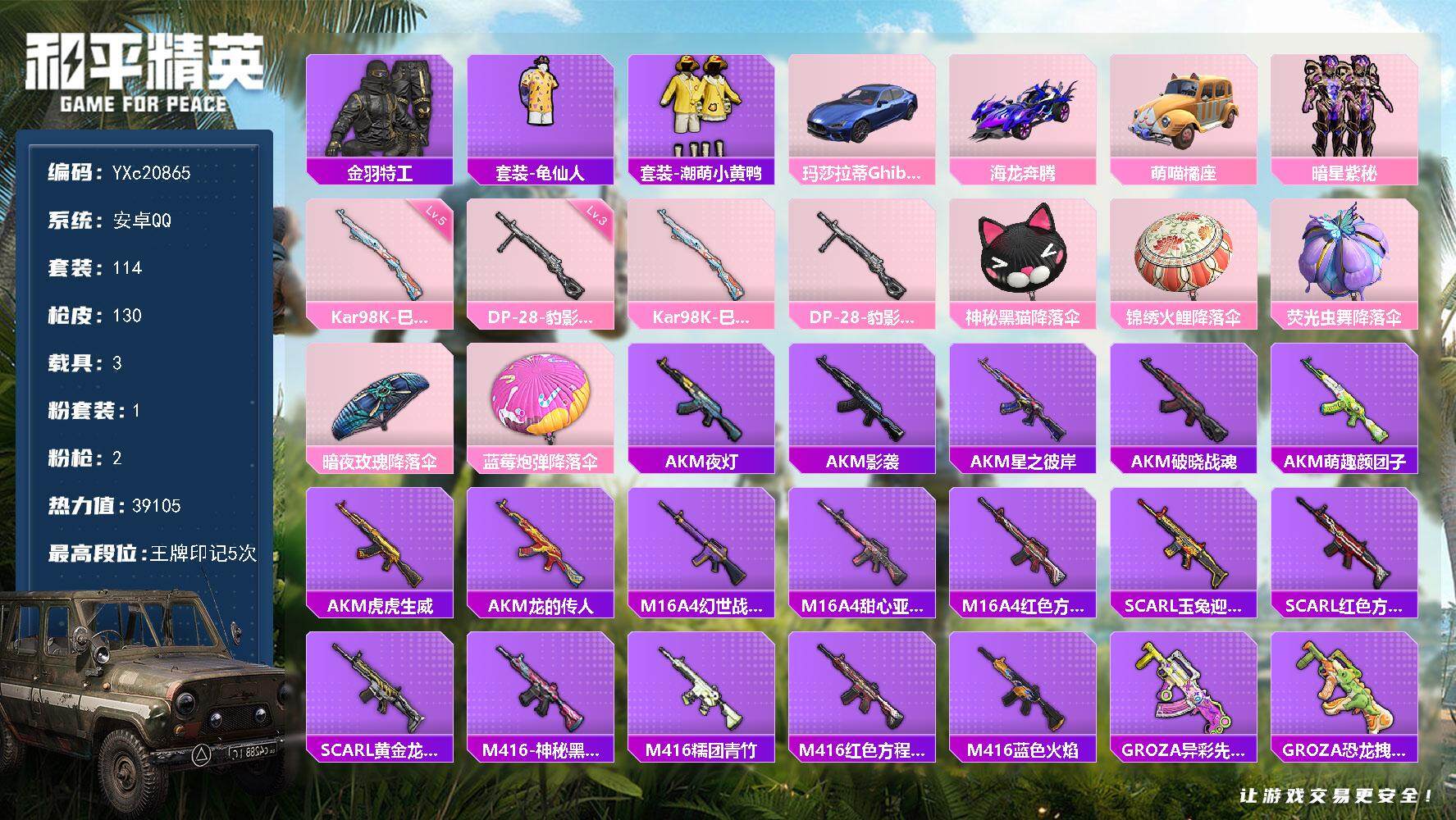 PX_2294337-5-【可二次】【因赛季更新游戏段付以上号为准!】 安卓Q-3载具1粉装2特效枪12热门114套装130枪皮,5印记,历史超级王牌7星, 【3载具】,玛莎拉蒂蓝色,海龙奔腾,萌喵橘座, 【1粉装】,暗星紫秘, 【2特效枪】,Kar98K-巳巳如意,(5级),DP-28-豹影疾电,(3级), 【12热门】,龟仙人,雪山精英,潮萌小黄鸭,呆萌铁蟹,鹰眼刺客,金羽特工,团圆交子,瑞龙福将,漫步者,破蛋小黄鸡,极速红龙,M762-瑞龙福将, 【2背包】,神秘黑猫背包,夏日绵绵冰背包