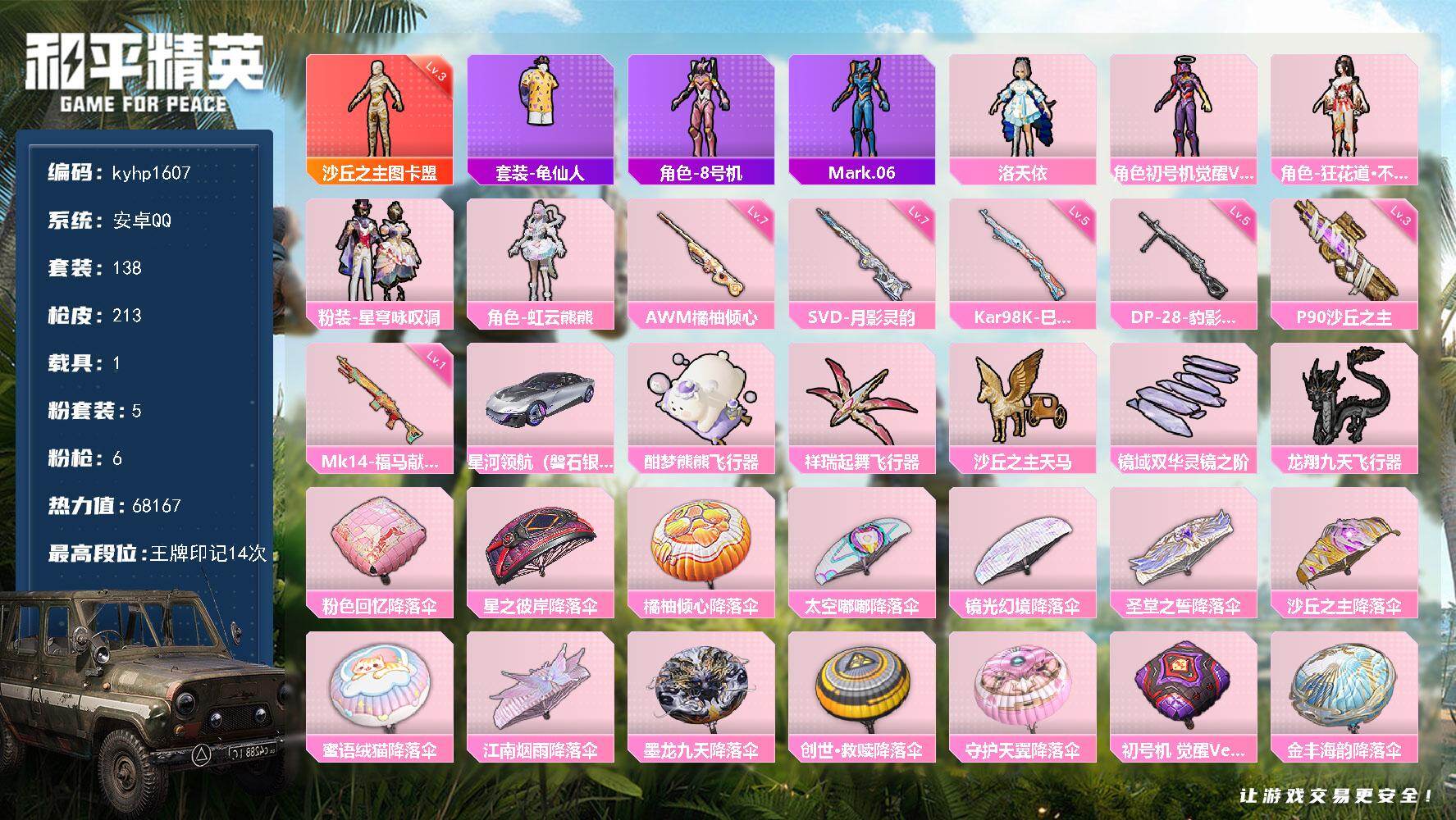PX_2531697-时装数:,108,载具数:,1,枪械数:,186,战备数:,113,热门装扮:,复仇流浪者,海螺星光,幻影飞狐,荧海星豚,载具:,星河领航(磐石银),稀有枪皮:六级SCAR-L-纯梦嫁纱,五级Kar98K-巳巳如意,五级AUG-暖羊咩咩,四级MG3-酷泡奶龙,四级AKM-梦之光华,四级M416-五爪金龙,四级M200-伏羲圣卦,三级SCAR-L-童趣迷兔,三级MK12-雪月幻音,一级DP-28-豹影疾电