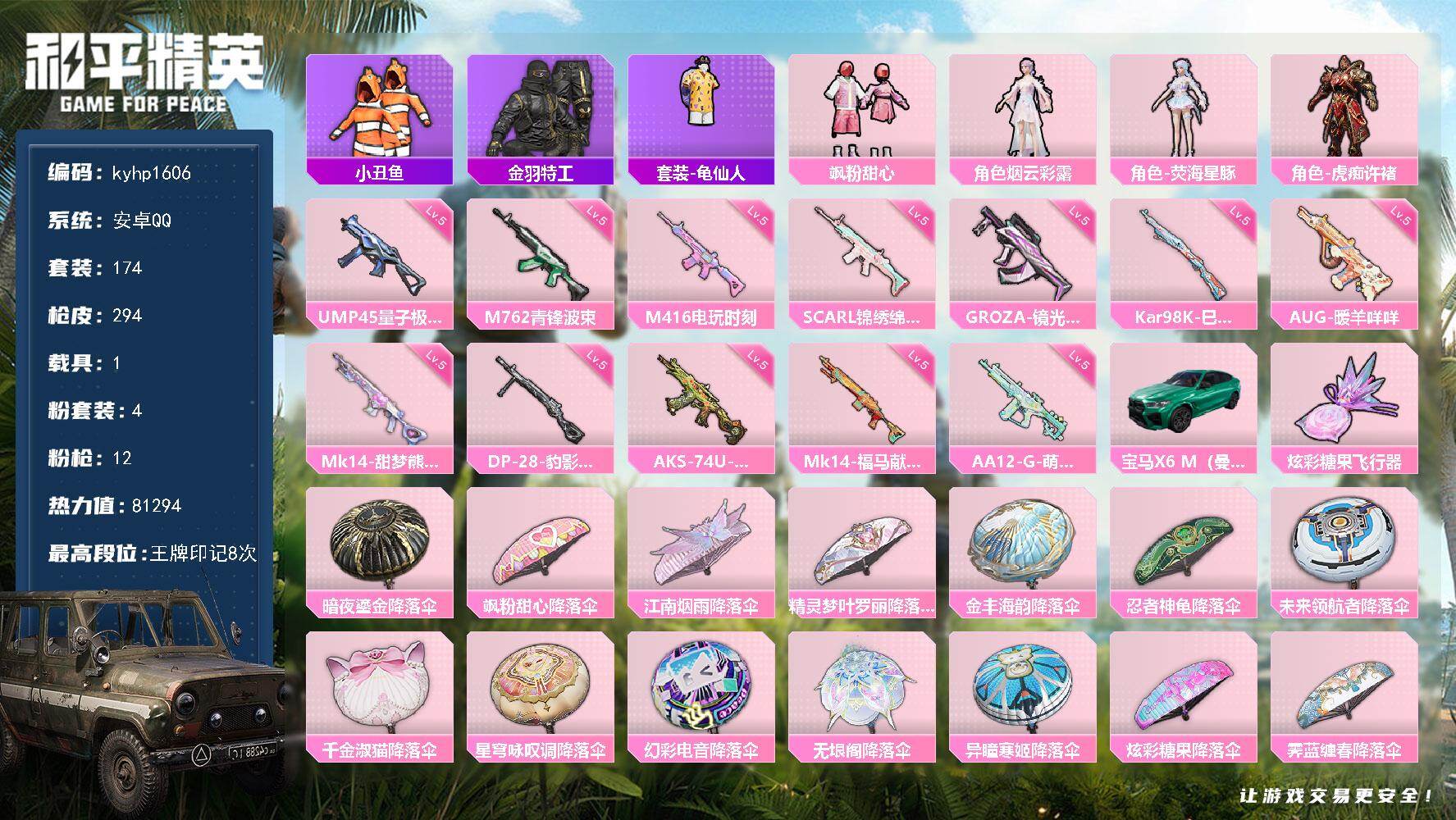 PX_2531699-实名:,可修改,时装数:,88,载具数:,4,枪械数:,117,战备数:,97,热门装扮:,缤纷油彩,新星烈龙,馨动时刻,海盐物语,垂柳戏鸭,旋转彩虹,未来歌姬,载具:,双人摩托-梦幻火箭,海龙奔腾,路特斯ELETRE(冰川蓝),玛莎拉蒂Quattroporte(夜幕蓝),稀有枪皮:四级M16A4-垂柳戏鸭,四级SCAR-L-青春物语,四级AKM-梦之光华,七级M416-心之恋语