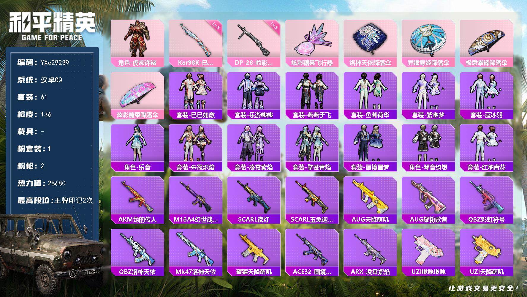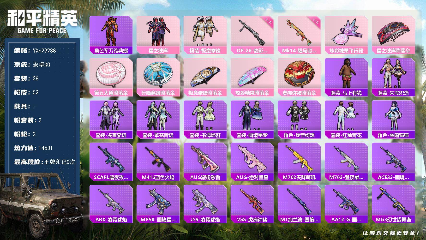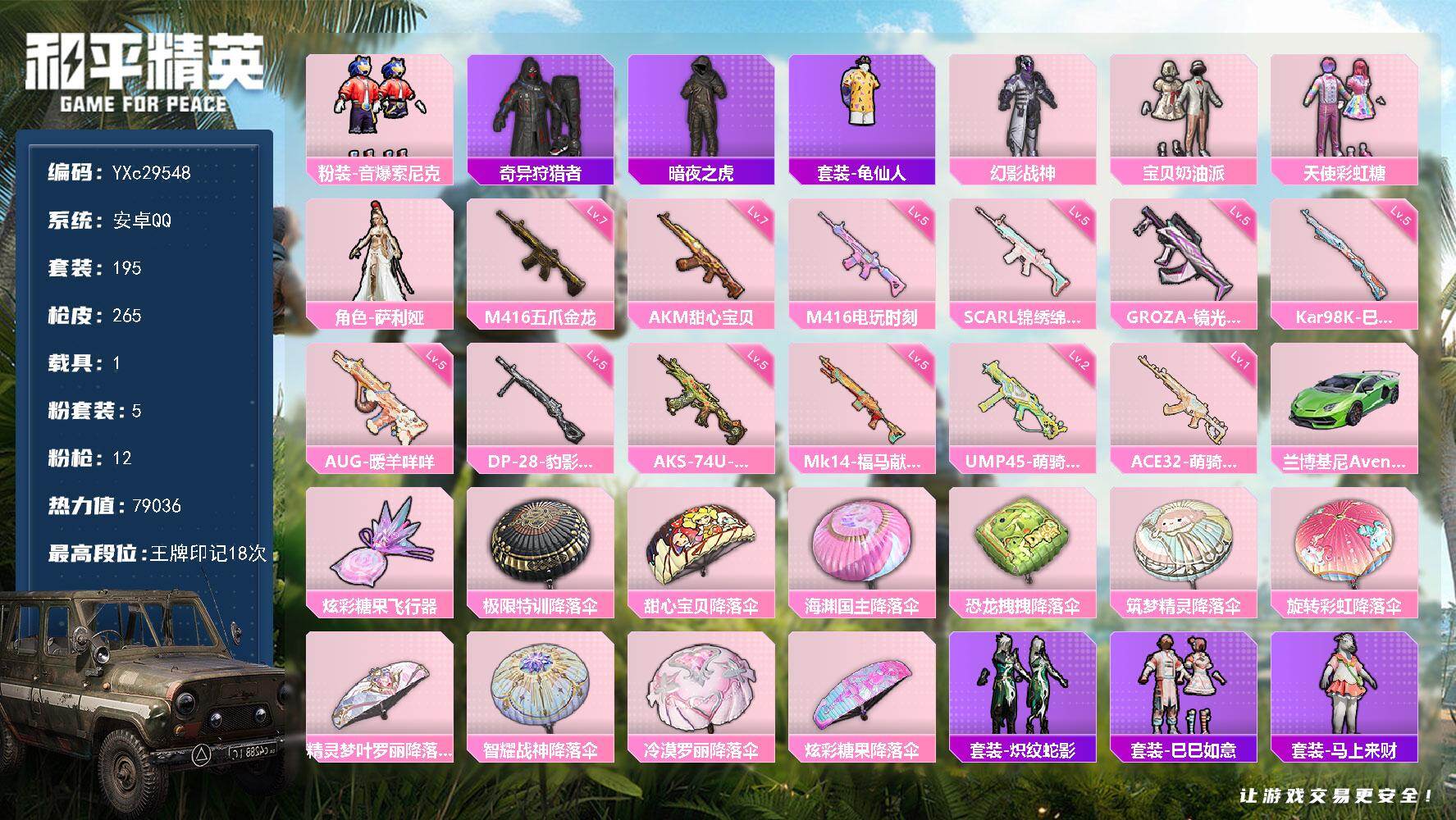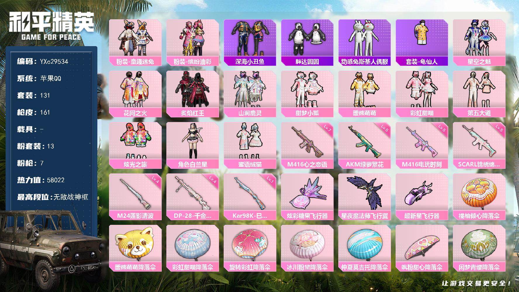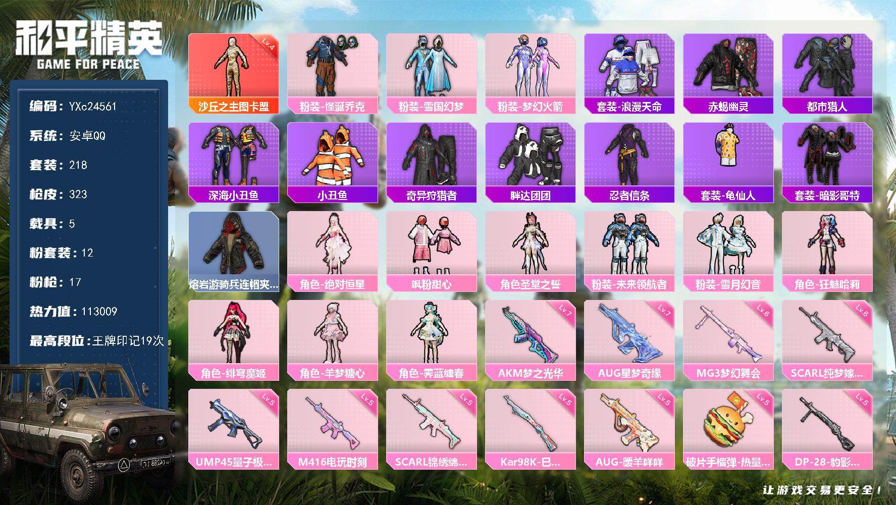 PX_2531704-实名:,可修改,时装数:,117,载具数:,1,枪械数:,151,战备数:,114,热门装扮:,猪猪侠,创世·救赎,异瞳寒姬,载具:,永恒黄蜂,稀有枪皮:,AKM-绿萝繁花(五级),SCAR-L-锦绣绵绵(五级),GROZA-镜光银凌(五级),AUG-暖羊咩咩(五级),UMP45-量子极限(五级),Kar98K-巳巳如意(五级),Mk14-甜梦熊击(五级),DP-28-豹影疾电(五级)