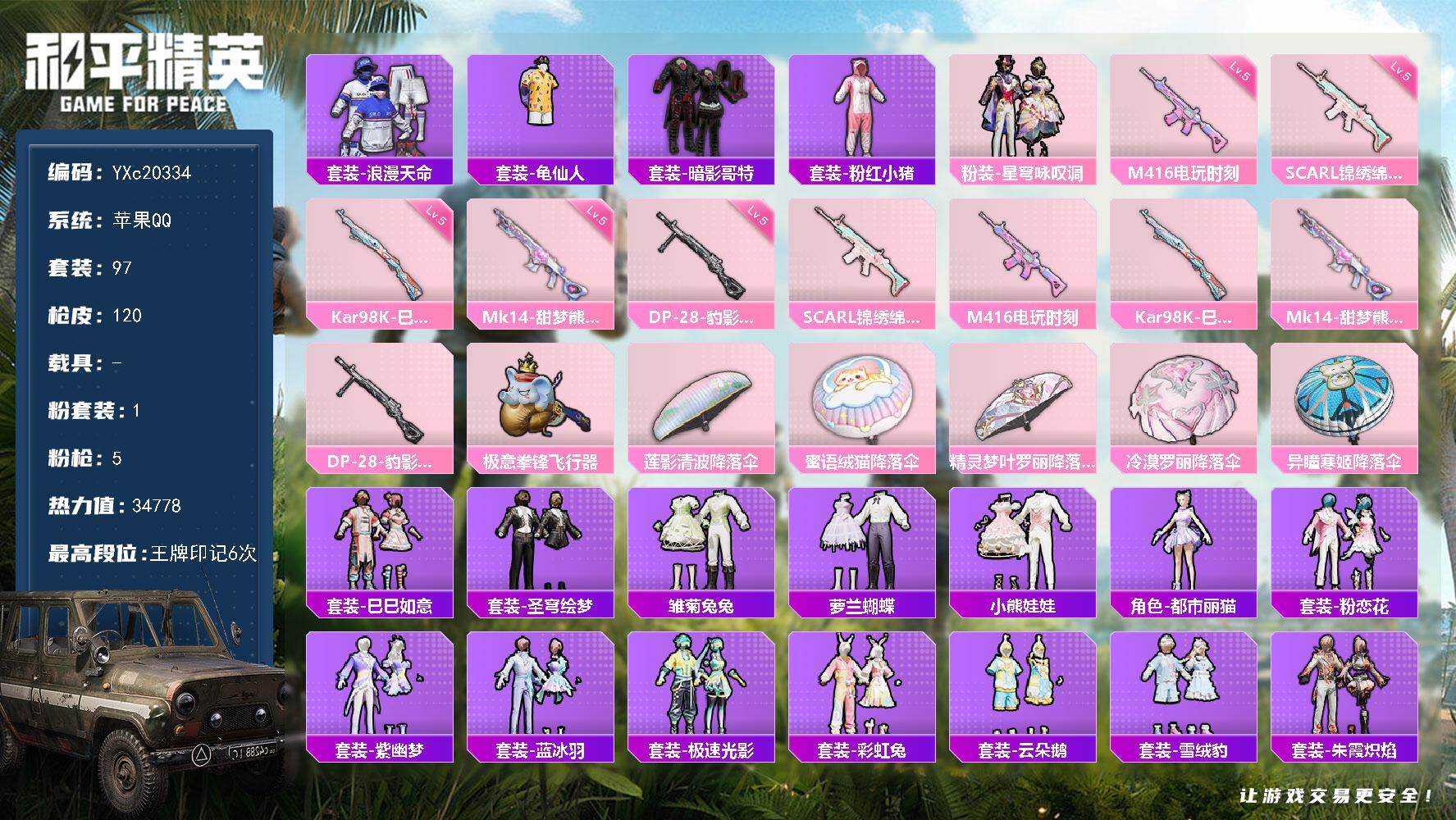PX_2294396-??满天赋】YXc20334-【无二次协助处理】【因赛季更新游戏段付以上号为准!】 苹果Q-1稀有1粉装5特效枪7热门97套装120枪皮,6印记,历史卓越王牌16星, 【1稀有】,浪漫天命, 【1粉装】,星穹咏叹调, 【5特效枪】,SCAR-L-锦绣绵绵,(5级),M416-电玩时刻,(5级),Kar98K-巳巳如意,(5级),DP-28-豹影疾电,(5级),Mk14-甜梦熊击,(5级), 【7热门】,龟仙人,鹰眼刺客,暗影哥特,粉红小猪,漫步者,破蛋小黄鸡,极速红龙