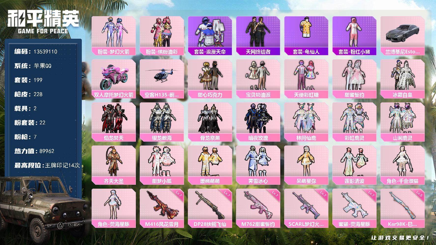 PX_2288012-可二次-苹果Q-2稀有3载具22粉装7特效枪16热门199套装228枪皮,89602热力值,极品公主号,特效枪全满级,甜梦小狐,梦幻火箭,巧克力三姐妹,猪妹,千金淑猫,暖熊萌萌,彩虹鹿灵,呆萌星弥,莲影清波,甜蜜誓约,冰霜白皇,天网,浅蓝色牛仔衬衣,天命,青蛙服,粉团憨憨,灰兰博,蓝僚机,四级包嘟嘟伙伴,满级M416风花雪月,满级斯嘎梦幻火箭,满级M762甜蜜誓约,14印记,历史超级王牌16星,【2稀有】,浪漫天命,天网终结者,【3载具】,兰博轿车灰色,双人摩托梦幻火箭,空客蔚蓝之翼僚机,【22粉装】,梦幻火箭,宝贝奶油派,天使彩虹糖,甜心巧克力,千金淑猫,荧海星豚,呆萌星弥,缤纷油彩,莲影清波,甜蜜誓约,冰霜白皇,暖熊萌萌,霁雪冰心,甜梦小狐,焰龙焚天,骨龙祭渊,银龙傲海,暗夜玫瑰,林间仙鹿,山涧鹿灵,彩虹鹿灵,齐天大圣,【7特效枪】,SCAR-L-梦幻火箭,(7级),Kar98K-巳巳如意,(5级),M762-甜蜜誓约,(7级),DP-28-豹影疾电,(5级),DP-28-扶摇飞仙,(7级),蜜獾-荧海星豚,(6级),M416-风花雪月,(7级),【16热门】,龟仙人,万圣娃娃,暗夜契约,团圆交子,瑞龙福将,纯白誓言,粉红小猪,破蛋小黄鸡,风华少年志,极速红龙,M762-瑞龙福将,M24-香水柠檬,MK47-林间仙鹿,Mini14-林间仙鹿,汤姆逊-林间仙鹿,GROZA-林间仙鹿,【6飞行器】,梦幻火箭飞行器,甜蜜誓约飞行器,齐天大圣飞行器,林间仙鹿飞行器,焰龙焚天飞行器,白勺歌姬飞行器,【3头盔】,梦幻火箭头盔,甜心宝贝头盔,甜蜜誓约头盔,【4背包】,梦幻火箭背包,甜心宝贝背包,深海小丑鱼背包,甜蜜誓约背包,营地ID:785182639