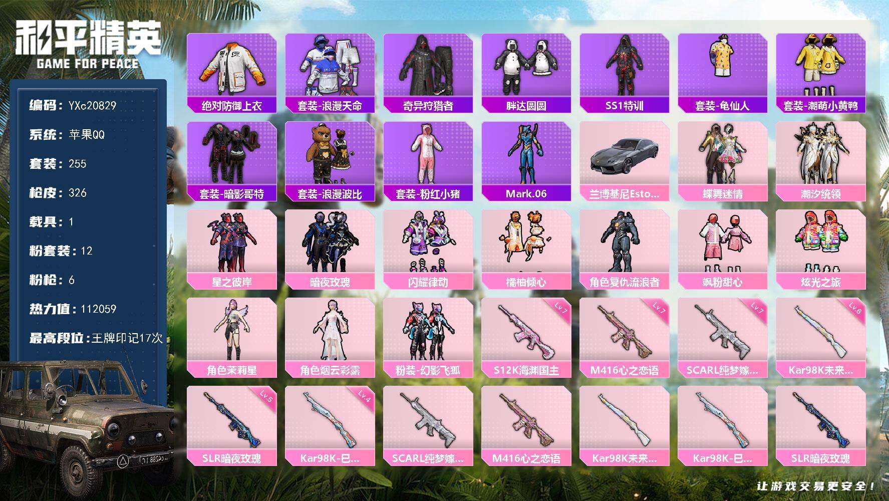 PX_2294404-??侠,巡查衣,蓝螳螂】YXc20829-【可二次】【因赛季更新游戏段付以上号为准!】 苹果Q-3稀有1载具12粉装6特效枪33热门255套装326枪皮,17印记,历史传奇王牌14星, 【3稀有】,奇异狩猎者,巡查衣,浪漫天命, 【1载具】,兰博轿车灰色, 【12粉装】,蝶舞迷情,茉莉星,烟云彩露,炫光之旅,飒粉甜心,幻影飞狐,橘柚倾心,闪耀律动,潮汐统领,星之彼岸,暗夜玫瑰,复仇流浪者, 【6特效枪】,SCAR-L-纯梦嫁纱,(7级),M416-心之恋语,(7级),Kar98K-巳巳如意,(4级),SLR-暗夜玫瑰,(5级),Kar98K-未来歌姬,(6级),S12K-海渊国主,(7级), 【33热门】,Mark.06,龟仙人,雪山精英,潮萌小黄鸭,梦魇先生,万圣娃娃,软萌银虎,激萌罗小黑,迅捷狂鲨,浪漫波比,胖达圆圆,怪笑疯兔,暗影哥特,SS1特训,团圆交子,瑞龙福将,粉红小猪,漫步者,冰爽海盐,抹茶蜜豆,朱雀圣者,静谧青瓷,机械英豪,破蛋小黄鸡,风华少年志,白月香洋装,黑色刀锋,英勇保护者,M416-魔法学院,AKM-奇异狩猎者,M762-瑞龙福将,S686-奇异狩猎者,GROZA-林间仙鹿, 【2飞行器】,深渊漩涡飞行器,拂晓神骑飞行器, 【1头盔】,百万伏特头盔, 【3背包】,神秘黑猫背包,古堡领主背包,心之恋语背包