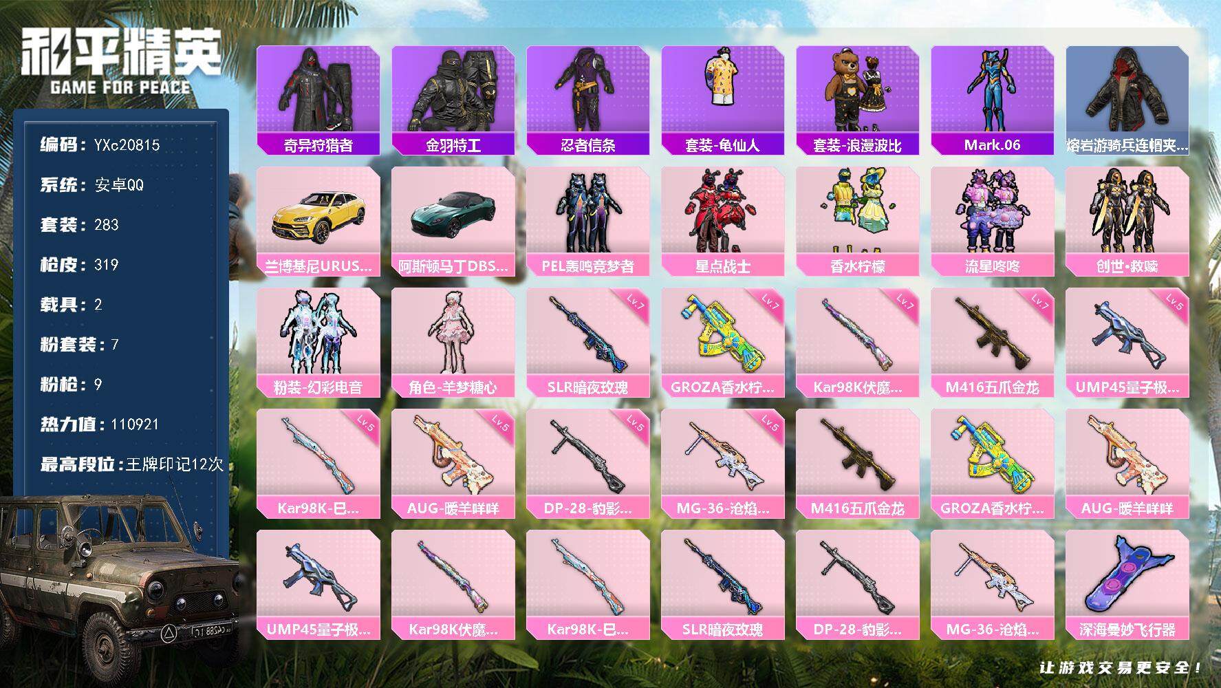 PX_2294410-??侠,满级五爪,蓝螳螂,地铁满天赋】YXc20815-【无二次协助处理】【因赛季更新游戏段付以上号为准!】 ,安卓Q-1稀有2载具7粉装9特效枪28热门283套装319枪皮12印记,历史绝世王牌28星, 【1稀有】,奇异狩猎者, 【2载具】,兰博SUV黄色,阿斯顿马丁S绿色, 【7粉装】,羊梦糖心,创世救赎,幻彩电音,PEL轰鸣竞梦者,星点战士,香水柠檬,流星咚咚, 【9特效枪】,M416-五爪金龙,(7级),Kar98K-巳巳如意,(5级),Kar98K-伏魔团,(7级),MG-36-沧焰双生,(5级),DP-28-豹影疾电,(5级),AUG-暖羊咩咩,(5级),UMP45-量子极限,(5级),GROZA-香水柠檬,(7级),SLR-暗夜玫瑰,(7级), 【28热门】,Mark.06,龟仙人,太空漫步,雪山精英,浪漫波比,金羽特工,童话森林,梦起落英,神秘黑猫,暗夜契约,醒狮腾龙,团圆交子,瑞龙福将,忍者信条,冰爽海盐,朱雀圣者,海洋之心,破蛋小黄鸡,风华少年志,白月香洋装,英勇保护者,M416-仓鼠灰灰,AKM-奇异狩猎者,M762-奇异狩猎者,M762-瑞龙福将,M24-奇异狩猎者,S686-奇异狩猎者,M24-香水柠檬, 【1飞行器】,深海曼妙飞行器, 【6头盔】,九霄头盔,精灵迷巫头盔,梦幻火箭头盔,深海小丑鱼头盔,心之恋语头盔,夏日绵绵冰头盔, 【4背包】,九霄背包,梦幻火箭背包,深海曼妙背包,神秘黑猫背包,