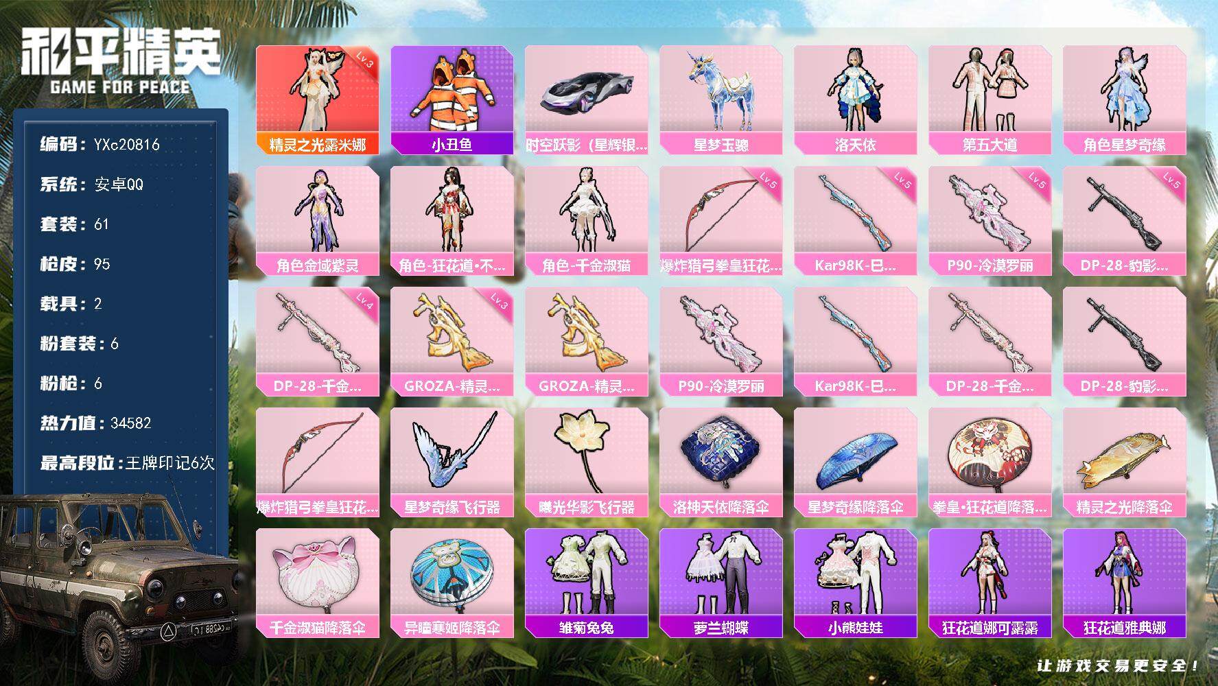 PX_2294409-红,露米娜,公主号】YXc20816-【无二次协助处理】【因赛季更新游戏段付以上号为准!】 ,安卓Q-1红装2载具6粉装6特效枪3热门61套装95枪皮,,6印记,历史卓越王牌13星, 【1红装】,精灵之光-露米娜,(3级), 【2载具】,时空跃影(星辉银),星梦玉骢, 【6粉装】,狂花道·不知火舞,千金淑猫,洛天依,金域紫灵,星梦奇缘,第五大道, 【6特效枪】,P90-冷漠罗丽,(5级),Kar98K-巳巳如意,(5级),DP-28-千金淑猫,(4级),DP-28-豹影疾电,(5级),GROZA-精灵之光,(3级),爆炸猎弓-拳皇·狂花道,(5级), 【3热门】,小丑鱼,破蛋小黄鸡,极速红龙