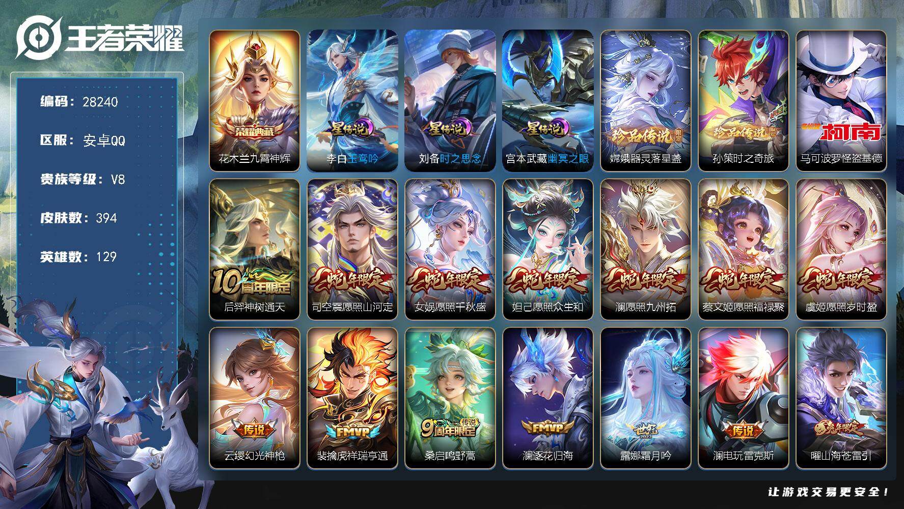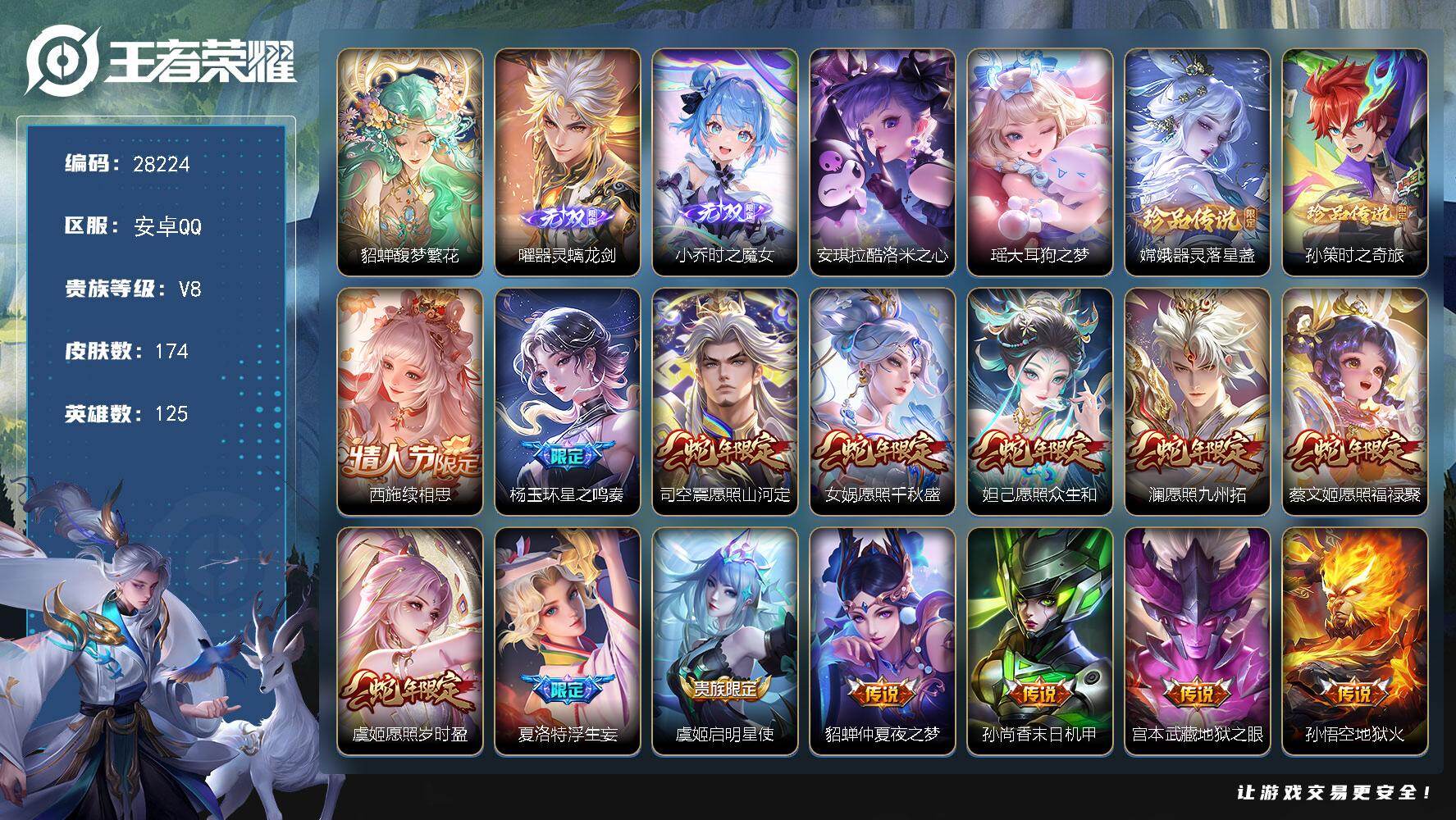 PX_2553465-可换绑【精品推荐·蛇年全套·珍品马可嫦娥孙策·李逍遥·时雨天司·白虎志·凤求凰·敖雪梅枪·神威·如梦令·朱雀志】,5456星币,幸运值213,17按键,3星传说,8王者印记,满级铭文,无二次安卓Q-V8-394皮肤-1典藏皮肤-3珍品传说-29传说-121史诗【英雄全皮】:扁鹊全皮,孙权全皮,刘备全皮,苍全皮,鬼谷子全皮,澜全皮,司空震全皮,赵怀真全皮,戈娅全皮,空空儿全皮,海诺全皮【荣耀典藏】:花木兰九霄神辉【珍品传说】:嫦娥器灵落星盏,孙策时之奇旅,马可波罗怪盗基德【星元皮肤】:宫本武藏幽冥之眼,刘备时之思念,李白玉鸾吟【传说皮肤】:后羿神树通天,司空震愿照山河定,女娲愿照千秋盛,妲己愿照众生和,澜愿照九州拓,蔡文姬愿照福禄聚,虞姬愿照岁时盈,云缨幻光神枪,裴擒虎祥瑞亨通,桑启鸣野蒿,澜逐花归海,露娜霜月吟,澜电玩雷克斯,曜山海苍雷引,马超无双飞将,蔡文姬花朝如约,西施游龙清影,曜李逍遥,,诸葛亮时雨天司,镜炽阳神光,虞姬启明星使,刘备时之恋人,貂蝉猫影幻舞,干将莫邪久胜战神,达摩黄金狮子座,百里玄策白虎志,梦奇胖达荣荣,李白凤求凰,宫本武藏地狱之眼【限定皮肤】:白起狰,狄仁杰阴阳师,赵云皇家上将,赵云引擎之心,孙尚香蔷薇恋人,庄周高山流水,高渐离玩趣恶龙,阿轲迷踪丽影,扁鹊炼金王,扁鹊奇幻香踪,芈月重明,芈月幻夜卜梦,吕布猎兽之王,周瑜赤莲之焰,元歌云间偶戏,元歌无心,夏侯惇朔风刀,甄姬游园惊梦,曹操烛龙,典韦穷奇,典韦岱宗,狄仁杰魔术师,狄仁杰万华元夜,达摩沙漠行僧,项羽海滩派对,老夫子醍醐杖,程咬金演武夺筹,韩信傲雪梅枪,兰陵王驯魔猎人,兰陵王金庭之子,花木兰青春决赛季,花木兰默契交锋,孙悟空至尊宝,孙悟空孙行者,牛魔御旌,后羿如梦令,刘备百相守梦,李元芳银河之约,李元芳云中旅人,虞姬启明星使,钟馗驱傩正仪,杨玉环遇见飞天,杨戬潮玩骑兵,干将莫邪胡桃夹子,雅典娜单词大作战,蔡文姬繁星吟游,太乙真人饕餮,鬼谷子原初探秘者,鬼谷子五谷丰年,诸葛亮时雨天司,黄忠火炮绅士,苏烈千军破阵,百里玄策白虎志,百里守约朱雀志,弈星混沌棋,公孙离玉兔公主,沈梦溪星空之诺,沈梦溪大漠名商,明世隐疑决卦,裴擒虎李小龙,裴擒虎擒涛扼浪,狂铁御狮,米莱狄御霄,云中君纤云弄巧,盾山御銮,猪八戒猪悟能,上官婉儿梁祝,嫦娥拒霜思,嫦娥暖冬兔眠,曜李逍遥,,曜山海苍雷引,西施玲珑珍味,鲁班大师探海日志,镜匿光追影者,桑启海盐诗旅,暃星界游侠,戈娅驭风魔法,艾琳流音漫舞,赵怀真鹤归松栖,司空震地狱燃心,阿古朵江河有灵,张良古海寻踪,蒙犽百解令,高渐离燃音魔法,妲己灵卜魔法,鬼谷子天穹祈灯,沈梦溪龙舞盛年,鲁班七号蔬乡物语,李元芳蔬乡物语,刘邦剑破天穹,上官婉儿群星魔术团,程咬金群星魔术团,关羽决胜骁骑,镜青焰无极,项羽苍威无极,海诺心动手记,刘备异域游侠,芈月浮光幕影【年限皮肤】:李白凤求凰,百里玄策白虎志,百里守约朱雀志,典韦岱宗,诸葛亮时雨天司,曜山海苍雷引,司空震愿照山河定,女娲愿照千秋盛,妲己愿照众生和,澜愿照九州拓,蔡文姬愿照福禄聚,虞姬愿照岁时盈【赛季限定】:扁鹊炼金王,白起狰,太乙真人饕餮,曹操烛龙,芈月重明,典韦穷奇,狂铁御狮,米莱狄御霄,牛魔御旌,盾山御銮,夏侯惇朔风刀,弈星混沌棋,明世隐疑决卦,老夫子醍醐杖,鬼谷子原初探秘者,狄仁杰万华元夜,程咬金演武夺筹,钟馗驱傩正仪,苏烈千军破阵,达摩沙漠行僧,兰陵王金庭之子,沈梦溪大漠名商,李元芳云中旅人,桑启海盐诗旅,裴擒虎擒涛扼浪,鲁班大师探海日志,张良古海寻踪,鬼谷子天穹祈灯,刘邦剑破天穹,太乙真人谧流熔炉,钟馗虚灵犬护,甄姬逆浪荇歌,亚瑟荣光之誓,项羽九幽镇关【战令限定】:吕布猎兽之王,兰陵王驯魔猎人,周瑜赤莲之焰,李元芳银河之约,沈梦溪星空之诺,阿轲迷踪丽影,雅典娜单词大作战,元歌云间偶戏,黄忠火炮绅士,芈月幻夜卜梦,暃星界游侠,嫦娥暖冬兔眠,扁鹊奇幻香踪,杨戬潮玩骑兵,戈娅驭风魔法,西施玲珑珍味,司空震地狱燃心,艾琳流音漫舞,高渐离燃音魔法,妲己灵卜魔法,鲁班七号蔬乡物语,李元芳蔬乡物语,镜青焰无极,项羽苍威无极,亚连破空之剑,廉颇撼地雄心,孙悟空神迹守卫,百里守约百相守梦,老夫子百相守梦,孙膑茶境仙,马超访茗客,周瑜线条小狗,小乔线条小狗【史诗皮肤】:周瑜线条小狗,小乔线条小狗,项羽九幽镇关,女娲万灵启世,百里玄策罗小黑战记,公孙离涂山容容,西施织梦人,黄忠百相守梦,后羿石田雨龙,扁鹊灵蛊蚀心,狂铁龙之律动,阿轲化蝶舞,苍狼魂孤将,亚连糖绘人间,赵怀真器灵浮梦炉,姬小满飞车小橘子,孙膑茶境仙,百里守约百相守梦,马可波罗星界特工,亚连破空之剑,廉颇撼地雄心,芈月浮光幕影,黄忠怒海争锋,海诺心动手记,关羽决胜骁骑,镜青焰无极,上官婉儿群星魔术团,鲁班七号蔬乡物语,高渐离燃音魔法,妲己灵卜魔法,蒙犽百解令,阿古朵江河有灵,司空震地狱燃心,赵怀真鹤归松栖,戈娅驭风魔法,刘禅电玩爆裂旋风,刘备百相守梦,扁鹊奇幻香踪,暃星界游侠,元歌无心,鬼谷子五谷丰年,澜赏金猎手,公孙离玉兔公主,夏洛特永昼,哪吒雪上飞焰,韩信傲雪梅枪,黄忠火炮绅士,镜匿光追影者,嫦娥拒霜思,司马懿暗渊魔法,庄周高山流水,猪八戒猪悟能,孙悟空孙行者,钟馗乐园奇幻夜,沈梦溪月团寄思,杨戬天秀启明,花木兰默契交锋,元歌云间偶戏,云中君纤云弄巧,裴擒