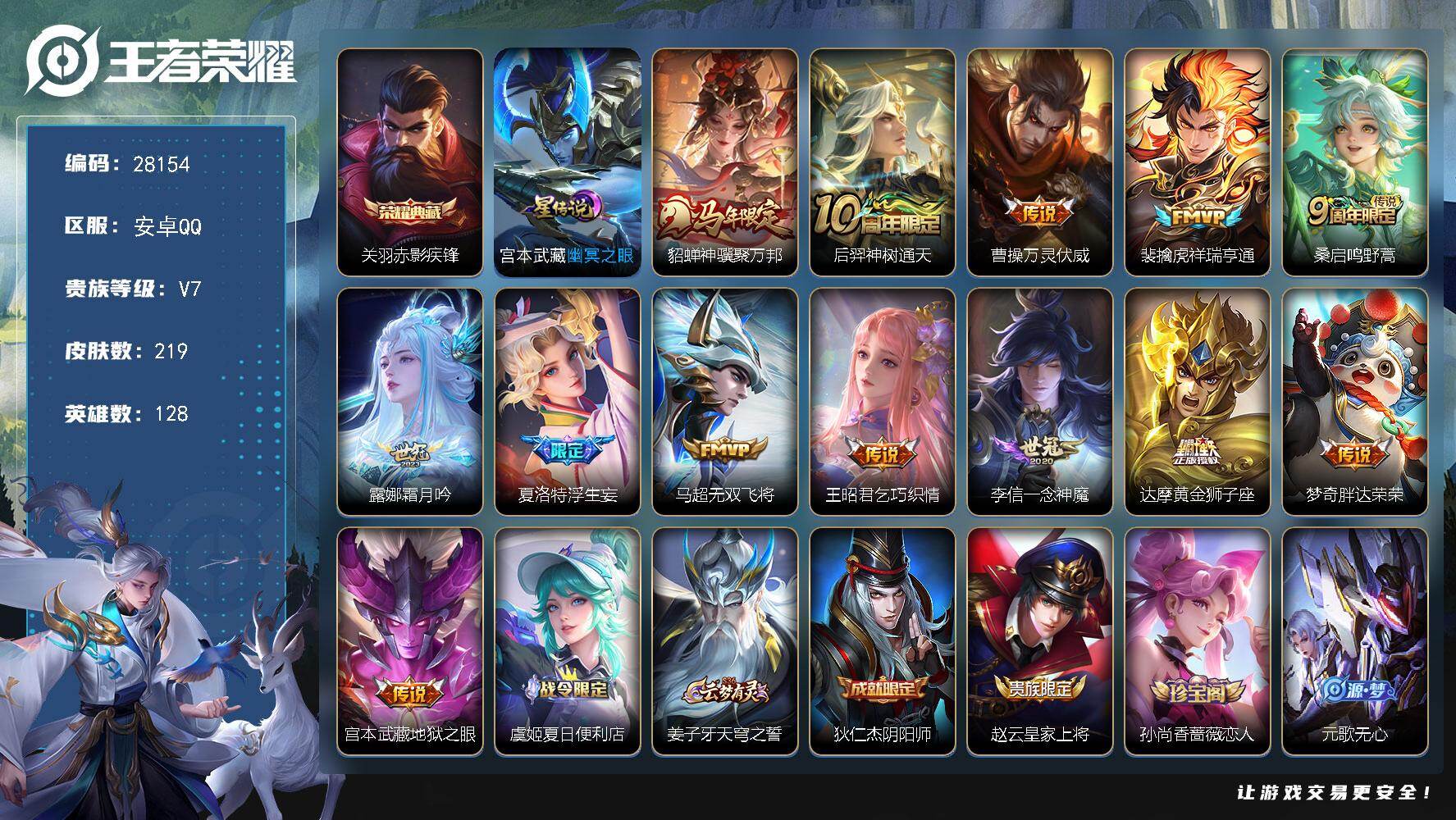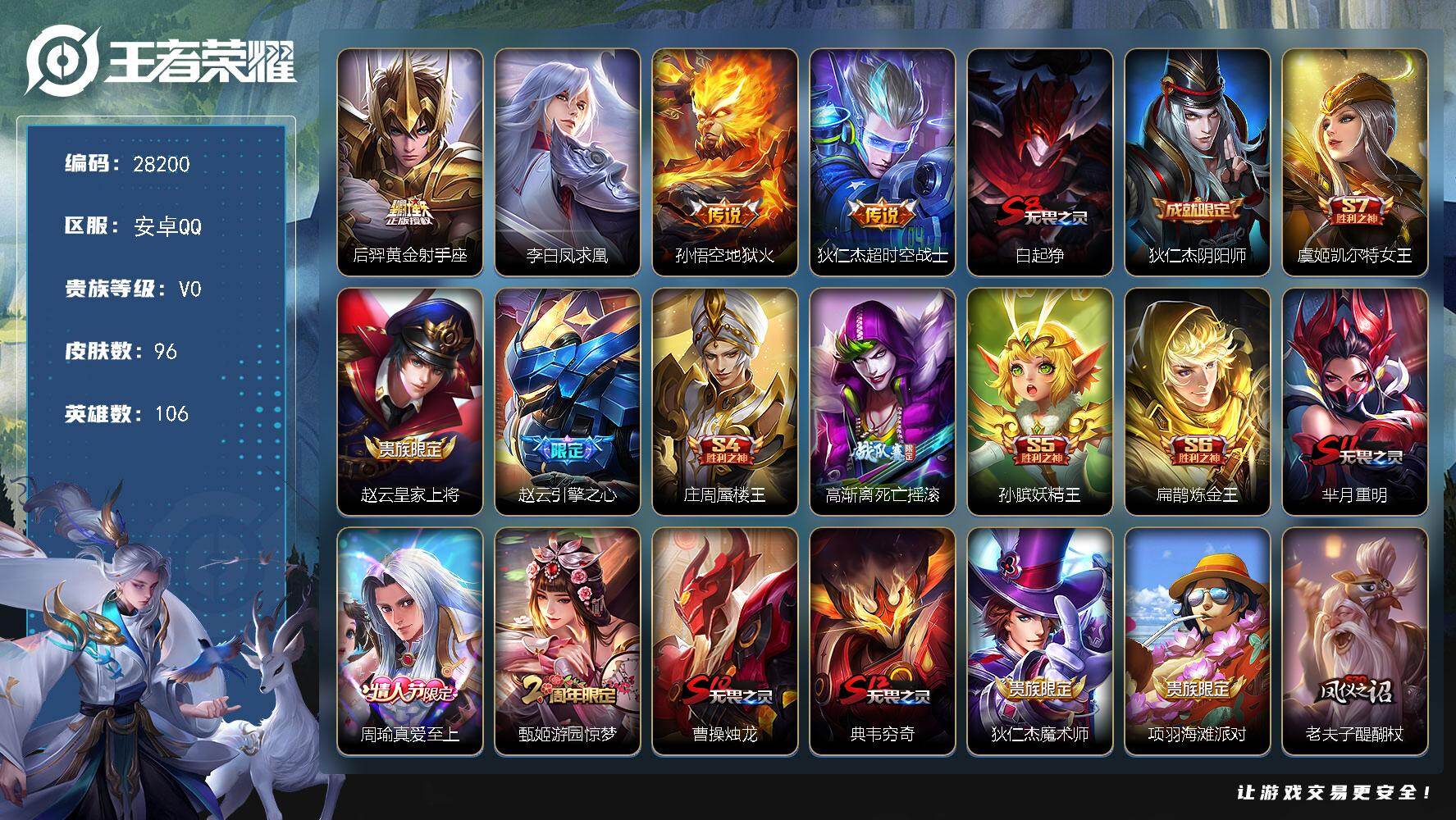 PX_2546961-可换绑【精品小号推荐·凤求凰·引擎之心·至尊宝】,1按键,1王者印记,140五级铭文,无二次安卓Q-V7-96皮肤-4传说-19史诗【传说皮肤】:后羿黄金射手座,李白凤求凰,孙悟空地狱火,狄仁杰超时空战【限定皮肤】:白起狰,狄仁杰阴阳师,虞姬凯尔特女王,赵云皇家上将,赵云引擎之心,庄周蜃楼王,高渐离死亡摇滚,孙膑妖精王,扁鹊炼金王,芈月重明,周瑜真爱至上,甄姬游园惊梦,曹操烛龙,典韦穷奇,狄仁杰魔术师,项羽海滩派对,老夫子醍醐杖,亚瑟狮心王,孙悟空至尊宝,太乙真人饕餮,明世隐疑决卦,狂铁御狮,米莱狄御霄【年限皮肤】:李白凤求凰【赛季限定】:亚瑟狮心王,庄周蜃楼王,孙膑妖精王,扁鹊炼金王,虞姬凯尔特女王,白起狰,太乙真人饕餮,曹操烛龙,芈月重明,典韦穷奇,狂铁御狮,米莱狄御霄,明世隐疑决卦,老夫子醍醐杖,钟馗虚灵犬护【战令限定】:周瑜线条小狗【史诗皮肤】:周瑜线条小狗,狂铁龙之律动,孙策猫狗日记,甄姬游园惊梦,诸葛亮黄金分割率,兰陵王暗隐猎兽者,花木兰水晶猎龙者,赵云引擎之心,孙悟空至尊宝,韩信白龙吟,吕布末日机甲,李白千年之狐,曹操幽灵船长,周瑜真爱至上,刘禅绅士熊喵,妲己魅力维加斯,狄仁杰魔术师,甄姬冰雪圆舞曲,赵云皇家上将,露娜紫霞仙子【其他皮肤】:影百相守梦,蚩奼极光幻客,阿古朵布丁狗之约,张良灵野札记,钟馗虚灵犬护,马可波罗潮玩牛仔,老夫子醍醐杖,明世隐疑决卦,哪吒次元突破,明世隐虹云星官,米莱狄御霄,狂铁御狮,诸葛亮掌控之力,典韦穷奇,孙尚香沉稳之力,老夫子功夫老勺,芈月重明,曹操烛龙,太乙真人饕餮,钟无艳海滩丽影,白起狰,墨子进击墨子号,虞姬凯尔特女王,扁鹊炼金王,李元芳黑猫爱糖果,孙膑妖精王,高渐离死亡摇滚,刘备纽约教父,庄周蜃楼王,狄仁杰阴阳师,宫本武藏万象初新,亚瑟狮心王,张飞五福同心,达摩拳王,亚瑟死亡骑士,妲己少女阿狸,姜子牙时尚教父,扁鹊救世之瞳,扁鹊化身博士,程咬金星际陆战队,芈月红桃皇后,赵云白执事,阿轲爱心护理,阿轲致命风华,露娜哥特玫瑰,韩信街头霸王,韩信教廷特使,项羽海滩派对,马超幸存者,上官婉儿修竹墨客,李信灼热之刃,元歌午夜歌剧院,杨玉环霓裳曲,明世隐占星师,苏烈爱与和平,百里玄策威尼斯狂欢,铠龙域领主,东皇太一东海龙王,诸葛亮星航指挥官,太乙真人圆桌骑士,杨戬埃及法老,马可波罗激情绿茵,关羽天启骑士,兰陵王隐刃,妲己仙境爱丽丝,孙悟空西部大镖客,老夫子潮流仙人,花木兰剑舞者,貂蝉异域舞娘,露娜绯红之刃,高渐离金属狂潮,鲁班七号福禄兄弟