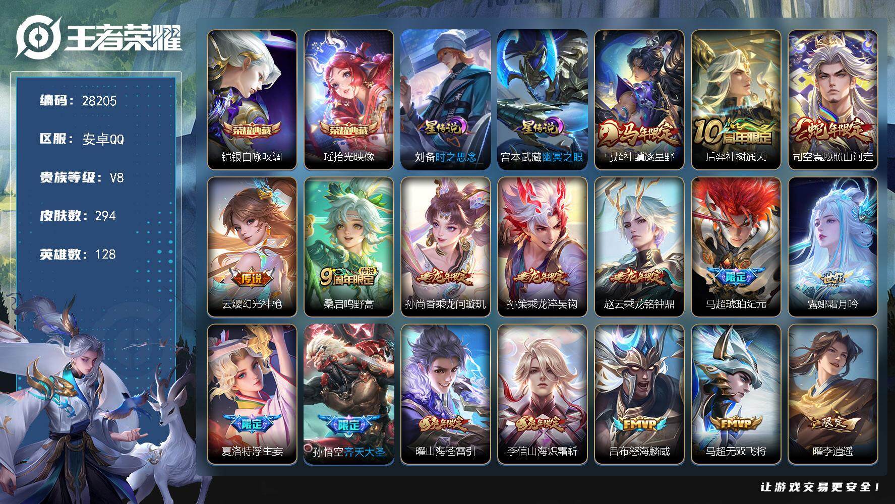 PX_2546492-可换绑,【高质量精品号·马超全皮·典藏瑶铠·典藏小兵马上有钱·龙限全套·李逍遥·年薪李信曜·齐天大圣·浮生妄·白虎志·武陵仙君·孙行者·神威·飞衡·】9按键,2星传说,1天幕,1小兵,8王者印记,五级铭文240,无二次,安卓Q-V8-294皮肤-2典藏皮肤-28传说-99史诗【英雄全皮】:孙权全皮,马超全皮,敖隐全皮,夏洛特全皮,司空震全皮,金蝉全皮,戈娅全皮【荣耀典藏】:铠银白咏叹调,瑶拾光映像【星元皮肤】:刘备时之思念,宫本武藏幽冥之眼【天幕】:路在脚下天幕【小兵皮肤】:小兵马上有钱【传说皮肤】:马超神骥逐星野,后羿神树通天,司空震愿照山河定,云缨幻光神枪,桑启鸣野蒿,孙尚香乘龙问璇玑,孙策乘龙淬吴钩,赵云乘龙铭钟鼎,马超琥珀纪元,露娜霜月吟,夏洛特浮生妄,孙悟空齐天大圣,曜山海苍雷引,李信山海炽霜斩,吕布怒海麟威,马超无双飞将,曜李逍遥,,虞姬启明星使,曜云鹰飞将,李信一念神魔,刘备时之恋人,干将莫邪久胜战神,达摩黄金狮子座,百里玄策白虎志,花木兰冠军飞将,梦奇胖达荣荣,诸葛亮武陵仙君,宫本武藏地狱之眼【限定皮肤】:蒙犽顽岩魄,蔡文姬夏日便利店,虞姬夏日便利店,姜子牙天穹之誓,杨戬破阵退雄兵,狄仁杰阴阳师,赵云皇家上将,嬴政优雅恋人,钟无艳超时空战士,元歌无心,甄姬落雪兰心,马可波罗山海玄木吟,狄仁杰魔术师,达摩沙漠行僧,项羽海滩派对,老夫子醍醐杖,关羽冰锋战神,韩信飞衡,王昭君午后时光,兰陵王金庭之子,花木兰瑞麟志,孙悟空孙行者,孙悟空齐天大圣,李元芳云中旅人,虞姬启明星使,钟馗驱傩正仪,杨戬潮玩骑兵,蔡文姬繁星吟游,鬼谷子五谷丰年,诸葛亮武陵仙君,黄忠烈魂,苏烈玄武志,百里玄策白虎志,百里守约朱雀志,梦奇顽趣,沈梦溪大漠名商,裴擒虎擒涛扼浪,狂铁电玩高手,李信山海炽霜斩,上官婉儿神器万象笔,嫦娥暖冬兔眠,曜李逍遥,,曜山海苍雷引,西施玲珑珍味,鲁班大师探海日志,桑启海盐诗旅,夏洛特浮生妄,金蝉唐三藏,暃星界游侠,戈娅驭风魔法,艾琳流音漫舞,司空震地狱燃心,张良古海寻踪,蒙恬荣光圣徽,高渐离燃音魔法,妲己灵卜魔法,鬼谷子天穹祈灯,马超琥珀纪元,姬小满妄想食味,大乔乘龙忆丹青,安琪拉乘龙聚宝船,孙尚香乘龙问璇玑,孙策乘龙淬吴钩,赵云乘龙铭钟鼎,鲁班七号蔬乡物语,李元芳蔬乡物语,刘邦剑破天穹,程咬金群星魔术团,镜青焰无极,项羽苍威无极,芈月浮光幕影,周瑜熔金海岸 【年限皮肤】:花木兰瑞麟志,苏烈玄武志,百里玄策白虎志,百里守约朱雀志,韩信飞衡,曜山海苍雷引,李信山海炽霜斩,马可波罗山海玄木吟,孙尚香乘龙问璇玑,孙策乘龙淬吴钩,赵云乘龙铭钟鼎,大乔乘龙忆丹青,安琪拉乘龙聚宝船,司空震愿照山河定 【赛季限定】:老夫子醍醐杖,钟馗驱傩正仪,达摩沙漠行僧,兰陵王金庭之子,沈梦溪大漠名商,李元芳云中旅人,桑启海盐诗旅,裴擒虎擒涛扼浪,鲁班大师探海日志,张良古海寻踪,鬼谷子天穹祈灯,刘邦剑破天穹,姜子牙天穹之誓,东皇太一噬灭天穹,太乙真人谧流熔炉,钟馗虚灵犬护,甄姬逆浪荇歌,梦奇顽趣,蒙恬荣光圣徽【战令限定】:狂铁电玩高手,王昭君午后时光,钟无艳超时空战士,甄姬落雪兰心,暃星界游侠,嫦娥暖冬兔眠,杨戬潮玩骑兵,戈娅驭风魔法,西施玲珑珍味,司空震地狱燃心,艾琳流音漫舞,高渐离燃音魔法,妲己灵卜魔法,鲁班七号蔬乡物语,李元芳蔬乡物语,镜青焰无极,项羽苍威无极,蔡文姬夏日便利店,虞姬夏日便利店,亚连破空之剑,孙悟空神迹守卫,百里守约百相守梦,老夫子百相守梦,孙膑茶境仙,马超访茗客,刘禅鸭鸭历险记,沈梦溪鸭鸭历险记,周瑜百相守梦,孙策百相守梦,周瑜线条小狗【史诗皮肤】:周瑜线条小狗,少司缘巫礼祀神,女娲万灵启世,公孙离涂山容容,黄忠百相守梦,周瑜百相守梦,后羿石田雨龙,狂铁龙之律动,刘禅鸭鸭历险记,阿轲化蝶舞,赵怀真器灵浮梦炉,弈星万物之道,孙膑茶境仙,百里守约百相守梦,亚连破空之剑,蒙犽顽岩魄,蔡文姬夏日便利店,芈月浮光幕影,黄忠怒海争锋,镜青焰无极,鲁班七号蔬乡物语,大乔乘龙忆丹青,安琪拉乘龙聚宝船,姬小满妄想食味,蒙恬荣光圣徽,高渐离燃音魔法,妲己灵卜魔法,司空震地狱燃心,戈娅驭风魔法,刘禅电玩爆裂旋风,马可波罗山海玄木吟,暃星界游侠,梦奇顽趣,元歌无心,上官婉儿神器万象笔,鬼谷子五谷丰年,钟无艳超时空战士,金蝉唐三藏,狂铁电玩高手,貂蝉唤灵魅影,澜赏金猎手,夏洛特永昼,孙悟空孙行者,钟馗乐园奇幻夜,沈梦溪月团寄思,杨戬天秀启明,孙尚香时之恋人,黄忠烈魂,马超神威,橘右京修罗,小乔青蛇,韩信飞衡,蔡文姬繁星吟游,公孙离无限星赏官,狄仁杰鹰眼统帅,伽罗箭羽风息,花木兰瑞麟志,苏烈玄武志,百里守约朱雀志,大乔猫狗日记,孙策猫狗日记,阿轲节奏热浪,白起星夜王子,程咬金功夫厨神,李元芳逐浪之夏,刘禅天才门将,蔡文姬舞动绿茵,铠曙光守护者,百里守约特工魅影,安琪拉心灵骇客,雅典娜冰冠公主,亚瑟心灵战警,兰陵王暗隐猎兽者,小乔缤纷独角兽,夏侯惇乘风破浪,刘邦德古拉伯爵,花木兰水晶猎龙者,关羽冰锋战神,吕布末日机甲,李白千年之狐,曹操幽灵船长,吕布圣诞狂欢,墨子金属风暴,墨子龙骑士,妲己女仆咖啡,妲己魅力维加斯,嬴政摇滚巨星,嬴政暗夜贵公子,嬴政优雅恋人,孙尚香水果甜心,宫本武藏鬼剑武藏,廉颇地狱岩魂,狄仁杰魔术师,王昭君偶像歌手,甄姬冰雪圆舞曲,貂蝉圣