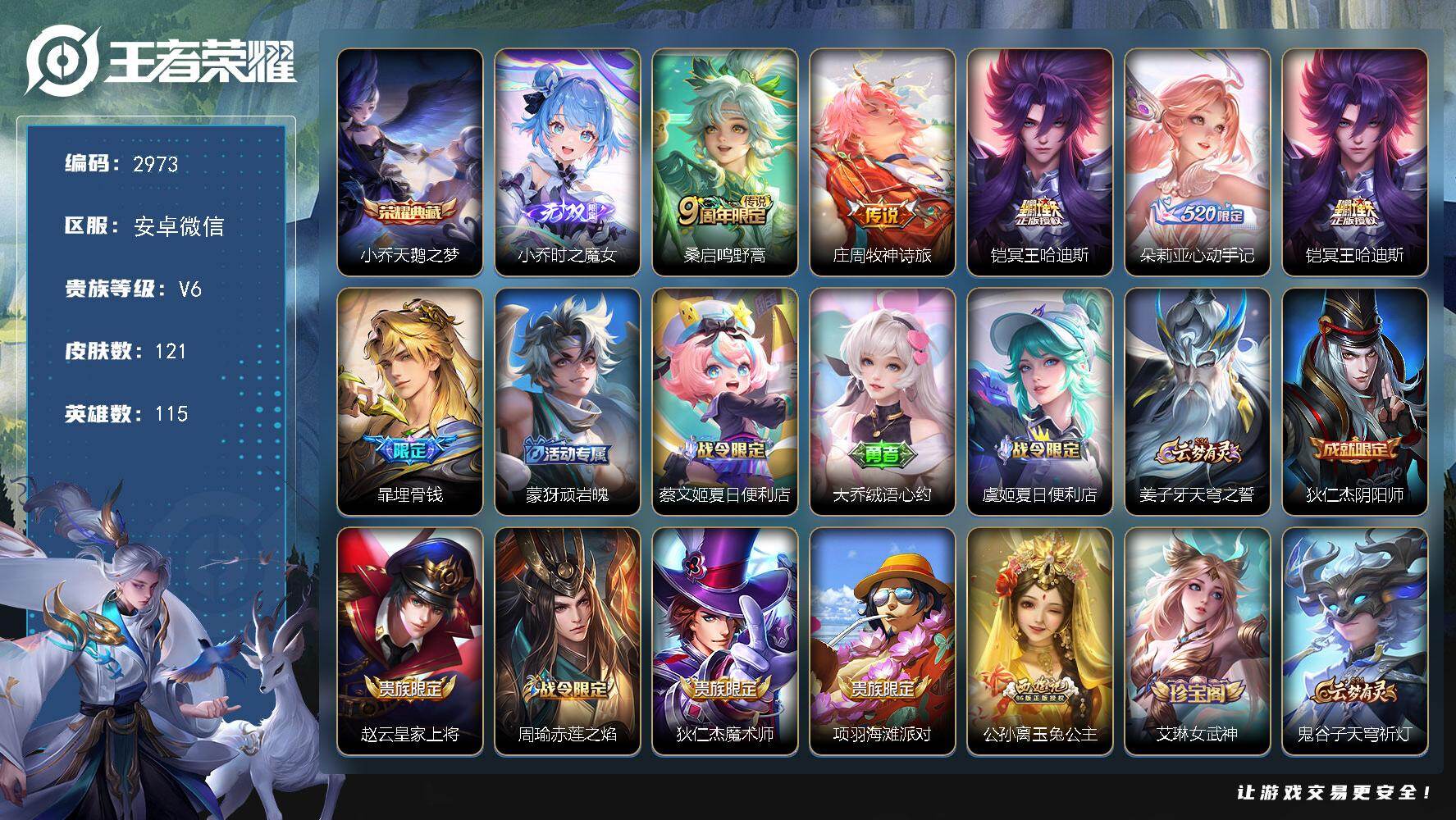 PX_2557163-WX-V6-秩序白银III段位-115英雄-121皮肤-1典藏皮肤-1无双-4传说-24史诗 【英雄全皮】:孙权全皮,敖隐全皮,空空儿全皮 【荣耀典藏】:小乔天鹅之梦 【无双皮肤】:小乔时之魔女 【传说皮肤】:桑启鸣野蒿,庄周牧神诗旅,铠冥王哈迪斯,朵莉亚心动手记 【限定皮肤】:铠冥王哈迪斯,暃埋骨钱,蒙犽顽岩魄,蔡文姬夏日便利店,大乔绒语心约,虞姬夏日便利店,姜子牙天穹之誓,狄仁杰阴阳师,赵云皇家上将,周瑜赤莲之焰,狄仁杰魔术师,项羽海滩派对,公孙离玉兔公主,艾琳女武神,鬼谷子天穹祈灯,小乔时之魔女,沈梦溪龙舞盛年,李元芳蔬乡物语,刘邦剑破天穹,朵莉亚心动手记,刘备异域游侠,周瑜熔金海岸 【赛季限定】:鬼谷子天穹祈灯,刘邦剑破天穹,姜子牙天穹之誓,东皇太一噬灭天穹,太乙真人谧流熔炉 【战令限定】:周瑜赤莲之焰,李元芳蔬乡物语,蔡文姬夏日便利店,虞姬夏日便利店,周瑜线条小狗,小乔线条小狗 【史诗皮肤】:周瑜线条小狗,小乔线条小狗,公孙离涂山容容,弈星守夜人,西施织梦人,黄忠百相守梦,暃埋骨钱,蒙犽顽岩魄,蔡文姬夏日便利店,弈星滕王阁序,公孙离玉兔公主,小乔青蛇,狄仁杰鹰眼统帅,大乔猫狗日记,白起星夜王子,小乔缤纷独角兽,夏侯惇乘风破浪,墨子金属风暴,妲己女仆咖啡,妲己魅力维加斯,嬴政摇滚巨星,孙尚香水果甜心,狄仁杰魔术师,甄姬冰雪圆舞曲,赵云皇家上将 【其他皮肤】:影百相守梦,桑启线条小狗,孙权径山谋武,鬼谷子克喵,莱西奥踏浪烽翎,空空儿戏梦巡演,庄周锦麟游梦,白起死霸装,张良灵野札记,小乔秘证寻踪,苏烈春野闲踪,戈娅玫蓝誓约,明世隐景韶洛都,少司缘灵卦秘语,西施雪境奇遇,典韦铁骨偃魂,太乙真人谧流熔炉,苍苍林狼骑,干将莫邪雾都夜雨,亚瑟动物派对,东皇太一噬灭天穹,盘古敬我三分,大乔绒语心约,虞姬夏日便利店,周瑜熔金海岸,姜子牙天穹之誓,貂蝉长夏之忆,刘备异域游侠,大司命暗都幽影,刘邦剑破天穹,扁鹊无尽旅途,李元芳蔬乡物语,钟无艳春野之旅,沈梦溪龙舞盛年,鬼谷子天穹祈灯,后羿完美运算,莱西奥西部游侠,太乙真人劲辣红锅,米莱狄契约魔法,鲁班大师乓乓大师,鲁班七号黑桃队长,周瑜赤莲之焰,孙膑归虚梦演,大乔守护之力,牛魔制霸全明星,关羽龙腾万里,狄仁杰阴阳师,刘备万事如意,甄姬花好人间,花木兰兔女郎,达摩拳王,亚瑟死亡骑士,典韦黄金武士,妲己少女阿狸,姜子牙时尚教父