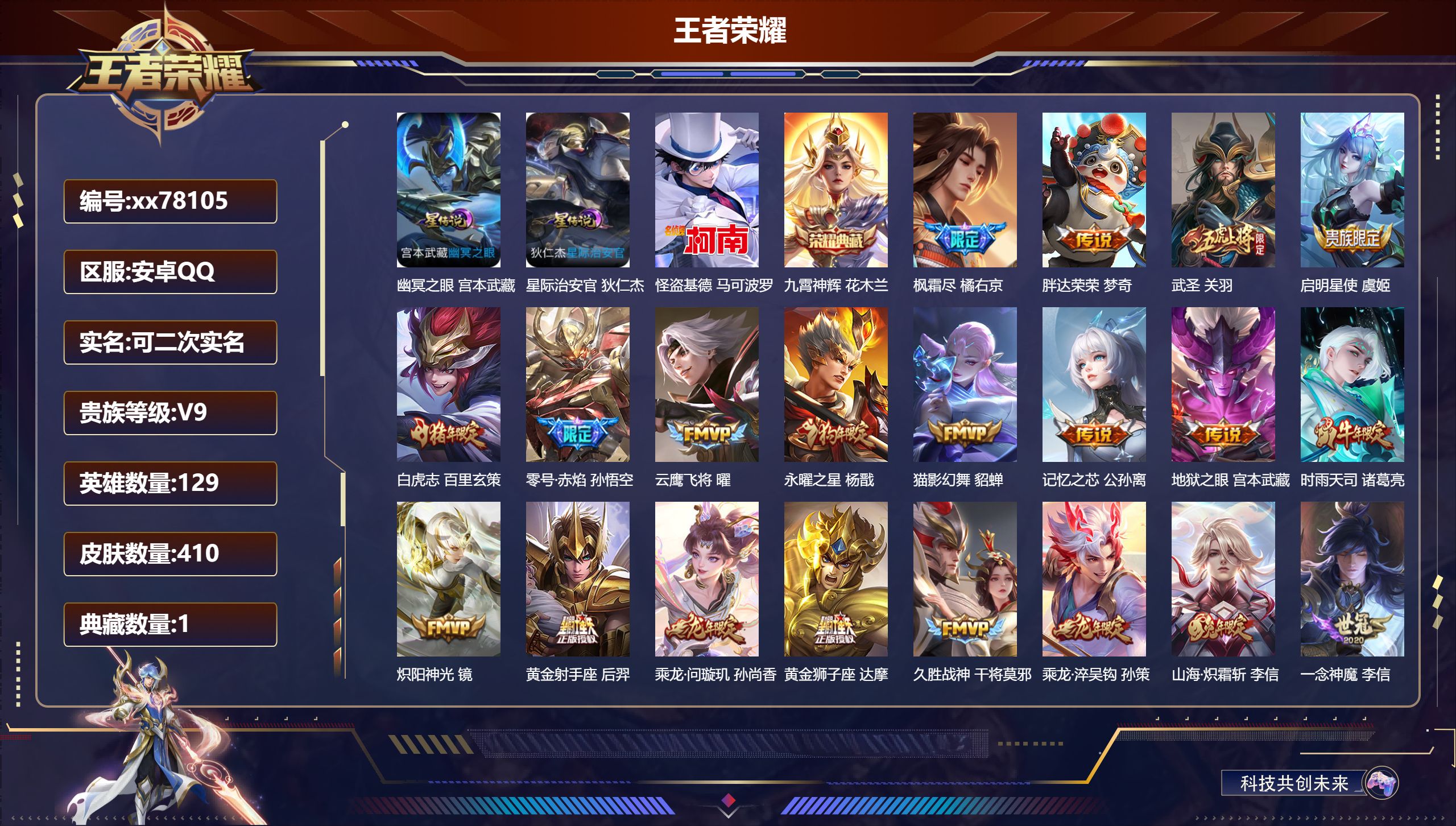 PX_2557140-,可二次,V9,贵族积分,安卓QQ/410皮肤/129英雄/1典藏/0珍品无双/0无双/1珍品传说/34传说/121史诗/9稀有英雄,对抗路40段,,打野46段,历史(省标干将莫邪,,娜可露露) 【2,星传说皮肤】,幽冥之眼,宫本武藏,星际治安官,狄仁杰, 【1,珍品传说】,怪盗基德,马可波罗, 【1,典藏皮肤】,九霄神辉,花木兰, 【34,传说皮肤】,枫霜尽,橘右京,胖达荣荣,梦奇,武圣,关羽,启明星使,虞姬,白虎志,百里玄策,零号·赤焰,孙悟空,云鹰飞将,曜,永曜之星,杨戬,猫影幻舞,貂蝉,记忆之芯,公孙离,地狱之眼,宫本武藏,时雨天司,诸葛亮,炽阳神光,镜,黄金射手座,后羿,乘龙·问璇玑,孙尚香,黄金狮子座,达摩,久胜战神,干将莫邪,乘龙·淬吴钩,孙策,山海·炽霜斩,李信,一念神魔,李信,天魔缭乱,吕布,乘龙·铭钟鼎,赵云,妄想实况,马可波罗,超时空战士,狄仁杰,琥珀纪元,马超,冠军飞将,花木兰,黄金白羊座,张良,千山共赴,干将莫邪,愿照·九州拓,澜,玄雷天君,嬴政,神树通天,后羿,幻光神枪,云缨,愿照·山河定,司空震,鸣野蒿,桑启, 【121,史诗皮肤】,霸王别姬,项羽,时之奇旅,安琪拉,电玩小子,鲁班七号,末日机甲,吕布,白昼王子,嬴政,紫霞仙子,露娜,高山流水,庄周,银河之约,李元芳,暗渊魔法,司马懿,冰霜恋舞曲,干将莫邪,苍穹之光,项羽,天秀·启明,杨戬,狮舞东方,鲁班七号,猫狗日记,大乔,妄想食味,姬小满,德古拉伯爵,刘邦,山海·玄木吟,马可波罗,心灵战警,亚瑟,五谷丰年,鬼谷子,诗语江南,西施,无心,元歌,鬼剑武藏,宫本武藏,百相守梦,黄忠,星夜王子,白起,无限星赏官,公孙离,地狱燃心,司空震,线条小狗,周瑜,遇见飞天,杨玉环,摇滚巨星,嬴政,电玩高手,狂铁,顽趣,梦奇,冰锋战神,关羽,修罗,橘右京,拒霜思,嫦娥,魅力维加斯,妲己,黄金分割率,诸葛亮,偶像歌手,王昭君,梅西,裴擒虎,荣光圣徽,蒙恬,女仆咖啡,妲己,赏金猎手,澜,九幽镇关,项羽,星界游侠,暃,晚萤,娜可露露,舞动绿茵,蔡文姬,繁星吟游,蔡文姬,暗夜贵公子,嬴政,鹰眼统帅,狄仁杰,白晶晶,芈月,大圣娶亲,孙悟空,飞衡,韩信,孙行者,孙悟空,李小龙,裴擒虎,纤云弄巧,云中君,驯魔猎人,兰陵王,龙骑士,墨子,金属风暴,墨子,逐梦之影,韩信,特工魅影,百里守约,猫狗日记,孙策,原初追逐者,百里玄策,逐浪之夏,李元芳,未来纪元,赵云,引擎之心,赵云,灵蛊蚀心,扁鹊,朱雀志,百里守约,黎明之约,雅典娜,鸭鸭历险记,刘禅,魔术师,狄仁杰,龙之律动,狂铁,神威,马超,皇家上将,赵云,至尊宝,孙悟空,辉光之辰,后羿,功夫厨神,程咬金,东方月初,大司命,梁祝,上官婉儿,天才门将,刘禅,圣诞恋歌,貂蝉,云间偶戏,元歌,水晶猎龙者,花木兰,涂山容容,公孙离,心动手记,海诺,御风骁将,吕布,圣诞狂欢,吕布,魅语,不知火舞,器灵·浮梦炉,赵怀真,罗小黑战记,百里玄策,星界战将,牛魔,永昼,夏洛特,地狱岩魂,廉颇,冰雪圆舞曲,甄姬,航海奇遇记,老夫子,千年之狐,李白,节奏热浪,阿轲,暗夜猫娘,阿轲,织梦人,西施,超时空战士,钟无艳,游园惊梦,甄姬,青春决赛季,花木兰,曙光守护者,铠,万灵启世,女娲,心灵骇客,安琪拉,箭羽风息,伽罗,乱世虎臣,张飞,万物之道,弈星,绅士熊喵,刘禅,缤纷独角兽,小乔,百相守梦,百里守约,线条小狗,小乔,蓝屏警告,典韦,天狼狩猎者,裴擒虎,真爱魔法,干将莫邪,时之恋人,孙尚香,水果甜心,孙尚香,狂想玩偶喵,蒙犽,化蝶舞,阿轲,江河有灵,阿古朵,幽灵船长,曹操,乘风破浪,夏侯惇,暗隐猎兽者,兰陵王, 【176,勇者皮肤】,时空谍影,海诺,胡桃夹子,干将莫邪,圆桌骑士,盾山,烛龙,曹操,爱心护理,阿轲,太极少年,赵怀真,沙漠行僧,达摩,大漠名商,沈梦溪,缤纷绘卷,张良,纽约教父,刘备,拳王,达摩,大发明家,达摩,龙舞盛年,沈梦溪,乐园追猎者,白起,丁香结,小乔,功夫炙烤,廉颇,沉稳之力,孙尚香,海盐诗旅,桑启,幻泉雾影,海月,朔风刀,夏侯惇,醍醐杖,老夫子,朔望之晖,女娲,归虚梦演,孙膑,汉昭烈帝,刘备,热血海滩,哪吒,白色死神,白起,黑桃队长,鲁班七号,黄金武士,典韦,王牌新星,海月,落雪兰心,甄姬,御旌,牛魔,阴阳师,狄仁杰,径山谋武,孙权,次元突破,哪吒,古海寻踪,张良,科学大爆炸,项羽,功夫老勺,老夫子,西部大镖客,牛魔,鲨炮海盗猫,沈梦溪,海滩派对,项羽,完美运算,后羿,万华元夜,狄仁杰,克喵,鬼谷子,踏浪烽翎,莱西奥,演武夺筹,程咬金,红桃皇后,芈月,奇妙博物学,庄周,西部游侠,莱西奥,猎兽之王,吕布,野性能量,吕布,哥特玫瑰,露娜,守护之力,大乔,无双福将,程咬金,百相守梦,影,原初探秘者,鬼谷子,潮玩探月行,猪八戒,鸿运当头,亚瑟,天穹祈灯,鬼谷子,疑决卦,明世隐,如懿,安琪拉,化身博士,扁鹊,潮玩骑士王,亚瑟,阿尔法小队,后羿,五福同心,张飞,金色潮汐,朵莉亚,次元傲视,杨戬,星际陆战队,程咬金,幻乐之宴,鬼谷子,东方不败,武则天,霸王丸,宫本武藏,虹云星官,明世隐,雾影缉谜,兰陵王,潮玩牛仔,马可波罗,救世之瞳,扁鹊,赤莲之焰,周瑜,死亡骑士,亚瑟,浪漫序章,刘备,敏锐之力,李白,危途狂花,戈娅,胡桃狂想曲,蒙犽,破局者,亚连,玩偶对对碰,安琪拉,掌控之力,诸葛亮,海滩丽影,钟无艳,圣弓游侠,后羿,落日弦歌,高渐离,忍·炎影,赵云,雪境奇遇,西施,重明,芈月,炽热元素使,姜子牙,坚韧之力,苏烈,唤灵魔甲,刘禅,万事如意,刘备,逐霄战戟,吕布,谜偶窥秘,鬼谷子,擒涛扼浪,裴擒虎,苍云破阵,蒙恬,乓乓大师,鲁班大师,逐霄之志,曹操,死亡摇滚,高渐离,溯影追猎,虞姬,极光幻客,蚩奼,探海日志,鲁班大师,天使之翼,孙膑,雾