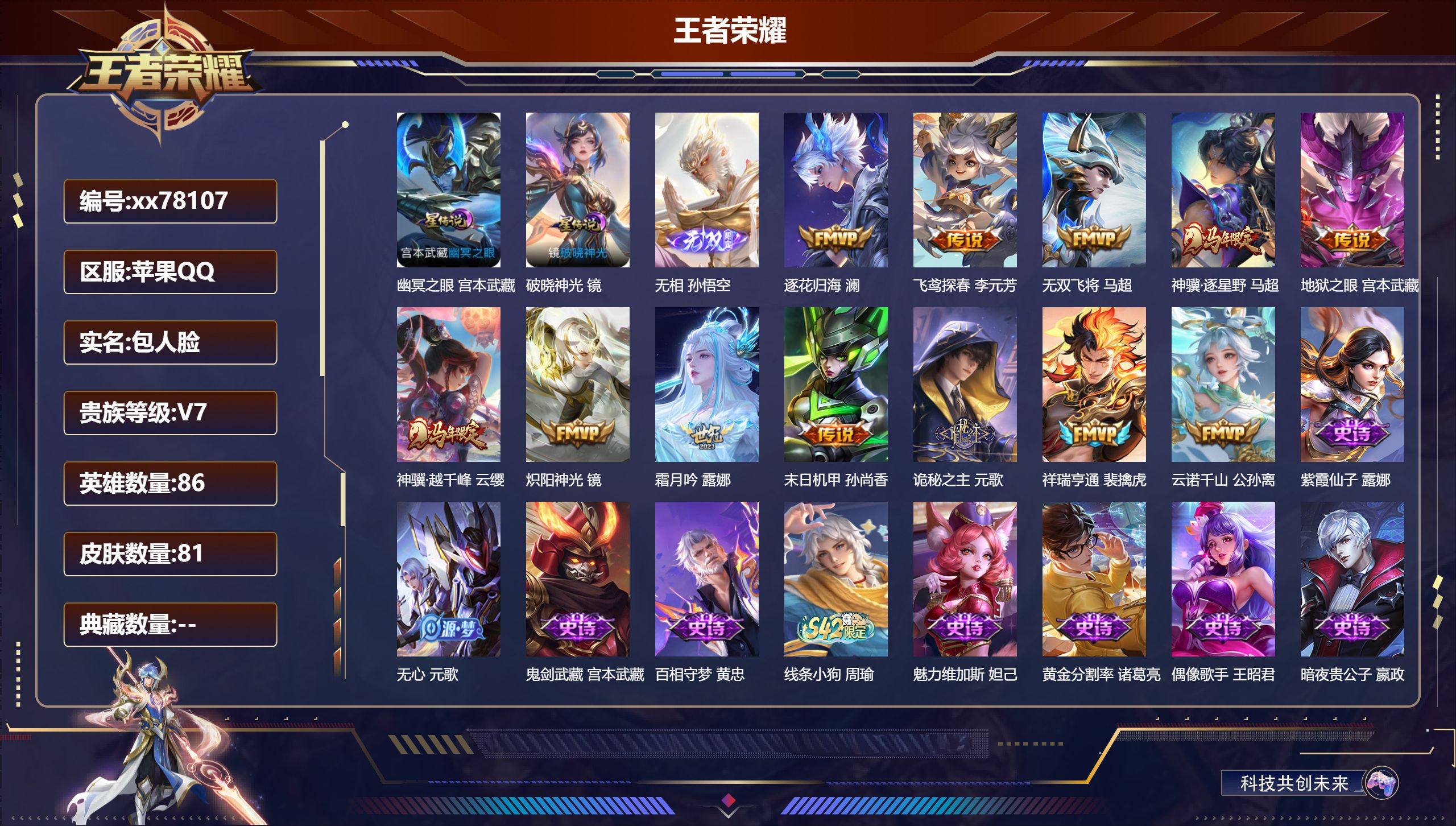PX_2557142-,包人脸,V7,贵族积分20841,苹果QQ/81皮肤/86英雄/0典藏/0珍品无双/1无双/0珍品传说/12传说/22史诗/5稀有英雄 【2,星传说皮肤】,幽冥之眼,宫本武藏,破晓神光,镜, 【1,无双皮肤】,无相,孙悟空, 【12,传说皮肤】,逐花归海,澜,飞鸢探春,李元芳,无双飞将,马超,神骥·逐星野,马超,地狱之眼,宫本武藏,神骥·越千峰,云缨,炽阳神光,镜,霜月吟,露娜,末日机甲,孙尚香,诡秘之主,元歌,祥瑞亨通,裴擒虎,云诺千山,公孙离, 【22,史诗皮肤】,紫霞仙子,露娜,无心,元歌,鬼剑武藏,宫本武藏,百相守梦,黄忠,线条小狗,周瑜,魅力维加斯,妲己,黄金分割率,诸葛亮,偶像歌手,王昭君,暗夜贵公子,嬴政,鹰眼统帅,狄仁杰,李小龙,裴擒虎,灵蛊蚀心,扁鹊,鸭鸭历险记,刘禅,魔术师,狄仁杰,皇家上将,赵云,涂山容容,公孙离,圣诞狂欢,吕布,冰雪圆舞曲,甄姬,节奏热浪,阿轲,谪仙醉月,李白,线条小狗,小乔,幽灵船长,曹操, 【31,勇者皮肤】,拳王,达摩,汉昭烈帝,刘备,阴阳师,狄仁杰,径山谋武,孙权,海滩派对,项羽,克喵,鬼谷子,踏浪烽翎,莱西奥,哥特玫瑰,露娜,百相守梦,影,赤刃凌霄,敖隐,死亡骑士,亚瑟,溯影追猎,虞姬,天使之翼,孙膑,罗小黑战记,哪吒,荣光之誓,亚瑟,花好人间,甄姬,万象初新,宫本武藏,街头霸王,韩信,少女阿狸,妲己,命运加冕,露娜,鸭鸭历险记,沈梦溪,死霸装,白起,虚灵犬护,钟馗,白执事,赵云,熔金海岸,周瑜,魅影绮裳,影,鹤鸣心笺,艾琳,锦麟游梦,庄周,云械蓝图,云中君,逆浪荇歌,甄姬,线条小狗,周瑜, 【16,其他皮肤】,灼热之刃,李信,绯红之刃,露娜,冰刃幻境,镜,碧珀绯影,暃,午夜歌剧院,元歌,街头旋风,裴擒虎,画中游,桑启,归虚梦演,曜,威尼斯狂欢,百里玄策,幸存者,马超,荷鲁斯之眼,云中君,特种部队,李元芳,绝影神枪,百里守约,孤猎,澜,踏雪寻梅,弈星,天启骑士,关羽, 【5,稀有英雄】,敖隐,不知火舞,橘右京,娜可露露,韩信, 营地ID:,