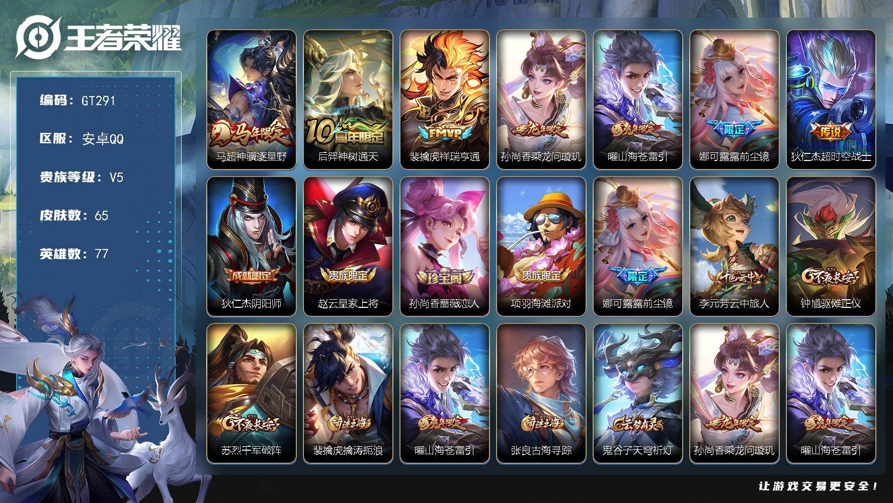 PX_2557629-可换绑【精品号·马年马超·龙年孙尚香·兔年曜·娜可露露前尘镜·】,156幸运值,1按键,2王者印记,五级铭文,可二次GT291安卓Q-V5-65皮肤-7传说-13史诗【传说皮肤】:马超神骥逐星野,后羿神树通天,裴擒虎祥瑞亨通,孙尚香乘龙问璇玑,曜山海苍雷引,娜可露露前尘镜,狄仁杰超时空战士【限定皮肤】:狄仁杰阴阳师,赵云皇家上将,孙尚香蔷薇恋人,项羽海滩派对,娜可露露前尘镜,李元芳云中旅人,钟馗驱傩正仪,苏烈千军破阵,裴擒虎擒涛扼浪,曜山海苍雷引,张良古海寻踪,鬼谷子天穹祈灯,孙尚香乘龙问璇玑【年限皮肤】:曜山海苍雷引,孙尚香乘龙问璇玑【赛季限定】钟馗驱傩正仪,苏烈千军破阵,李元芳云中旅人,裴擒虎擒涛扼浪,张良古海寻踪,鬼谷子天穹祈灯,太乙真人谧流熔炉【战令限定】:周瑜线条小狗,小乔线条小【史诗皮肤】:周瑜线条小狗,小乔线条小狗,孙尚香时之恋人,狄仁杰鹰眼统帅,阿轲节奏热浪,韩信白龙吟,曹操幽灵船长,妲己魅力维加斯,嬴政摇滚巨星,嬴政暗夜贵公子,孙尚香水果甜心,孙尚香蔷薇恋人,王昭君偶像歌手,赵云皇家上将【其他皮肤】:艾琳鹤鸣心笺,阿古朵布丁狗之约,张良灵野札记,苏烈春野闲踪,刘备浪漫序章,戈娅玫蓝誓约,明世隐景韶洛都,太乙真人谧流熔炉,鬼谷子天穹祈灯,后羿完美运算,张良古海寻踪,裴擒虎擒涛扼浪,李元芳云中旅人,苏烈千军破阵,钟馗驱傩正仪,狂铁命运角斗场,狄仁杰阴阳师,后羿阿尔法小队,刘备万事如意,达摩拳王,亚瑟死亡骑士,牛魔西部大镖客,白起白色死神,赵云白执事,韩信街头霸王,项羽海滩派对,暃碧珀绯影,云缨赤焰之缨,澜孤猎,镜冰刃幻境,李信灼热之刃,盾山极冰防御线,司马懿魇语军师,孙策海之征途,裴擒虎街头旋风,百里玄策威尼斯狂欢,百里守约绝影神枪,铠龙域领主,兰陵王隐刃,孙悟空西部大镖客,曹操超能战警,王昭君精灵公主,高渐离金属狂潮