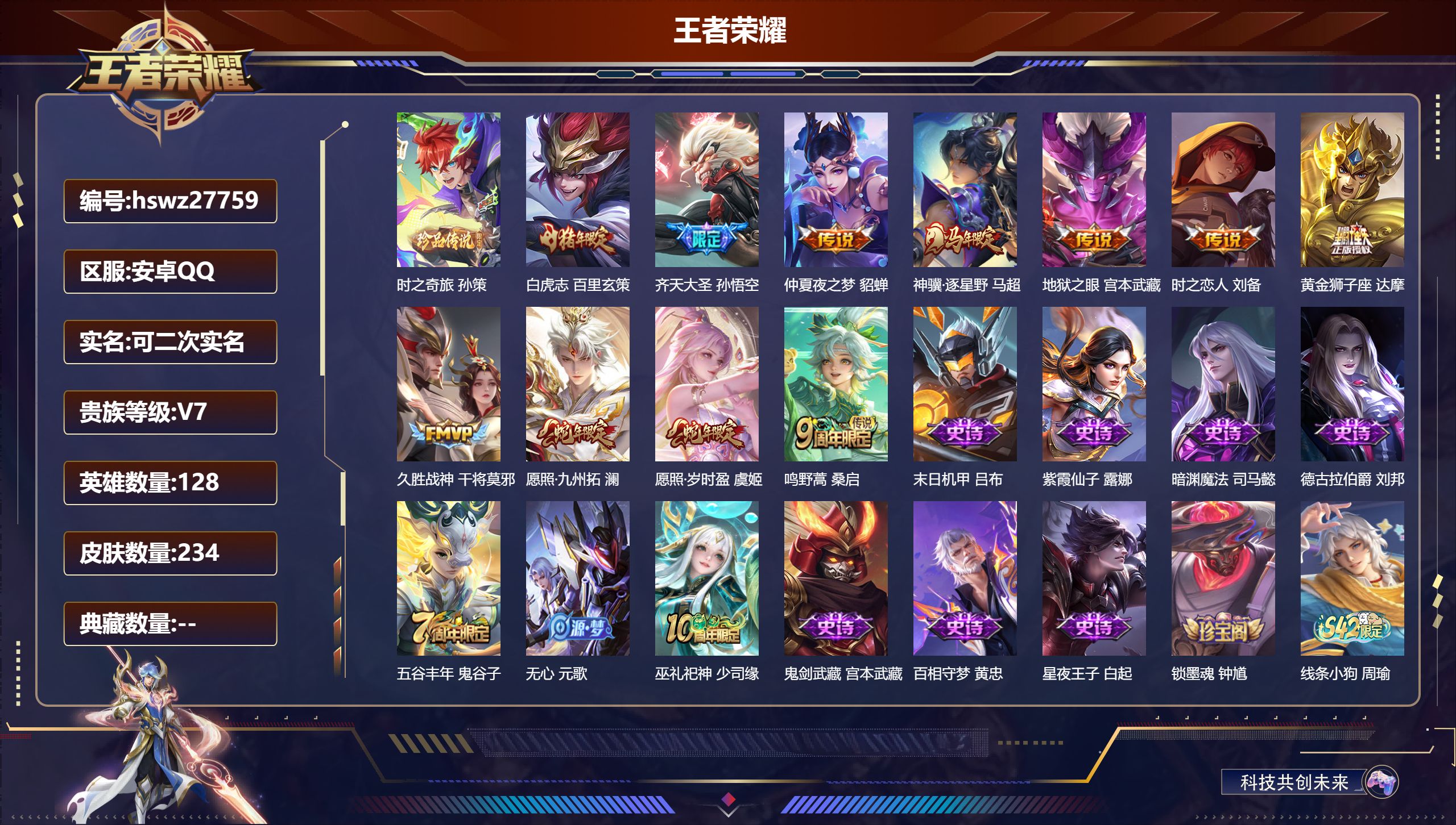 PX_2546378-Q/非凡王者/250皮肤/128英雄/1典藏/0珍品无双/0无双/1珍品传说/20传说/61史诗/9稀有英雄 【1,珍品传说】怪盗基德,马可波罗, 【1,典藏皮肤】天鹅之梦,小乔, 【20,传说皮肤】云霓雀翎,虞姬,逐花归海,澜,无双飞将,马超,白虎志,百里玄策,地狱火,孙悟空,浮生妄,夏洛特,地狱之眼,宫本武藏,神骥·镇沧海,关羽,时雨天司,诸葛亮,炽阳神光,镜,黄金射手座,后羿,黄金狮子座,达摩,久胜战神,干将莫邪,末日机甲,孙尚香,山海·炽霜斩,李信,愿照·九州拓,澜,幻光神枪,云缨,愿照·山河定,司空震,祥瑞亨通,裴擒虎,鸣野蒿,桑启, 【61,史诗皮肤】紫霞仙子,露娜,暗渊魔法,司马懿,暗影游猎,马可波罗,猫狗日记,大乔,妄想食味,姬小满,五谷丰年,鬼谷子,无心,元歌,巫礼祀神,少司缘,鬼剑武藏,宫本武藏,百相守梦,黄忠,星夜王子,白起,线条小狗,周瑜,百晓客,明世隐,摇滚巨星,嬴政,修罗,橘右京,魅力维加斯,妲己,偶像歌手,王昭君,女仆咖啡,妲己,舞动绿茵,蔡文姬,暗夜贵公子,嬴政,鹰眼统帅,狄仁杰,大圣娶亲,孙悟空,孙行者,孙悟空,李小龙,裴擒虎,特工魅影,百里守约,猫狗日记,孙策,原初追逐者,百里玄策,逐浪之夏,李元芳,未来纪元,赵云,黎明之约,雅典娜,石田雨龙,后羿,魔术师,狄仁杰,龙之律动,狂铁,神威,马超,皇家上将,赵云,至尊宝,孙悟空,功夫厨神,程咬金,梁祝,上官婉儿,圣诞恋歌,貂蝉,云间偶戏,元歌,水晶猎龙者,花木兰,涂山容容,公孙离,破空之剑,亚连,圣诞狂欢,吕布,器灵·浮梦炉,赵怀真,茶境仙,孙膑,冰雪圆舞曲,甄姬,千年之狐,李白,织梦人,西施,曙光守护者,铠,心灵骇客,安琪拉,乱世虎臣,张飞,百相守梦,周瑜,万物之道,弈星,谪仙醉月,李白,缤纷独角兽,小乔,线条小狗,小乔,水果甜心,孙尚香,化蝶舞,阿轲,幽灵船长,曹操,暗隐猎兽者,兰陵王, 【123,勇者皮肤】圆桌骑士,盾山,烛龙,曹操,沙漠行僧,达摩,缤纷绘卷,张良,纽约教父,刘备,拳王,达摩,大发明家,达摩,龙舞盛年,沈梦溪,丁香结,小乔,功夫炙烤,廉颇,铁甲之心,典韦,沉稳之力,孙尚香,爱与正义,程咬金,海盐诗旅,桑启,朔风刀,夏侯惇,醍醐杖,老夫子,白色死神,白起,黑桃队长,鲁班七号,黄金武士,典韦,御旌,牛魔,阴阳师,狄仁杰,炼金王,扁鹊,致命风华,阿轲,次元突破,哪吒,科学大爆炸,项羽,功夫老勺,老夫子,鲨炮海盗猫,沈梦溪,海滩派对,项羽,完美运算,后羿,万华元夜,狄仁杰,克喵,鬼谷子,踏浪烽翎,莱西奥,演武夺筹,程咬金,红桃皇后,芈月,守护之力,大乔,无双福将,程咬金,百相守梦,影,原初探秘者,鬼谷子,潮玩探月行,猪八戒,疑决卦,明世隐,化身博士,扁鹊,阿尔法小队,后羿,五福同心,张飞,星际陆战队,程咬金,幻乐之宴,鬼谷子,霸王丸,宫本武藏,虹云星官,明世隐,雾影缉谜,兰陵王,赤刃凌霄,敖隐,死亡骑士,亚瑟,浪漫序章,刘备,敏锐之力,李白,玩偶对对碰,安琪拉,掌控之力,诸葛亮,海滩丽影,钟无艳,忍·炎影,赵云,狰,白起,雪境奇遇,西施,重明,芈月,万事如意,刘备,擒涛扼浪,裴擒虎,乓乓大师,鲁班大师,逐霄之志,曹操,妖精王,孙膑,极光幻客,蚩奼,天使之翼,孙膑,雾都夜雨,干将莫邪,兔女郎,花木兰,龙腾万里,关羽,金庭之子,兰陵王,未来纪元,宫本武藏,罗小黑战记,哪吒,荣光之誓,亚瑟,花好人间,甄姬,万象初新,宫本武藏,御銮,盾山,时尚教父,姜子牙,秘密基地,刘禅,穷奇,典韦,教廷特使,韩信,街头霸王,韩信,云中旅人,李元芳,妄想特派,李元芳,西部大镖客,孙悟空,紫罗兰之誓,妲己,凯尔特女王,虞姬,少女阿狸,妲己,混沌棋,弈星,御霄,米莱狄,春野闲踪,苏烈,布丁狗之约,阿古朵,命运加冕,露娜,幻想奇妙夜,王昭君,灵野札记,张良,驱傩正仪,钟馗,命运角斗场,狂铁,死霸装,白起,虚灵犬护,钟馗,御狮,狂铁,班班快跑,鲁班七号,白执事,赵云,饕餮,太乙真人,神迹守卫,孙悟空,罗小黑战记,张良,剑破天穹,刘邦,青衿临川,桑启,熔金海岸,周瑜,天穹之誓,姜子牙,访茗客,马超,星梦巡礼,姜子牙,破阵·退雄兵,杨戬,谧流熔炉,太乙真人,金福满堂,东皇太一,群星魔术团,程咬金,鹤鸣心笺,艾琳,线条小狗,妲己,锦麟游梦,庄周,逆浪荇歌,甄姬,百相守梦,孙策,线条小狗,周瑜,噬灭天穹,东皇太一,玫蓝誓约,戈娅,景韶洛都,明世隐, 【47,其他皮肤】伊势巫女,大乔,金属狂潮,高渐离,前尘,金蝉,三太子,哪吒,棒球奇才,沈梦溪,生化警戒,钟无艳,花见巫女,伽罗,爱与和平,苏烈,第七人偶,干将莫邪,万圣前夜,小乔,灼热之刃,李信,木偶奇遇记,鲁班七号,精灵王,后羿,碧珀绯影,暃,星航指挥官,诸葛亮,魇语军师,司马懿,英喵野望,刘禅,午夜歌剧院,元歌,启蛰,司空震,花间舞,公孙离,街头旋风,裴擒虎,剑舞者,花木兰,范海辛,李白,归虚梦演,蒙犽,激情绿茵,马可波罗,埃及法老,杨戬,阿摩司公爵,鬼谷子,年年有余,猪八戒,锦衣卫,狄仁杰,归虚梦演,曜,威尼斯狂欢,百里玄策,幸存者,马超,战争女神,雅典娜,创世神祝,盘古,特种部队,李元芳,绝影神枪,百里守约,森,瑶,孤猎,澜,加勒比小姐,虞姬,踏雪寻梅,弈星,秩序猎龙将,蒙恬,精准探案法,米莱狄,精灵公主,王昭君,赤焰之缨,云缨,美梦成真,梦奇,怪盗基德,马可波罗,西部大镖客,孙悟空, 【9,稀有英雄】敖隐,嬴政,不知火舞,橘右京,夏洛特,娜可露露,韩信,艾琳,赵云, 营地ID:,