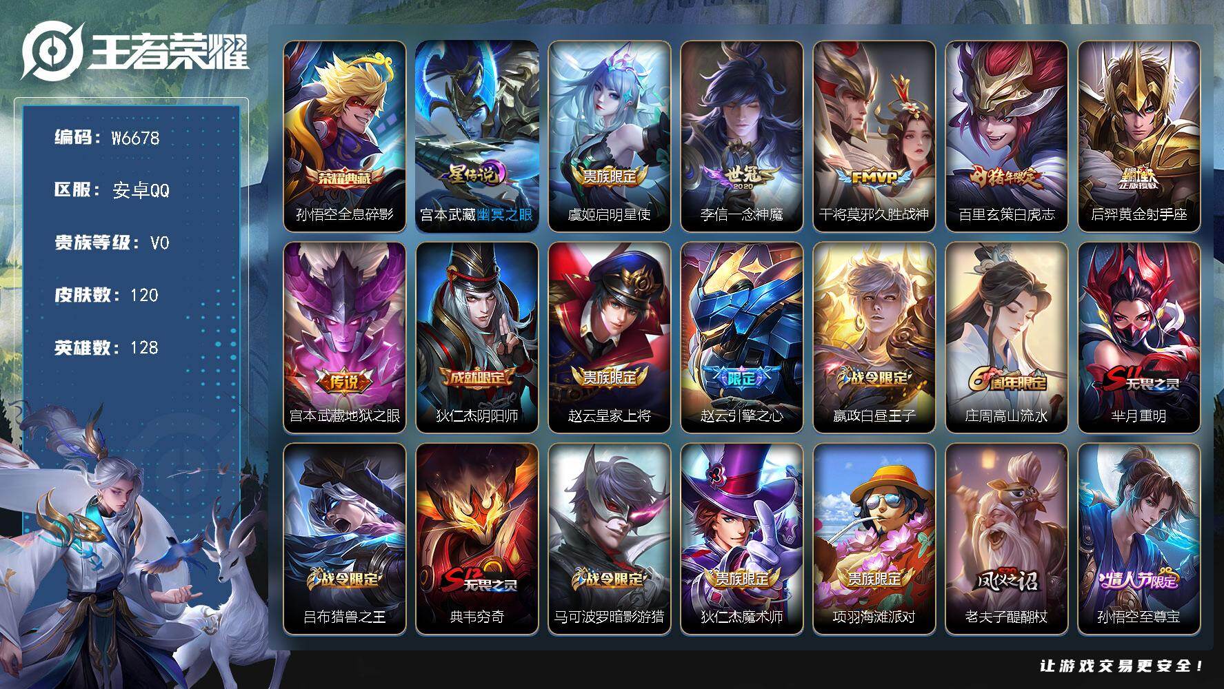 PX_2553853-【W6678】【亮点:2.5K低场次打野号】安卓Q-可二次-贵8-128英雄-120皮肤-1典藏-1星元-6传说-38限定-贵族积分53878-营地ID:491332554(热门:孙悟空全息碎影-李信一念神魔,干将莫邪久胜战神,百里玄策白虎志,宫本武藏地狱之眼-孙悟空至尊宝,孙悟空大圣娶亲) 【星元皮肤】:宫本武藏幽冥之眼