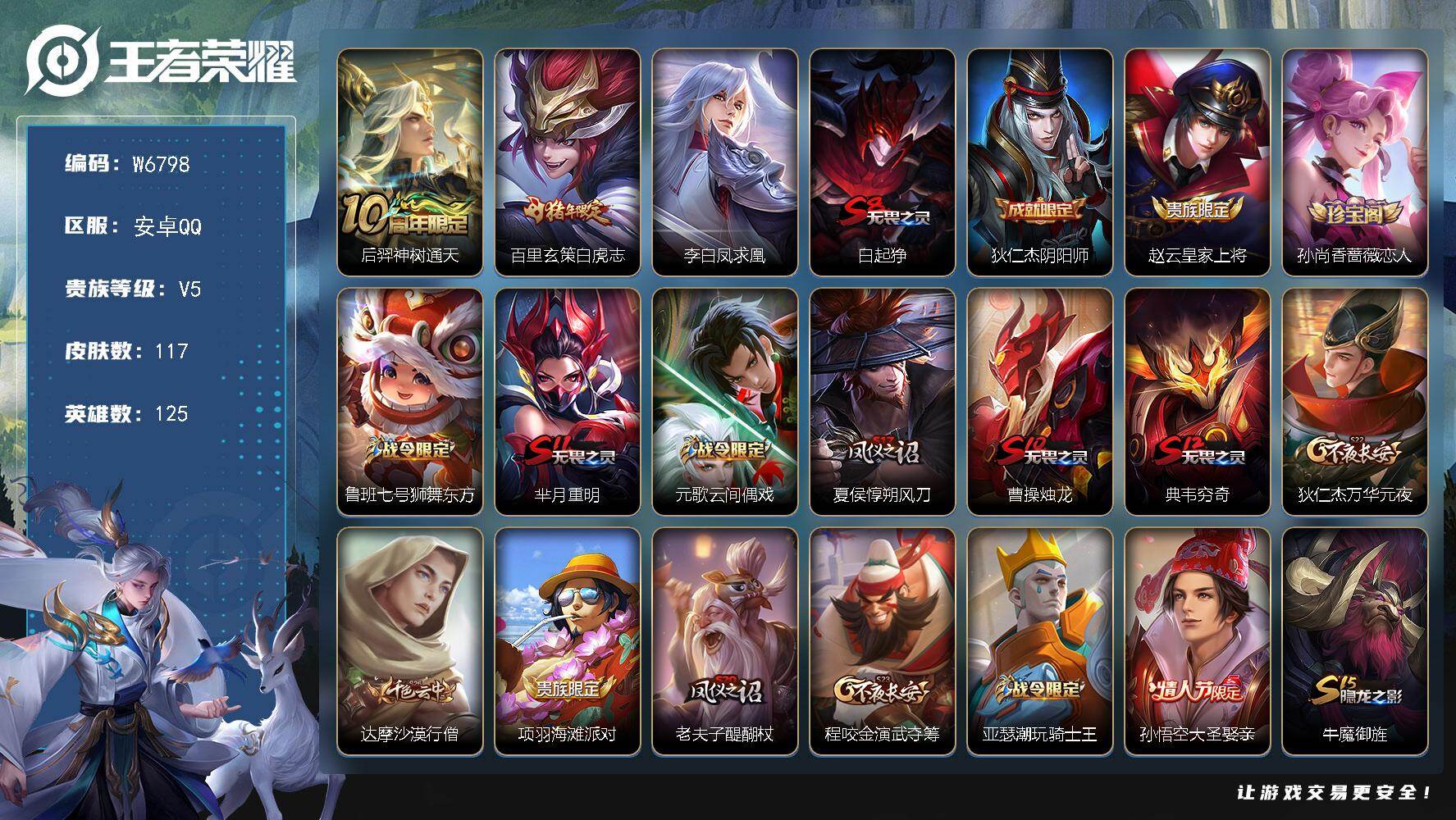 PX_2561751-【W6798】精品胜率打野小号.玄策白虎志.李白凤求凰.猴子大圣娶亲.韩信白龙吟.冰冠公主-安卓Q-有二次-贵5-126英雄-117皮肤-3传说-47限定-25史诗-5307星币-1按键-百朵花花-194夺宝幸运值-3印记-贵族积分6770-营地ID:402973599