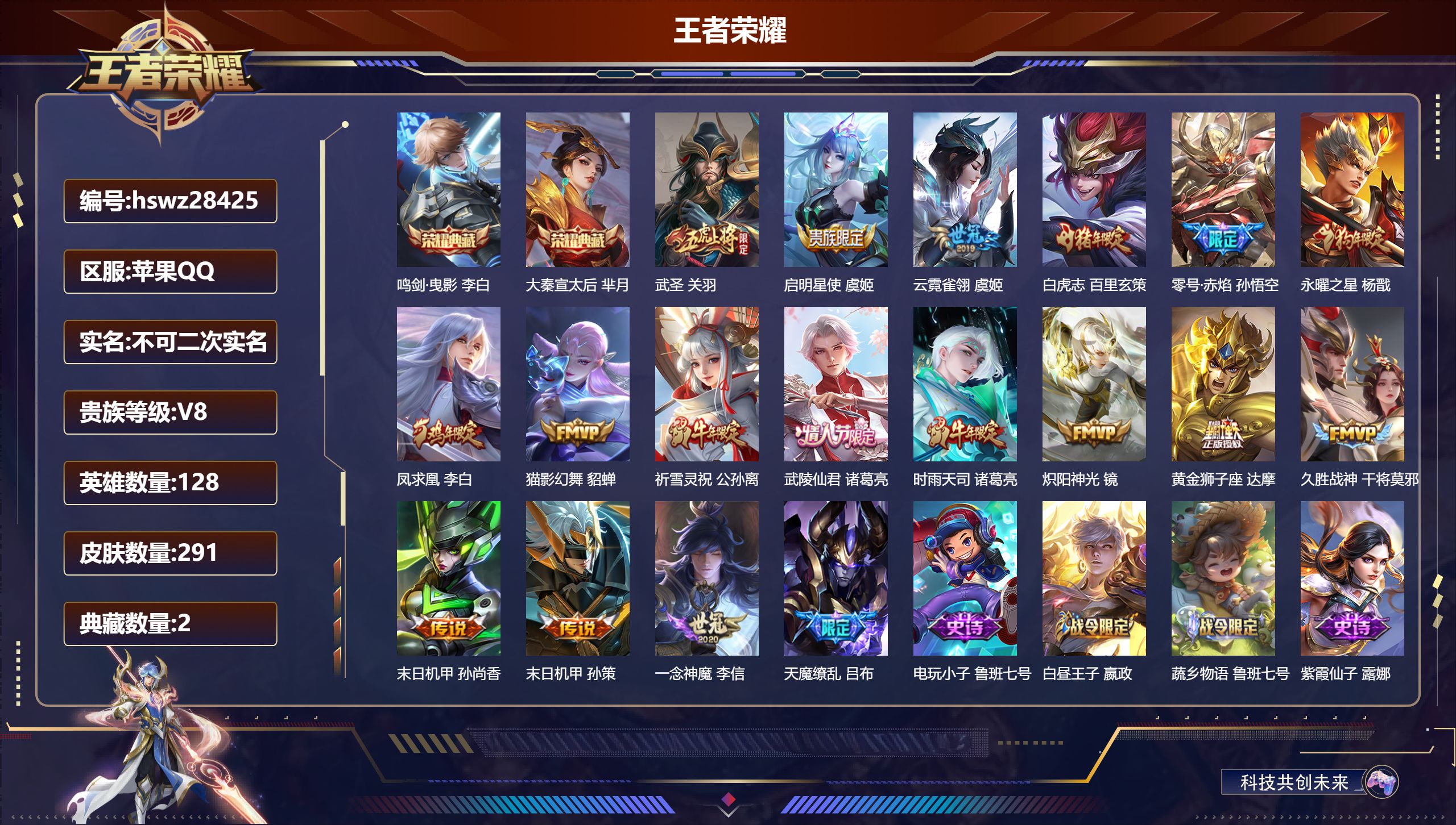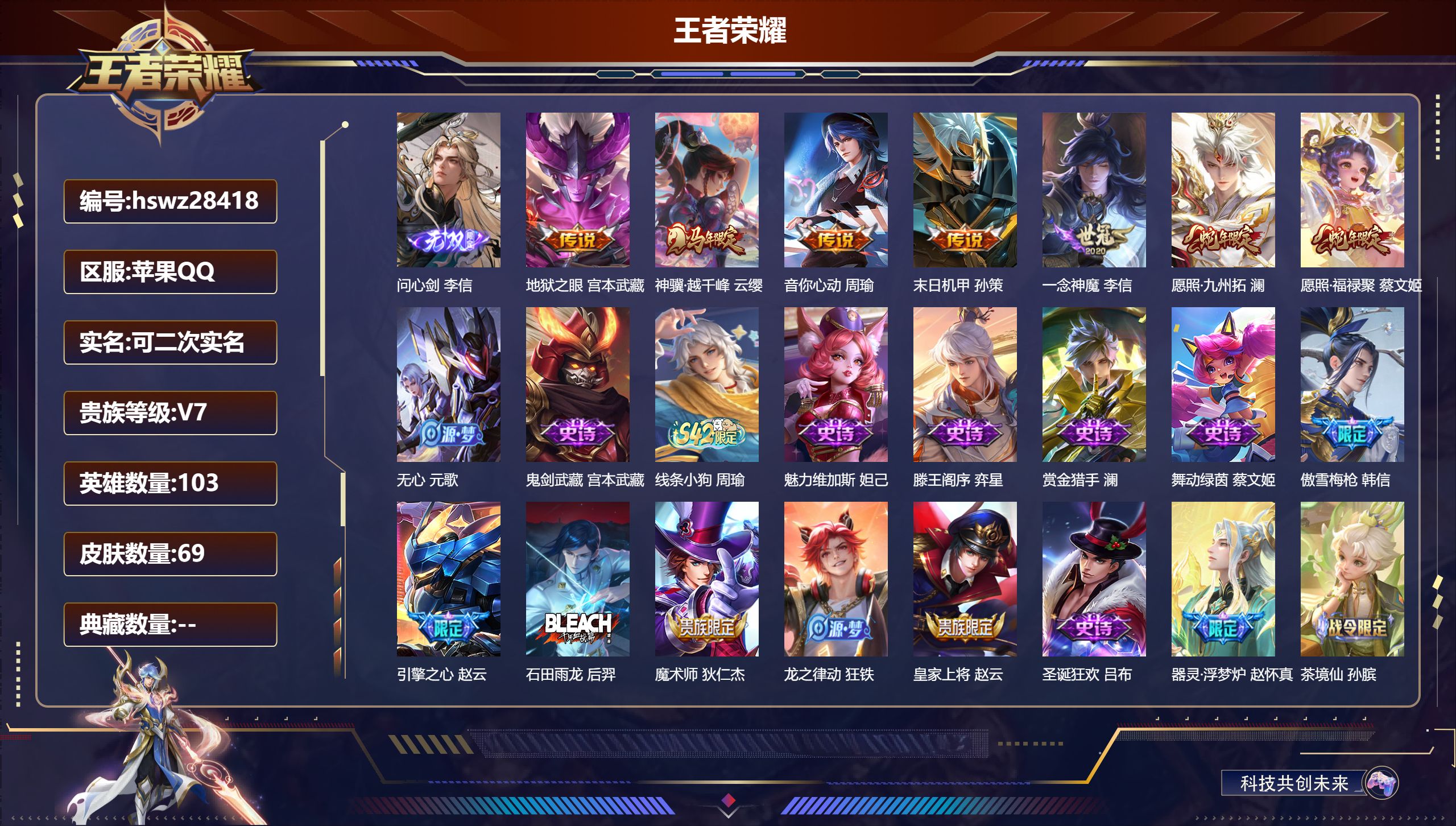 PX_2561754-Q/至尊星耀/69皮肤/103英雄/0典藏/0珍品无双/1无双/0珍品传说/7传说/22史诗/6稀有英雄 【1,无双皮肤】问心剑,李信, 【7,传说皮肤】地狱之眼,宫本武藏,神骥·越千峰,云缨,音你心动,周瑜,末日机甲,孙策,一念神魔,李信,愿照·九州拓,澜,愿照·福禄聚,蔡文姬, 【22,史诗皮肤】无心,元歌,鬼剑武藏,宫本武藏,线条小狗,周瑜,魅力维加斯,妲己,滕王阁序,弈星,赏金猎手,澜,舞动绿茵,蔡文姬,傲雪梅枪,韩信,引擎之心,赵云,石田雨龙,后羿,魔术师,狄仁杰,龙之律动,狂铁,皇家上将,赵云,圣诞狂欢,吕布,器灵·浮梦炉,赵怀真,茶境仙,孙膑,千年之狐,李白,节奏热浪,阿轲,真我赫兹,镜,万物之道,弈星,缤纷独角兽,小乔,水果甜心,孙尚香, 【34,勇者皮肤】爱心护理,阿轲,沙漠行僧,达摩,大漠名商,沈梦溪,拳王,达摩,龙舞盛年,沈梦溪,海盐诗旅,桑启,白色死神,白起,阴阳师,狄仁杰,海滩派对,项羽,五福同心,张飞,舞狮寰,吕布,死亡骑士,亚瑟,万事如意,刘备,擒涛扼浪,裴擒虎,糖果风暴,安琪拉,逐霄之志,曹操,溯影追猎,虞姬,极光幻客,蚩奼,探海日志,鲁班大师,兔女郎,花木兰,金庭之子,兰陵王,荣光之誓,亚瑟,万象初新,宫本武藏,教廷特使,韩信,云中旅人,李元芳,命运加冕,露娜,幻想奇妙夜,王昭君,虚灵犬护,钟馗,白执事,赵云,天穹之誓,姜子牙,访茗客,马超,谧流熔炉,太乙真人,鹤鸣心笺,艾琳,线条小狗,周瑜, 【6,其他皮肤】星航指挥官,诸葛亮,隐刃,兰陵王,尼罗河女神,女娲,归虚梦演,曜,创世神祝,盘古,孤猎,澜, 【6,稀有英雄】不知火舞,橘右京,夏洛特,娜可露露,韩信,赵云, 营地ID:,