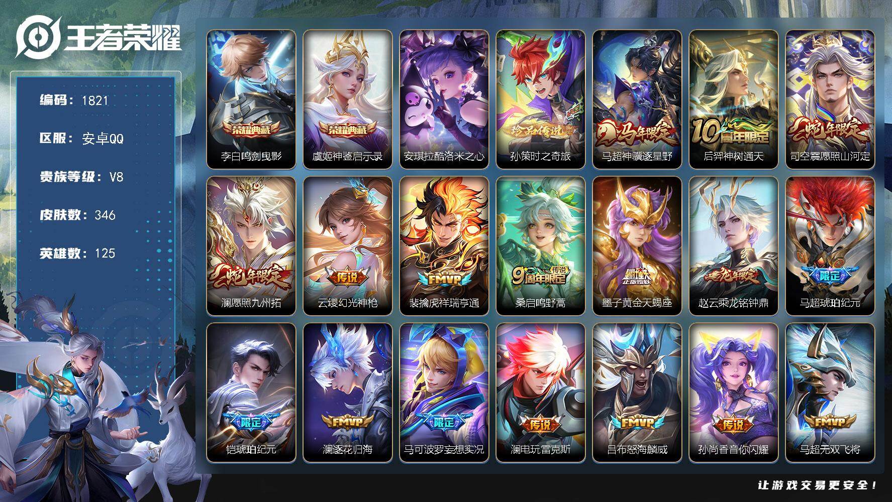 PX_2541237-【346皮2典藏2珍品23传说,鸣剑曳影,神鉴启示录,神骥逐星野,酷洛米之心,时之奇旅,逐花归海】安卓Q-V8-最强王者段位-125英雄-346皮肤-2典藏皮肤-2珍品传说-23传说-95史诗 【英雄全皮】:刘禅全皮,敖隐全皮,澜全皮,司空震全皮,赵怀真全皮 【荣耀典藏】:李白鸣剑曳影,虞姬神鉴启示录 【珍品传说】:安琪拉酷洛米之心,孙策时之奇旅 【传说皮肤】:马超神骥逐星野,后羿神树通天,司空震愿照山河定,澜愿照九州拓,云缨幻光神枪,裴擒虎祥瑞亨通,桑启鸣野蒿,墨子黄金天蝎座,赵云乘龙铭钟鼎,马超琥珀纪元,铠琥珀纪元,澜逐花归海,马可波罗妄想实况,澜电玩雷克斯,吕布怒海麟威,孙尚香音你闪耀,马超无双飞将,裴擒虎寅虎赤拳,镜炽阳神光,虞姬启明星使,李信一念神魔,达摩黄金狮子座,宫本武藏地狱之眼 【限定皮肤】:蒙犽顽岩魄,蔡文姬夏日便利店,大乔绒语心约,虞姬夏日便利店,姜子牙天穹之誓,杨戬破阵退雄兵,狄仁杰阴阳师,赵云皇家上将,墨子神迹守卫,高渐离玩趣恶龙,阿轲迷踪丽影,扁鹊奇幻香踪,周瑜赤莲之焰,元歌无心,马可波罗山海玄木吟,马可波罗妄想实况,狄仁杰魔术师,项羽海滩派对,韩信飞衡,韩信傲雪梅枪,王昭君午后时光,李元芳云中旅人,虞姬启明星使,钟馗神迹守卫,杨戬潮玩骑兵,雅典娜黎明之约,太乙真人华丽摇滚,鬼谷子五谷丰年,百里玄策原初追逐者,沈梦溪大漠名商,裴擒虎李小龙,裴擒虎寅虎赤拳,裴擒虎擒涛扼浪,狂铁电玩高手,瑶山海碧波行,云中君纤云弄巧,上官婉儿梁祝,嫦娥拒霜思,嫦娥暖冬兔眠,西施玲珑珍味,蒙犽狂想玩偶喵,鲁班大师探海日志,镜匿光追影者,桑启海盐诗旅,暃星界游侠,戈娅驭风魔法,艾琳流音漫舞,赵怀真鹤归松栖,司空震地狱燃心,阿古朵江河有灵,张良古海寻踪,蒙犽百解令,蒙恬荣光圣徽,高渐离燃音魔法,妲己灵卜魔法,鬼谷子天穹祈灯,伽罗琥珀纪元,铠琥珀纪元,马超琥珀纪元,赵云乘龙铭钟鼎,沈梦溪龙舞盛年,鲁班七号蔬乡物语,李元芳蔬乡物语,刘邦剑破天穹,程咬金群星魔术团,关羽决胜骁骑,镜青焰无极,项羽苍威无极,刘备异域游侠,周瑜熔金海岸 【年限皮肤】:韩信飞衡,裴擒虎寅虎赤拳,瑶山海碧波行,马可波罗山海玄木吟,赵云乘龙铭钟鼎,司空震愿照山河定,澜愿照九州拓 【赛季限定】:沈梦溪大漠名商,李元芳云中旅人,桑启海盐诗旅,裴擒虎擒涛扼浪,鲁班大师探海日志,张良古海寻踪,鬼谷子天穹祈灯,刘邦剑破天穹,姜子牙天穹之誓,东皇太一噬灭天穹,太乙真人谧流熔炉,钟馗虚灵犬护,亚瑟荣光之誓,百里玄策原初追逐者,雅典娜黎明之约,蒙恬荣光圣徽,牛魔星界战将,项羽九幽镇关 【战令限定】:钟馗神迹守卫,周瑜赤莲之焰,阿轲迷踪丽影,蒙犽狂想玩偶喵,墨子神迹守卫,狂铁电玩高手,王昭君午后时光,暃星界游侠,嫦娥暖冬兔眠,扁鹊奇幻香踪,杨戬潮玩骑兵,戈娅驭风魔法,西施玲珑珍味,司空震地狱燃心,艾琳流音漫舞,高渐离燃音魔法,妲己灵卜魔法,鲁班七号蔬乡物语,李元芳蔬乡物语,镜青焰无极,项羽苍威无极,蔡文姬夏日便利店,虞姬夏日便利店,亚连破空之剑,孙悟空神迹守卫,百里守约百相守梦,老夫子百相守梦,孙膑茶境仙,马超访茗客,刘禅鸭鸭历险记,沈梦溪鸭鸭历险记,周瑜线条小狗 【史诗皮肤】:周瑜线条小狗,项羽九幽镇关,百里玄策罗小黑战记,扁鹊灵蛊蚀心,狂铁龙之律动,刘禅鸭鸭历险记,阿轲化蝶舞,赵怀真器灵浮梦炉,弈星万物之道,孙膑茶境仙,牛魔星界战将,百里守约百相守梦,亚连破空之剑,姬小满战舞者,蒙犽顽岩魄,蔡文姬夏日便利店,关羽决胜骁骑,镜青焰无极,鲁班七号蔬乡物语,伽罗琥珀纪元,蒙恬荣光圣徽,高渐离燃音魔法,妲己灵卜魔法,周瑜雪夜绮愿,蒙犽百解令,阿古朵江河有灵,司空震地狱燃心,赵怀真鹤归松栖,镜真我赫兹,戈娅驭风魔法,刘禅电玩爆裂旋风,扁鹊奇幻香踪,瑶山海碧波行,马可波罗山海玄木吟,暃星界游侠,元歌无心,鬼谷子五谷丰年,狂铁电玩高手,澜赏金猎手,夏洛特永昼,韩信傲雪梅枪,雅典娜黎明之约,镜匿光追影者,嫦娥拒霜思,司马懿暗渊魔法,钟馗乐园奇幻夜,杨戬天秀启明,云中君纤云弄巧,裴擒虎李小龙,百里玄策原初追逐者,蒙犽狂想玩偶喵,橘右京修罗,阿轲迷踪丽影,韩信飞衡,娜可露露晚萤,上官婉儿梁祝,公孙离无限星赏官,狄仁杰鹰眼统帅,伽罗箭羽风息,孙策猫狗日记,阿轲节奏热浪,白起星夜王子,程咬金功夫厨神,李元芳逐浪之夏,刘禅天才门将,蔡文姬舞动绿茵,铠曙光守护者,百里守约特工魅影,安琪拉心灵骇客,雅典娜冰冠公主,亚瑟心灵战警,诸葛亮黄金分割率,兰陵王暗隐猎兽者,夏侯惇乘风破浪,刘邦德古拉伯爵,花木兰水晶猎龙者,张飞乱世虎臣,吕布末日机甲,李白千年之狐,曹操幽灵船长,刘禅绅士熊喵,吕布圣诞狂欢,墨子金属风暴,墨子龙骑士,妲己女仆咖啡,妲己魅力维加斯,嬴政摇滚巨星,孙尚香水果甜心,宫本武藏鬼剑武藏,廉颇地狱岩魂,狄仁杰魔术师,王昭君偶像歌手,甄姬冰雪圆舞曲,赵云未来纪元,赵云皇家上将,阿轲暗夜猫娘,露娜紫霞仙子 【其他皮肤】:兰陵王雾影缉谜,蚩奼极光幻客,艾琳鹤鸣心笺,张良罗小黑战记,亚瑟荣光之誓,云中君云械蓝图,阿古朵布丁狗之约,张良灵野札记,小乔秘证寻踪,苏烈春野闲踪,沈梦溪鸭鸭历险记,钟馗虚灵犬护,刘备浪漫序章,戈娅玫蓝誓约,明世隐景韶洛都,少司缘灵卦秘语,达摩爆裂喵拳,东皇太一金福满堂,姜子牙星梦巡礼,西施雪境