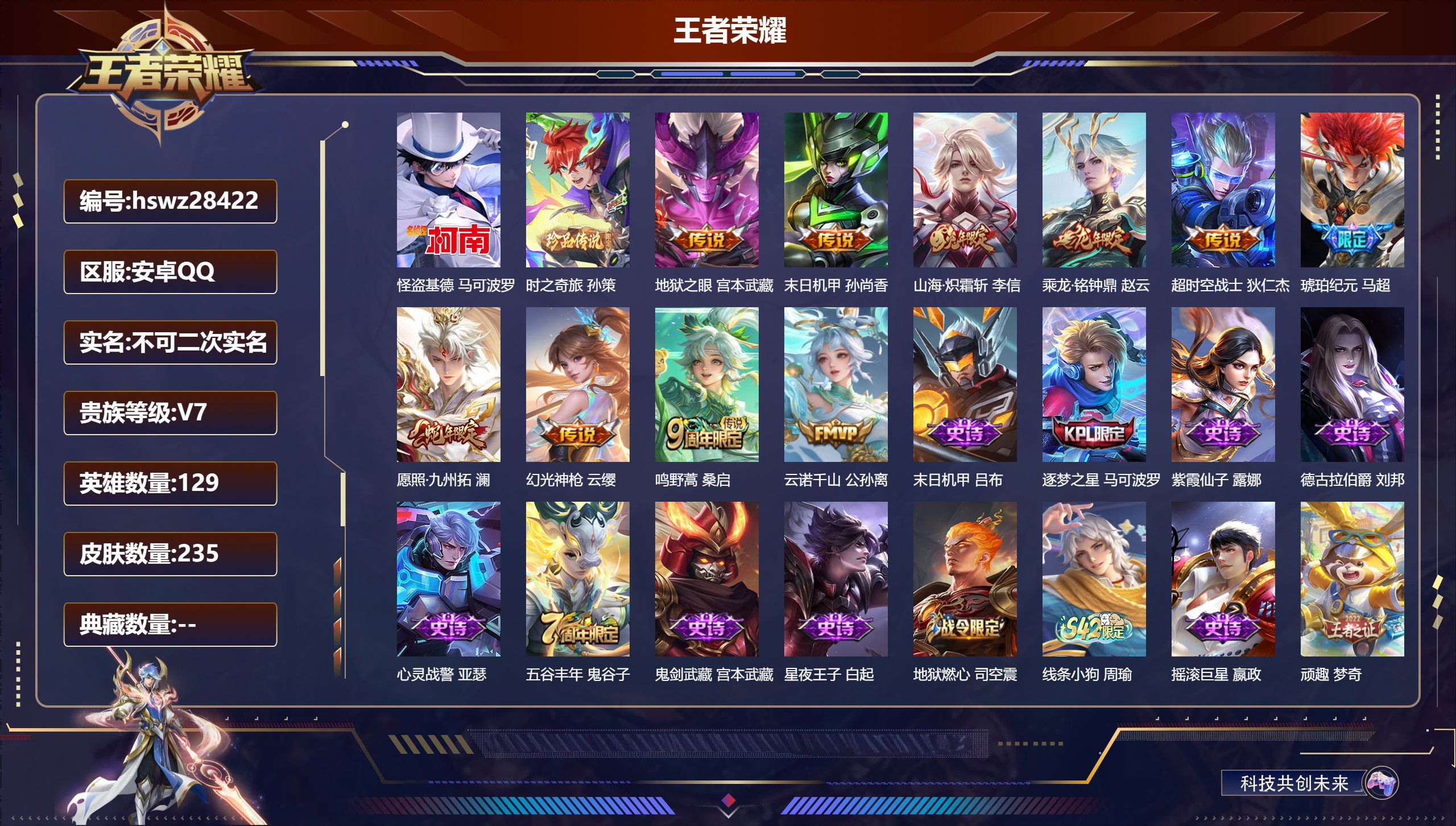 PX_2554598-【马可波罗怪盗基德,关羽赤影疾锋,韩信典藏,武则天】安卓Q-V2-至尊星耀V段位-130英雄-217皮肤-2典藏皮肤-1典藏英雄-1珍品传说-11传说-59史诗 【英雄全皮】:影全皮 【荣耀典藏】:武则天英雄,关羽赤影疾锋,韩信弑枪猎影 【珍品传说】:马可波罗怪盗基德 【传说皮肤】:司空震愿照山河定,桑启鸣野蒿,花木兰燃星之曲,李信山海炽霜斩,吕布怒海麟威,马超无双飞将,赵云淬星耀世,曜云鹰飞将,李信一念神魔,干将莫邪久胜战神,孙尚香末日机甲 【限定皮肤】:姜子牙天穹之誓,狄仁杰阴阳师,赵云皇家上将,孙尚香蔷薇恋人,元歌云间偶戏,元歌无心,马可波罗逐梦之星,狄仁杰魔术师,狄仁杰万华元夜,达摩沙漠行僧,项羽海滩派对,老夫子醍醐杖,程咬金演武夺筹,兰陵王金庭之子,花木兰燃星之曲,亚瑟潮玩骑士王,后羿辉光之辰,李元芳云中旅人,钟馗驱傩正仪,蔡文姬繁星吟游,鬼谷子原初探秘者,鬼谷子五谷丰年,苏烈千军破阵,梦奇顽趣,沈梦溪大漠名商,明世隐疑决卦,裴擒虎李小龙,裴擒虎擒涛扼浪,李信山海炽霜斩,上官婉儿梁祝,鲁班大师探海日志,桑启海盐诗旅,阿古朵江河有灵,张良古海寻踪,蒙恬荣光圣徽,鬼谷子天穹祈灯,姬小满妄想食味,刘邦剑破天穹,周瑜熔金海岸 【年限皮肤】:后羿辉光之辰,李信山海炽霜斩,司空震愿照山河定 【赛季限定】:明世隐疑决卦,老夫子醍醐杖,鬼谷子原初探秘者,狄仁杰万华元夜,程咬金演武夺筹,钟馗驱傩正仪,苏烈千军破阵,达摩沙漠行僧,兰陵王金庭之子,沈梦溪大漠名商,李元芳云中旅人,桑启海盐诗旅,裴擒虎擒涛扼浪,鲁班大师探海日志,张良古海寻踪,鬼谷子天穹祈灯,刘邦剑破天穹,姜子牙天穹之誓,东皇太一噬灭天穹,太乙真人谧流熔炉,钟馗虚灵犬护,甄姬逆浪荇歌,梦奇顽趣,蒙恬荣光圣徽,项羽九幽镇关 【战令限定】:元歌云间偶戏,亚瑟潮玩骑士王,孙膑茶境仙,马超访茗客,刘禅鸭鸭历险记,沈梦溪鸭鸭历险记,周瑜百相守梦,孙策百相守梦,周瑜线条小狗 【史诗皮肤】:周瑜线条小狗,项羽九幽镇关,公孙离涂山容容,黄忠百相守梦,周瑜百相守梦,后羿石田雨龙,狂铁龙之律动,刘禅鸭鸭历险记,亚连糖绘人间,赵怀真器灵浮梦炉,孙膑茶境仙,艾琳陌上桑,姬小满妄想食味,蒙恬荣光圣徽,阿古朵江河有灵,梦奇顽趣,元歌无心,鬼谷子五谷丰年,夏洛特永昼,沈梦溪月团寄思,杨戬天秀启明,元歌云间偶戏,裴擒虎李小龙,蔡文姬繁星吟游,上官婉儿梁祝,狄仁杰鹰眼统帅,阿轲节奏热浪,白起星夜王子,程咬金功夫厨神,李元芳逐浪之夏,刘禅天才门将,铠曙光守护者,后羿辉光之辰,安琪拉心灵骇客,雅典娜冰冠公主,马可波罗逐梦之星,兰陵王暗隐猎兽者,小乔缤纷独角兽,夏侯惇乘风破浪,刘邦德古拉伯爵,花木兰水晶猎龙者,吕布末日机甲,曹操幽灵船长,刘禅绅士熊喵,吕布圣诞狂欢,墨子金属风暴,墨子龙骑士,妲己女仆咖啡,妲己魅力维加斯,嬴政摇滚巨星,嬴政暗夜贵公子,孙尚香水果甜心,孙尚香蔷薇恋人,宫本武藏鬼剑武藏,狄仁杰魔术师,貂蝉圣诞恋歌,赵云未来纪元,赵云皇家上将,露娜紫霞仙子,鲁班七号电玩小子 【其他皮肤】:影百相守梦,兰陵王雾影缉谜,艾琳鹤鸣心笺,桑启青衿临川,鬼谷子克喵,莱西奥踏浪烽翎,孙策百相守梦,云中君云械蓝图,甄姬逆浪荇歌,白起死霸装,姬小满小满鸭,露娜命运加冕,阿古朵布丁狗之约,张良灵野札记,苏烈春野闲踪,沈梦溪鸭鸭历险记,钟馗虚灵犬护,刘备浪漫序章,戈娅玫蓝誓约,明世隐景韶洛都,姜子牙星梦巡礼,西施雪境奇遇,影魅影绮裳,马超访茗客,典韦铁骨偃魂,太乙真人谧流熔炉,苍苍林狼骑,吕布逐霄战戟,干将莫邪雾都夜雨,东皇太一噬灭天穹,周瑜熔金海岸,姜子牙天穹之誓,刘邦剑破天穹,廉颇功夫炙烤,海诺时空谍影,鬼谷子天穹祈灯,后羿完美运算,海月王牌新星,张良古海寻踪,李元芳妄想特派,姬小满零食大作战,鲁班大师探海日志,莱西奥西部游侠,太乙真人劲辣红锅,裴擒虎擒涛扼浪,赵怀真太极少年,白起乐园追猎者,猪八戒潮玩探月行,海月幻泉雾影,桑启海盐诗旅,李元芳云中旅人,蒙恬蔚蓝守将,沈梦溪大漠名商,兰陵王金庭之子,程咬金无双福将,达摩沙漠行僧,苏烈千军破阵,鲁班大师乓乓大师,钟馗驱傩正仪,张良缤纷绘卷,程咬金演武夺筹,杨戬次元傲视,刘禅秘密基地,亚瑟潮玩骑士王,狄仁杰万华元夜,鬼谷子原初探秘者,狂铁特工战影,老夫子醍醐杖,明世隐疑决卦,哪吒次元突破,沈梦溪鲨炮海盗猫,吕布野性能量,庄周奇妙博物学,明世隐虹云星官,项羽科学大爆炸,苏烈坚韧之力,鬼谷子幻乐之宴,李白敏锐之力,诸葛亮掌控之力,孙尚香沉稳之力,老夫子功夫老勺,钟无艳海滩丽影,关羽龙腾万里,刘备纽约教父,狄仁杰阴阳师,宫本武藏万象初新,甄姬花好人间,张飞五福同心,达摩拳王,亚瑟死亡骑士,典韦黄金武士,孙膑天使之翼,安琪拉玩偶对对碰,扁鹊救世之瞳,武则天东方不败,牛魔西部大镖客,白起白色死神,程咬金星际陆战队,芈月红桃皇后,赵云忍炎影,达摩大发明家,阿轲爱心护理,露娜哥特玫瑰,韩信街头霸王,韩信教廷特使,项羽海滩派对,暃碧珀绯影,金蝉前尘,云缨赤焰之缨,司空震启蛰,澜孤猎,蒙恬秩序猎龙将,镜冰刃幻境,马超幸存者,曜归虚梦演,云中君荷鲁斯之眼,盘古创世神祝,猪八戒年年有余,嫦娥露花倒影,李信灼热之刃,伽罗花见巫女,盾山极冰防御线,元歌午夜歌剧院,弈星踏雪寻梅,裴擒虎街头旋风,公孙离花间舞,女