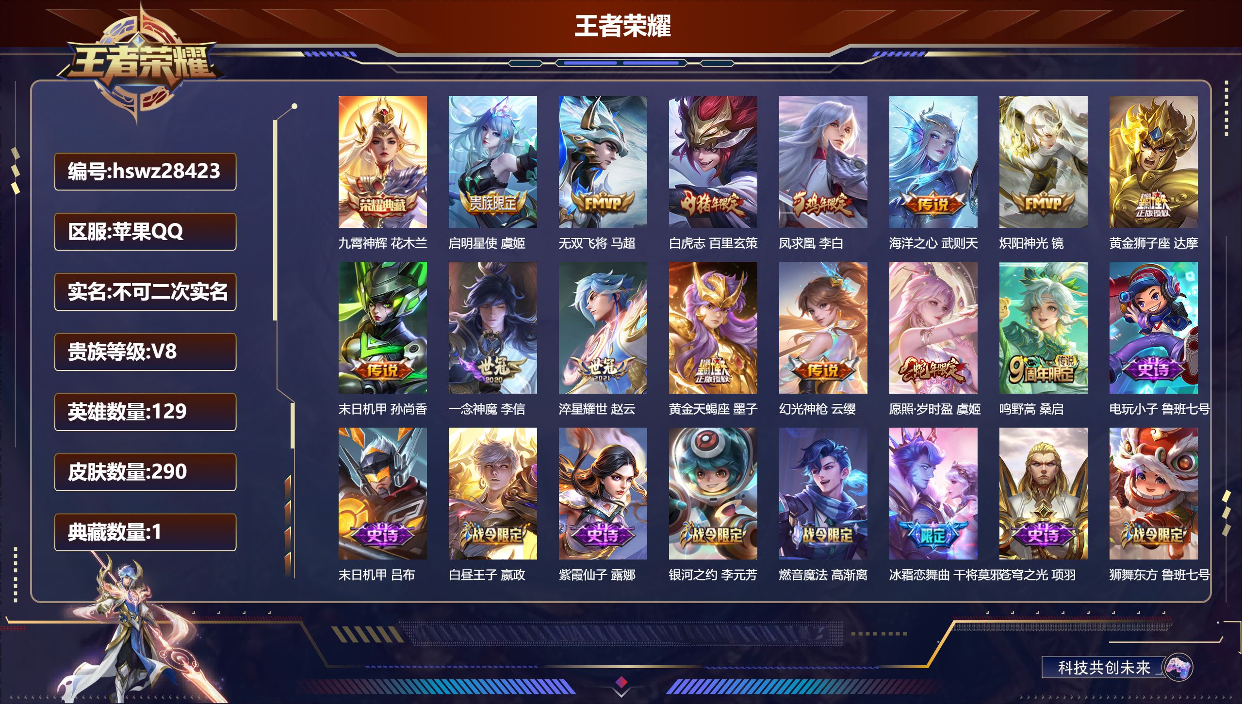 PX_2561747-Q/无双王者/290皮肤/129英雄/1典藏/0珍品无双/0无双/0珍品传说/14传说/87史诗/9稀有英雄 【1,典藏皮肤】九霄神辉,花木兰, 【14,传说皮肤】启明星使,虞姬,无双飞将,马超,白虎志,百里玄策,凤求凰,李白,海洋之心,武则天,炽阳神光,镜,黄金狮子座,达摩,末日机甲,孙尚香,一念神魔,李信,淬星耀世,赵云,黄金天蝎座,墨子,幻光神枪,云缨,愿照·岁时盈,虞姬,鸣野蒿,桑启, 【87,史诗皮肤】电玩小子,鲁班七号,末日机甲,吕布,白昼王子,嬴政,紫霞仙子,露娜,银河之约,李元芳,燃音魔法,高渐离,冰霜恋舞曲,干将莫邪,苍穹之光,项羽,狮舞东方,鲁班七号,妄想食味,姬小满,德古拉伯爵,刘邦,山海·玄木吟,马可波罗,心灵战警,亚瑟,鬼剑武藏,宫本武藏,星夜王子,白起,无限星赏官,公孙离,锁墨魂,钟馗,线条小狗,周瑜,遇见飞天,杨玉环,摇滚巨星,嬴政,电玩高手,狂铁,顽趣,梦奇,修罗,橘右京,魅力维加斯,妲己,黄金分割率,诸葛亮,如梦令,嫦娥,偶像歌手,王昭君,荣光圣徽,蒙恬,女仆咖啡,妲己,九幽镇关,项羽,星界游侠,暃,舞动绿茵,蔡文姬,暗夜贵公子,嬴政,鹰眼统帅,狄仁杰,飞衡,韩信,李小龙,裴擒虎,纤云弄巧,云中君,驯魔猎人,兰陵王,如梦令,后羿,金属风暴,墨子,特工魅影,百里守约,猫狗日记,孙策,原初追逐者,百里玄策,逐浪之夏,李元芳,未来纪元,赵云,黎明之约,雅典娜,优雅恋人,嬴政,魔术师,狄仁杰,热力回旋,百里玄策,神威,马超,皇家上将,赵云,至尊宝,孙悟空,功夫厨神,程咬金,梁祝,上官婉儿,天才门将,刘禅,圣诞恋歌,貂蝉,云间偶戏,元歌,水晶猎龙者,花木兰,破空之剑,亚连,烈魂,黄忠,圣诞狂欢,吕布,魅语,不知火舞,天狼绘梦者,上官婉儿,罗小黑战记,百里玄策,星界战将,牛魔,地狱岩魂,廉颇,冰雪圆舞曲,甄姬,青蛇,小乔,默契交锋,花木兰,月团寄思,沈梦溪,航海奇遇记,老夫子,千年之狐,李白,节奏热浪,阿轲,暗夜猫娘,阿轲,超时空战士,钟无艳,曙光守护者,铠,箭羽风息,伽罗,乱世虎臣,张飞,绅士熊喵,刘禅,缤纷独角兽,小乔,百相守梦,百里守约,蓝屏警告,典韦,水果甜心,孙尚香,化蝶舞,阿轲,幽灵船长,曹操,乘风破浪,夏侯惇,暗隐猎兽者,兰陵王, 【132,勇者皮肤】时空谍影,海诺,圆桌骑士,盾山,爱心护理,阿轲,大漠名商,沈梦溪,缤纷绘卷,张良,纽约教父,刘备,拳王,达摩,龙舞盛年,沈梦溪,丁香结,小乔,功夫炙烤,廉颇,沉稳之力,孙尚香,爱与正义,程咬金,海盐诗旅,桑启,幻泉雾影,海月,朔风刀,夏侯惇,醍醐杖,老夫子,朔望之晖,女娲,归虚梦演,孙膑,汉昭烈帝,刘备,热血海滩,哪吒,白色死神,白起,黑桃队长,鲁班七号,黄金武士,典韦,落雪兰心,甄姬,御旌,牛魔,阴阳师,狄仁杰,致命风华,阿轲,次元突破,哪吒,古海寻踪,张良,科学大爆炸,项羽,功夫老勺,老夫子,西部大镖客,牛魔,鲨炮海盗猫,沈梦溪,海滩派对,项羽,万华元夜,狄仁杰,演武夺筹,程咬金,奇妙博物学,庄周,猎兽之王,吕布,野性能量,吕布,哥特玫瑰,露娜,守护之力,大乔,无双福将,程咬金,瓷语鉴心,露娜,原初探秘者,鬼谷子,星空之诺,沈梦溪,潮玩探月行,猪八戒,天穹祈灯,鬼谷子,疑决卦,明世隐,如懿,安琪拉,化身博士,扁鹊,潮玩骑士王,亚瑟,阿尔法小队,后羿,五福同心,张飞,金色潮汐,朵莉亚,次元傲视,杨戬,幻乐之宴,鬼谷子,东方不败,武则天,霸王丸,宫本武藏,虹云星官,明世隐,赤刃凌霄,敖隐,赤莲之焰,周瑜,死亡骑士,亚瑟,浪漫序章,刘备,敏锐之力,李白,幽兰居士,张良,玩偶对对碰,安琪拉,海滩丽影,钟无艳,忍·炎影,赵云,雪境奇遇,西施,炽热元素使,姜子牙,坚韧之力,苏烈,万事如意,刘备,逐霄战戟,吕布,擒涛扼浪,裴擒虎,乓乓大师,鲁班大师,溯影追猎,虞姬,探海日志,鲁班大师,天使之翼,孙膑,雾都夜雨,干将莫邪,兔女郎,花木兰,龙腾万里,关羽,金庭之子,兰陵王,未来纪元,宫本武藏,荣光之誓,亚瑟,花好人间,甄姬,万象初新,宫本武藏,潮玩造梦师,刘备,御銮,盾山,时尚教父,姜子牙,秘密基地,刘禅,教廷特使,韩信,街头霸王,韩信,云中旅人,李元芳,西部大镖客,孙悟空,神迹守卫,墨子,进击墨子号,墨子,少女阿狸,妲己,灵卜魔法,妲己,混沌棋,弈星,御霄,米莱狄,蔚蓝守将,蒙恬,春野闲踪,苏烈,布丁狗之约,阿古朵,暖冬·兔眠,嫦娥,绒语心约,大乔,午后时光,王昭君,灵野札记,张良,驱傩正仪,钟馗,神迹守卫,钟馗,命运角斗场,狂铁,特工战影,狂铁,虚灵犬护,钟馗,御狮,狂铁,白执事,赵云,劲辣红锅,太乙真人,神迹守卫,孙悟空,剑破天穹,刘邦,铁骨偃魂,典韦,熔金海岸,周瑜,苍林狼骑,苍,天穹之誓,姜子牙,星梦巡礼,姜子牙,破阵·退雄兵,杨戬,谧流熔炉,太乙真人,群星魔术团,程咬金,暗都幽影,大司命,线条小狗,周瑜,百相守梦,老夫子,噬灭天穹,东皇太一,怪诞之夜,米莱狄,玫蓝誓约,戈娅,景韶洛都,明世隐, 【58,其他皮肤】金属狂潮,高渐离,前尘,金蝉,芝加哥教父,黄忠,潮流仙人,老夫子,三太子,哪吒,棒球奇才,沈梦溪,龙域领主,铠,生化警戒,钟无艳,死神来了,曹操,超能战警,曹操,花见巫女,伽罗,爱与和平,苏烈,第七人偶,干将莫邪,万圣前夜,小乔,灼热之刃,李信,海之征途,孙策,木偶奇遇记,鲁班七号,帝国元帅,项羽,精灵王,后羿,冰刃幻境,镜,海军大将,周瑜,星航指挥官,诸葛亮,魇语军师,司马懿,英喵野望,刘禅,午夜歌剧院,元歌,启蛰,司空震,隐刃,兰陵王,异域舞娘,貂蝉,街头旋风,裴擒虎,东海龙王,东皇太一,修竹墨客,上官婉儿,剑舞者,花木兰,范海辛,李白,维京掠夺者,苍,归虚梦演,蒙犽,激情绿茵,马可波罗,埃及法
