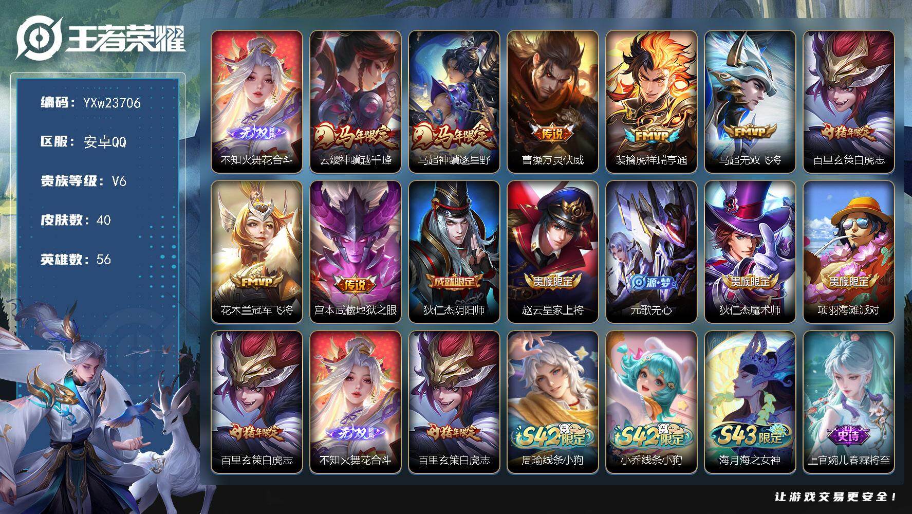 PX_2562056-??靓号·花合斗·神骥越千峰·神骥逐星野·万灵伏威·祥瑞亨通·无双飞将·白虎志·无二次包过】YXw23706-安卓Q-56英雄-40皮肤-1王者印记-180铭文-贵族积分1w【贵族6】【1无双·8传说·1按键】【因赛季更新游戏段付以上号为准!】 【英雄全皮】:孙权全皮 【无双皮肤】:不知火舞花合斗 【传说皮肤】:云缨神骥越千峰,马超神骥逐星野,曹操万灵伏威,裴擒虎祥瑞亨通,马超无双飞将,百里玄策白虎志,花木兰冠军飞将,宫本武藏地狱之眼 【限定皮肤】:狄仁杰阴阳师,赵云皇家上将,元歌无心,狄仁杰魔术师,项羽海滩派对,百里玄策白虎志,不知火舞花合斗 【年限皮肤】:百里玄策白虎志 【战令限定】:周瑜线条小狗,小乔线条小狗 【史诗皮肤】:海月海之女神,上官婉儿春霖将至,周瑜线条小狗,小乔线条小狗,狂铁龙之律动,元歌无心,狄仁杰鹰眼统帅,程咬金功夫厨神,花木兰水晶猎龙者,曹操幽灵船长,妲己魅力维加斯,狄仁杰魔术师,赵云皇家上将,露娜紫霞仙子 【其他皮肤】:影百相守梦,虞姬溯影追猎,孙权径山谋武,少司缘灵卦秘语,李白敏锐之力,狄仁杰阴阳师,后羿阿尔法小队,亚瑟死亡骑士,安琪拉玩偶对对碰,赵云忍炎影,韩信街头霸王,项羽海滩派对,司空震启蛰,李信灼热之刃,百里玄策威尼斯狂欢,铠龙域领主,项羽帝国元帅