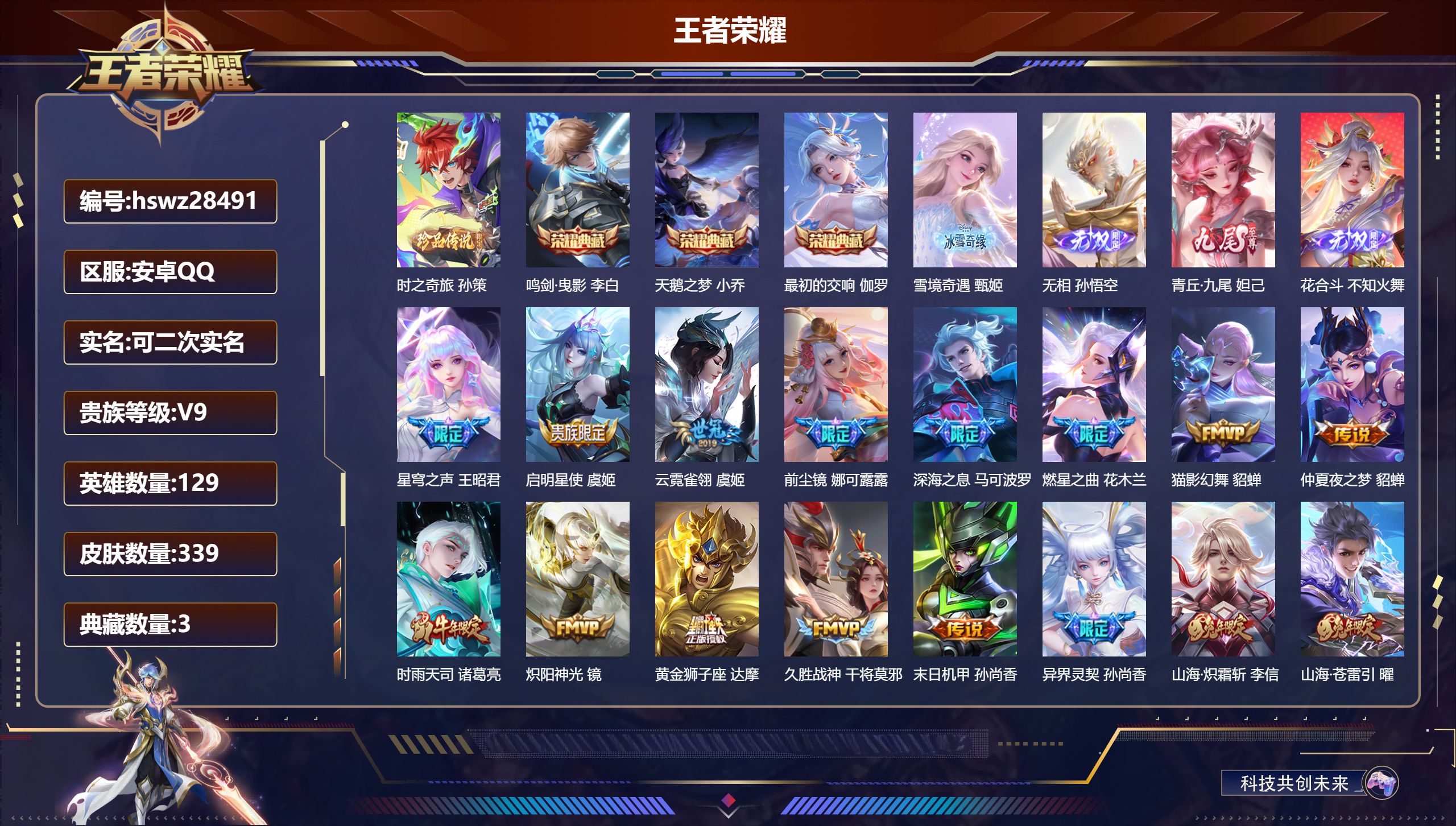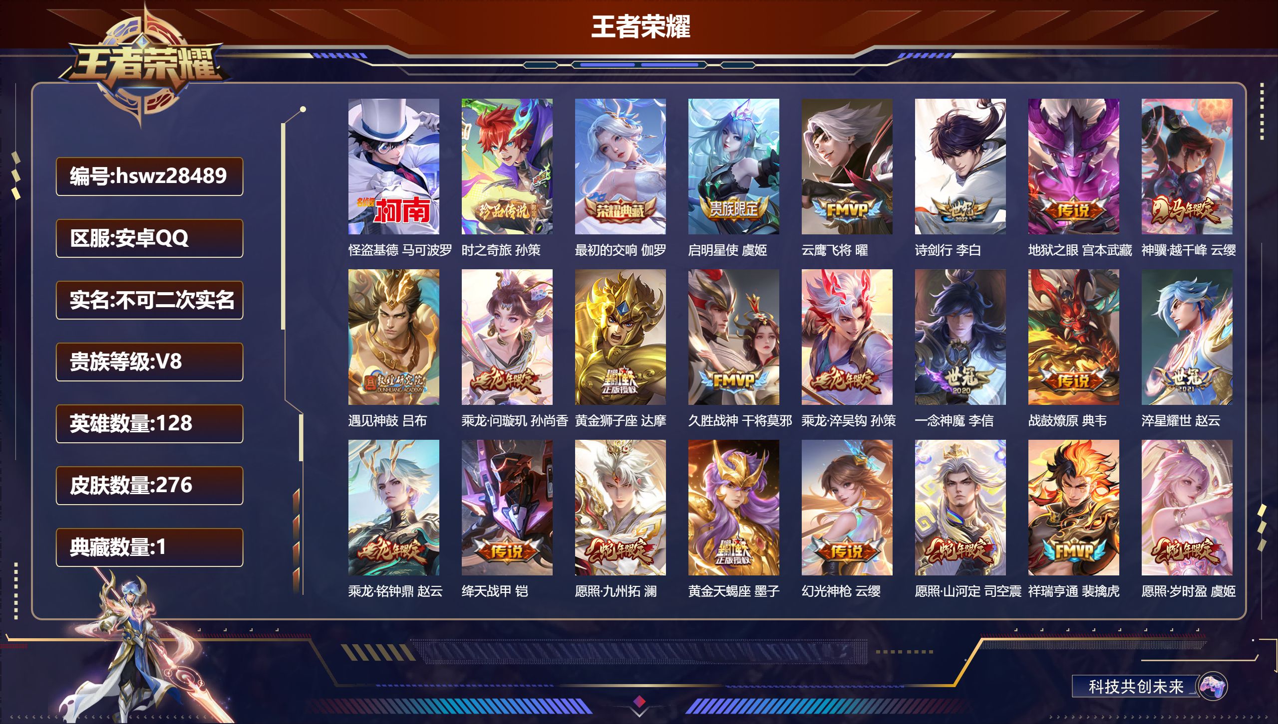 PX_2562033-,可二次,V8,贵族积分51736,安卓QQ/158皮肤/107英雄/0典藏/0珍品无双/0无双/0珍品传说/13传说/59史诗/7稀有英雄 【13,传说皮肤】,胖达荣荣,梦奇,启明星使,虞姬,云霓雀翎,虞姬,飞鸢探春,李元芳,猫影幻舞,貂蝉,仲夏夜之梦,貂蝉,祈雪灵祝,公孙离,时雨天司,诸葛亮,音你心动,周瑜,炽阳神光,镜,音你心动,小乔,太华,伽罗,黄金白羊座,张良, 【59,史诗皮肤】,电玩小子,鲁班七号,逐梦之星,马可波罗,紫霞仙子,露娜,银河之约,李元芳,云端筑梦师,庄周,暗影游猎,马可波罗,冰霜恋舞曲,干将莫邪,猫狗日记,大乔,心灵战警,亚瑟,诗语江南,西施,迷踪丽影,阿轲,星夜王子,白起,无限星赏官,公孙离,摇滚巨星,嬴政,魅力维加斯,妲己,黄金分割率,诸葛亮,如梦令,嫦娥,霸王别姬,虞姬,女仆咖啡,妲己,白蛇,大乔,晚萤,娜可露露,遇见神鹿,瑶,舞动绿茵,蔡文姬,繁星吟游,蔡文姬,暗夜贵公子,嬴政,鹰眼统帅,狄仁杰,胡桃异想国,米莱狄,白晶晶,芈月,李小龙,裴擒虎,纤云弄巧,云中君,驯魔猎人,兰陵王,奇迹圣诞,蔡文姬,特工魅影,百里守约,逐浪之夏,李元芳,时之彼端,妲己,魔术师,狄仁杰,热力回旋,百里玄策,皇家上将,赵云,冰冠公主,雅典娜,功夫厨神,程咬金,梁祝,上官婉儿,天才门将,刘禅,圣诞恋歌,貂蝉,云间偶戏,元歌,水晶猎龙者,花木兰,魅语,不知火舞,天狼运算者,孙膑,地狱岩魂,廉颇,蔷薇恋人,孙尚香,冰雪圆舞曲,甄姬,青蛇,小乔,节奏热浪,阿轲,曙光守护者,铠,心灵骇客,安琪拉,箭羽风息,伽罗,缤纷独角兽,小乔,时之恋人,孙尚香,水果甜心,孙尚香,狂想玩偶喵,蒙犽, 【47,勇者皮肤】,圆桌骑士,盾山,星际陆战队,达摩,沙漠行僧,达摩,缤纷绘卷,张良,丁香结,小乔,沉稳之力,孙尚香,朔风刀,夏侯惇,醍醐杖,老夫子,归虚梦演,孙膑,汉昭烈帝,刘备,白色死神,白起,黑桃队长,鲁班七号,夺宝奇兵,刘邦,阴阳师,狄仁杰,功夫老勺,老夫子,海滩派对,项羽,万华元夜,狄仁杰,制霸全明星,牛魔,演武夺筹,程咬金,红桃皇后,芈月,奇妙博物学,庄周,守护之力,大乔,瓷语鉴心,露娜,原初探秘者,鬼谷子,星空之诺,沈梦溪,西部大镖客,猪八戒,疑决卦,明世隐,潮玩骑士王,亚瑟,次元傲视,杨戬,虹云星官,明世隐,赤莲之焰,周瑜,死亡骑士,亚瑟,玩偶对对碰,安琪拉,海滩丽影,钟无艳,忍·炎影,赵云,天使之翼,孙膑,兔女郎,花木兰,千军破阵,苏烈,花好人间,甄姬,单词大作战,雅典娜,教廷特使,韩信,西部大镖客,孙悟空,重装意志,盘古,少女阿狸,妲己,混沌棋,弈星,幻想奇妙夜,王昭君,驱傩正仪,钟馗, 【40,其他皮肤】,伊势巫女,大乔,金属狂潮,高渐离,龙域领主,铠,生化警戒,钟无艳,死神来了,曹操,爱与和平,苏烈,未来旅行,孙膑,第七人偶,干将莫邪,万圣前夜,小乔,灼热之刃,李信,熊喵少女,阿古朵,绯红之刃,露娜,冰刃幻境,镜,星航指挥官,诸葛亮,魇语军师,司马懿,午夜歌剧院,元歌,霓裳曲,杨玉环,花间舞,公孙离,异域舞娘,貂蝉,东海龙王,东皇太一,修竹墨客,上官婉儿,剑舞者,花木兰,范海辛,李白,归虚梦演,蒙犽,激情绿茵,马可波罗,归虚梦演,西施,阿摩司公爵,鬼谷子,尼罗河女神,女娲,一千零一夜,张良,蔷薇王座,蔡文姬,森,瑶,加勒比小姐,虞姬,踏雪寻梅,弈星,仙境爱丽丝,妲己,精准探案法,米莱狄,精灵公主,王昭君,露花倒影,嫦娥,地府判官,钟馗,美梦成真,梦奇,西部大镖客,孙悟空, 【7,稀有英雄】,嬴政,不知火舞,橘右京,夏洛特,娜可露露,韩信,艾琳, 营地ID:,