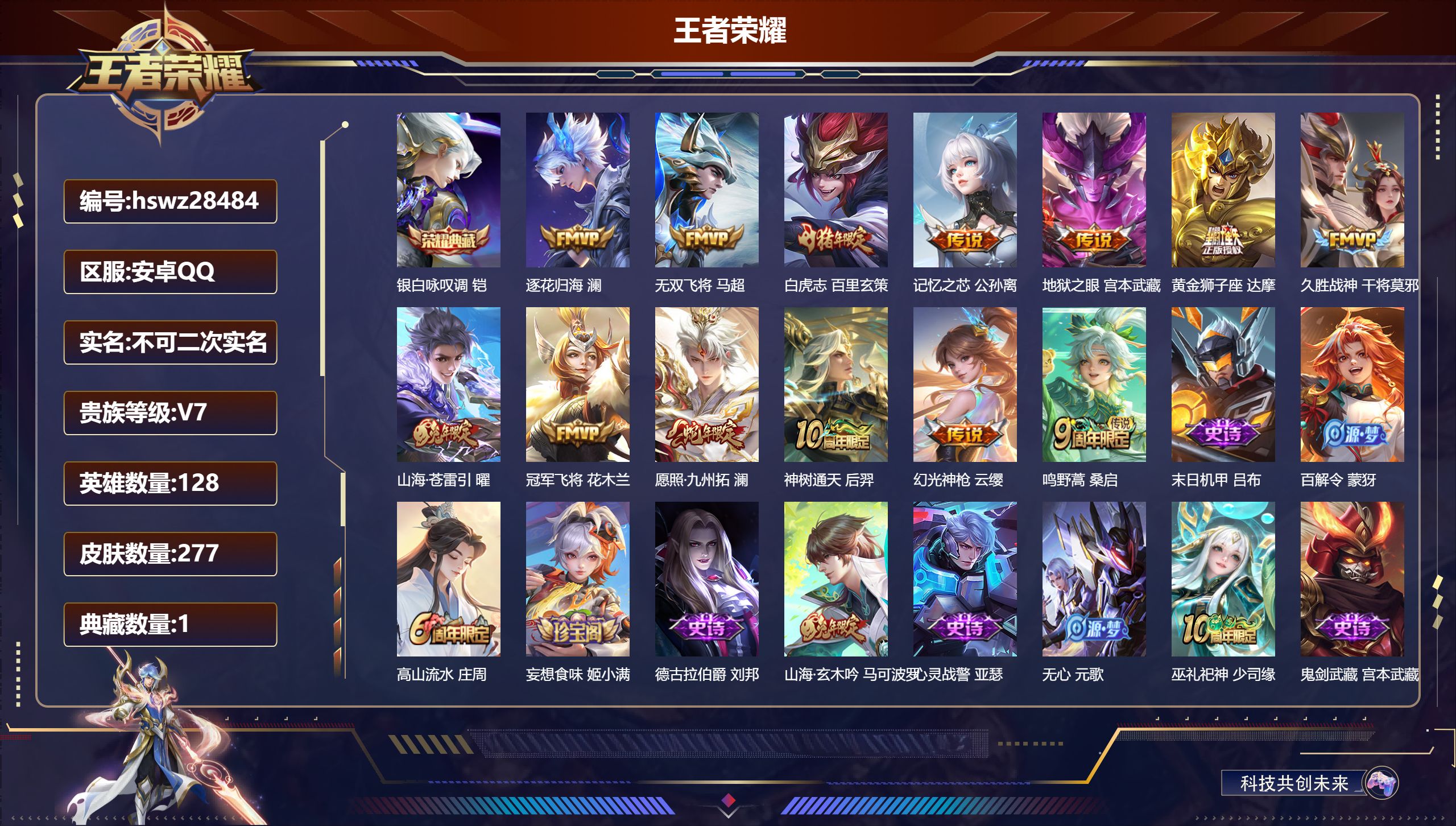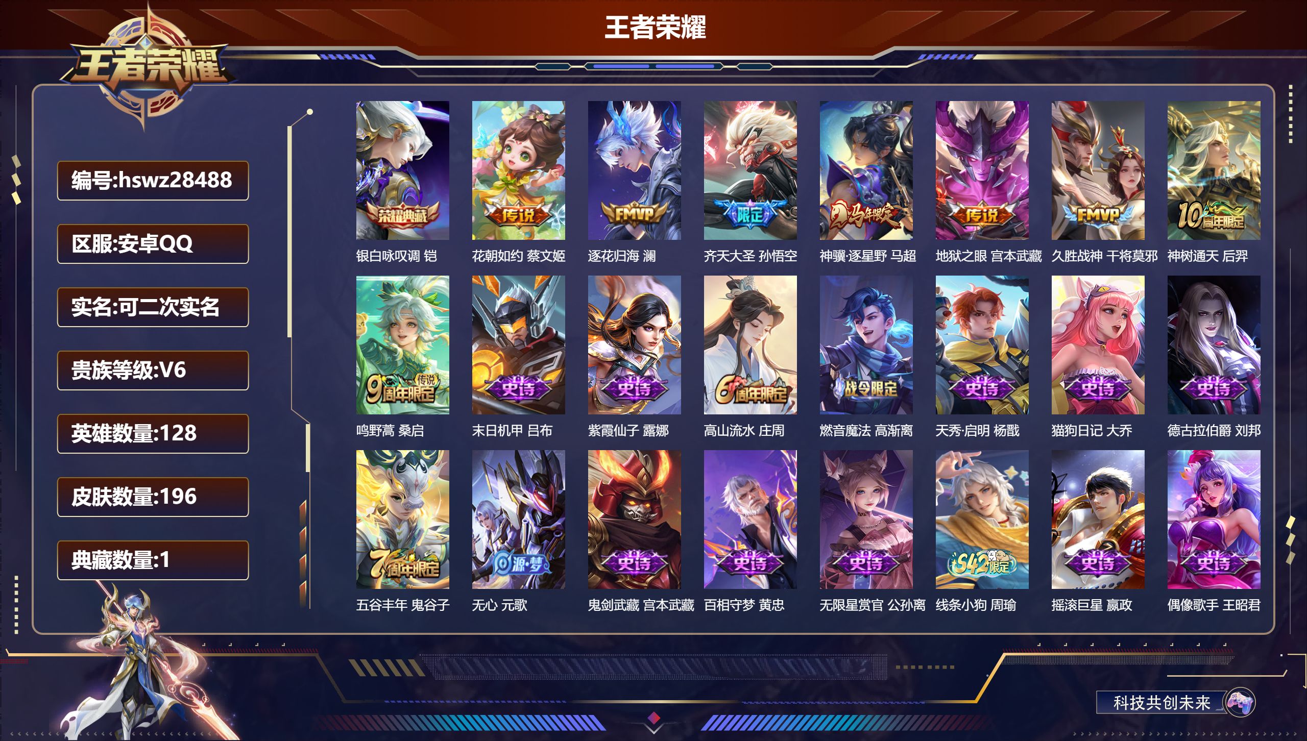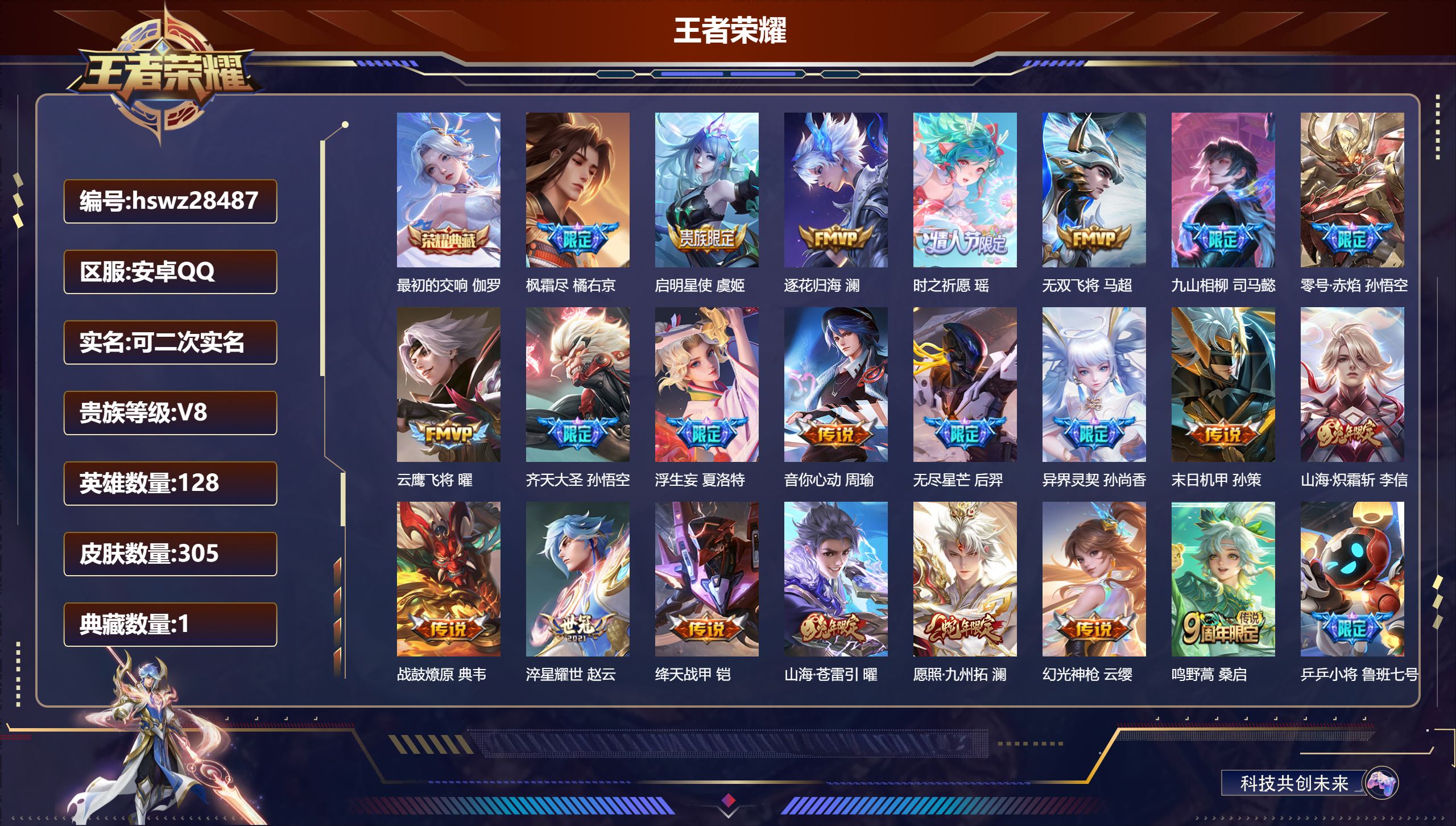 PX_2562010-,可二次,V8,贵族积分61468,安卓QQ/291皮肤/128英雄/2典藏/0珍品无双/0无双/0珍品传说/16传说/100史诗/8稀有英雄 【2,星传说皮肤】,零号雷霆,孙悟空,幽冥之眼,宫本武藏, 【2,典藏皮肤】,鸣剑·曳影,李白,弑枪猎影,韩信, 【16,传说皮肤】,启明星使,虞姬,逐花归海,澜,无双飞将,马超,李逍遥,,曜,零号·赤焰,孙悟空,游龙清影,西施,地狱之眼,宫本武藏,怒海麟威,吕布,挚爱之约,孙策,黄金狮子座,达摩,久胜战神,干将莫邪,末日机甲,孙策,山海·炽霜斩,李信,一念神魔,李信,神树通天,后羿,鸣野蒿,桑启, 【100,史诗皮肤】,乒乒小将,鲁班七号,时之奇旅,安琪拉,电玩小子,鲁班七号,末日机甲,吕布,紫霞仙子,露娜,百解令,蒙犽,高山流水,庄周,暗渊魔法,司马懿,匿光决锋者,夏侯惇,苍穹之光,项羽,天秀·启明,杨戬,猫狗日记,大乔,妄想食味,姬小满,德古拉伯爵,刘邦,山海·玄木吟,马可波罗,心灵战警,亚瑟,五谷丰年,鬼谷子,无心,元歌,鬼剑武藏,宫本武藏,星夜王子,白起,千筹问战,张良,地狱燃心,司空震,线条小狗,周瑜,摇滚巨星,嬴政,电玩高手,狂铁,修罗,橘右京,拒霜思,嫦娥,魅力维加斯,妲己,乐园奇幻夜,钟馗,偶像歌手,王昭君,荣光圣徽,蒙恬,女仆咖啡,妲己,赏金猎手,澜,九幽镇关,项羽,星界游侠,暃,晚萤,娜可露露,舞动绿茵,蔡文姬,暗夜贵公子,嬴政,鹰眼统帅,狄仁杰,胡桃异想国,米莱狄,大圣娶亲,孙悟空,李小龙,裴擒虎,纤云弄巧,云中君,如梦令,后羿,龙骑士,墨子,金属风暴,墨子,逐梦之影,韩信,特工魅影,百里守约,猫狗日记,孙策,原初追逐者,百里玄策,逐浪之夏,李元芳,奇幻香踪,扁鹊,未来纪元,赵云,灵蛊蚀心,扁鹊,朱雀志,百里守约,石田雨龙,后羿,优雅恋人,嬴政,驭风魔法,戈娅,魔术师,狄仁杰,热力回旋,百里玄策,神威,马超,顽岩魄,蒙犽,皇家上将,赵云,冰冠公主,雅典娜,功夫厨神,程咬金,梁祝,上官婉儿,电玩·爆裂旋风,刘禅,天才门将,刘禅,圣诞恋歌,貂蝉,云间偶戏,元歌,水晶猎龙者,花木兰,涂山容容,公孙离,圣诞狂欢,吕布,罗小黑战记,百里玄策,白龙吟,韩信,圣诞老人,老夫子,星界战将,牛魔,地狱岩魂,廉颇,蔷薇恋人,孙尚香,冰雪圆舞曲,甄姬,火炮绅士,黄忠,月团寄思,沈梦溪,航海奇遇记,老夫子,千年之狐,李白,节奏热浪,阿轲,超时空战士,钟无艳,曙光守护者,铠,万灵启世,女娲,心灵骇客,安琪拉,箭羽风息,伽罗,乱世虎臣,张飞,吟游魔法,明世隐,绅士熊喵,刘禅,缤纷独角兽,小乔,天狼狩猎者,裴擒虎,真爱魔法,干将莫邪,水果甜心,孙尚香,幽灵船长,曹操,乘风破浪,夏侯惇,暗隐猎兽者,兰陵王, 【126,勇者皮肤】,时空谍影,海诺,玲珑珍味,西施,圆桌骑士,盾山,爱心护理,阿轲,星际陆战队,达摩,沙漠行僧,达摩,大漠名商,沈梦溪,缤纷绘卷,张良,纽约教父,刘备,拳王,达摩,大发明家,达摩,龙舞盛年,沈梦溪,丁香结,小乔,功夫炙烤,廉颇,沉稳之力,孙尚香,幻夜卜梦,芈月,海盐诗旅,桑启,醍醐杖,老夫子,归虚梦演,孙膑,汉昭烈帝,刘备,白色死神,白起,黄金武士,典韦,落雪兰心,甄姬,阴阳师,狄仁杰,次元突破,哪吒,古海寻踪,张良,功夫老勺,老夫子,西部大镖客,牛魔,鲨炮海盗猫,沈梦溪,海滩派对,项羽,万华元夜,狄仁杰,踏浪烽翎,莱西奥,演武夺筹,程咬金,奇妙博物学,庄周,西部游侠,莱西奥,野性能量,吕布,哥特玫瑰,露娜,守护之力,大乔,无双福将,程咬金,瓷语鉴心,露娜,百相守梦,影,原初探秘者,鬼谷子,潮玩探月行,猪八戒,天穹祈灯,鬼谷子,决胜大满贯,曹操,疑决卦,明世隐,化身博士,扁鹊,潮玩骑士王,亚瑟,阿尔法小队,后羿,五福同心,张飞,夜都怪侠,白起,星际陆战队,程咬金,幻乐之宴,鬼谷子,东方不败,武则天,霸王丸,宫本武藏,虹云星官,明世隐,潮玩牛仔,马可波罗,救世之瞳,扁鹊,潮玩骑兵,杨戬,死亡骑士,亚瑟,敏锐之力,李白,破局者,亚连,玩偶对对碰,安琪拉,掌控之力,诸葛亮,海滩丽影,钟无艳,圣弓游侠,后羿,忍·炎影,赵云,雪境奇遇,西施,炽热元素使,姜子牙,坚韧之力,苏烈,唤灵魔甲,刘禅,万事如意,刘备,擒涛扼浪,裴擒虎,乓乓大师,鲁班大师,探海日志,鲁班大师,天使之翼,孙膑,雾都夜雨,干将莫邪,兔女郎,花木兰,龙腾万里,关羽,流音漫舞,艾琳,金庭之子,兰陵王,千军破阵,苏烈,荣光之誓,亚瑟,花好人间,甄姬,万象初新,宫本武藏,聚星闪耀,钟无艳,秘密基地,刘禅,教廷特使,韩信,街头霸王,韩信,云中旅人,李元芳,妄想特派,李元芳,神迹守卫,墨子,重装意志,盘古,少女阿狸,妲己,蔚蓝守将,蒙恬,布丁狗之约,阿古朵,暖冬·兔眠,嫦娥,命运加冕,露娜,午后时光,王昭君,小满鸭,姬小满,幻想奇妙夜,王昭君,灵野札记,张良,驱傩正仪,钟馗,命运角斗场,狂铁,死霸装,白起,特工战影,狂铁,虚灵犬护,钟馗,漠中幻影,嫦娥,白执事,赵云,劲辣红锅,太乙真人,剑破天穹,刘邦,铁骨偃魂,典韦,熔金海岸,周瑜,苍林狼骑,苍,天穹之誓,姜子牙,星梦巡礼,姜子牙,破阵·退雄兵,杨戬,谧流熔炉,太乙真人,群星魔术团,程咬金,鹤鸣心笺,艾琳,锦麟游梦,庄周,逆浪荇歌,甄姬,海之女神,海月,线条小狗,周瑜,噬灭天穹,东皇太一,敬我三分,盘古, 【48,其他皮肤】,金属狂潮,高渐离,前尘,金蝉,圣殿之光,刘邦,芝加哥教父,黄忠,潮流仙人,老夫子,棒球奇才,沈梦溪,极冰防御线,盾山,龙域领主,铠,生化警戒,钟无艳,死神来了,曹操,超能战警,曹操,花见巫女,伽罗,第七人偶,干将莫邪,灼热之刃,李信,熊喵少女,阿古朵,海之征途,孙策,木偶奇遇记,鲁班七号,冰刃幻境,镜,碧珀绯影,暃,魇语军师,司马懿,午