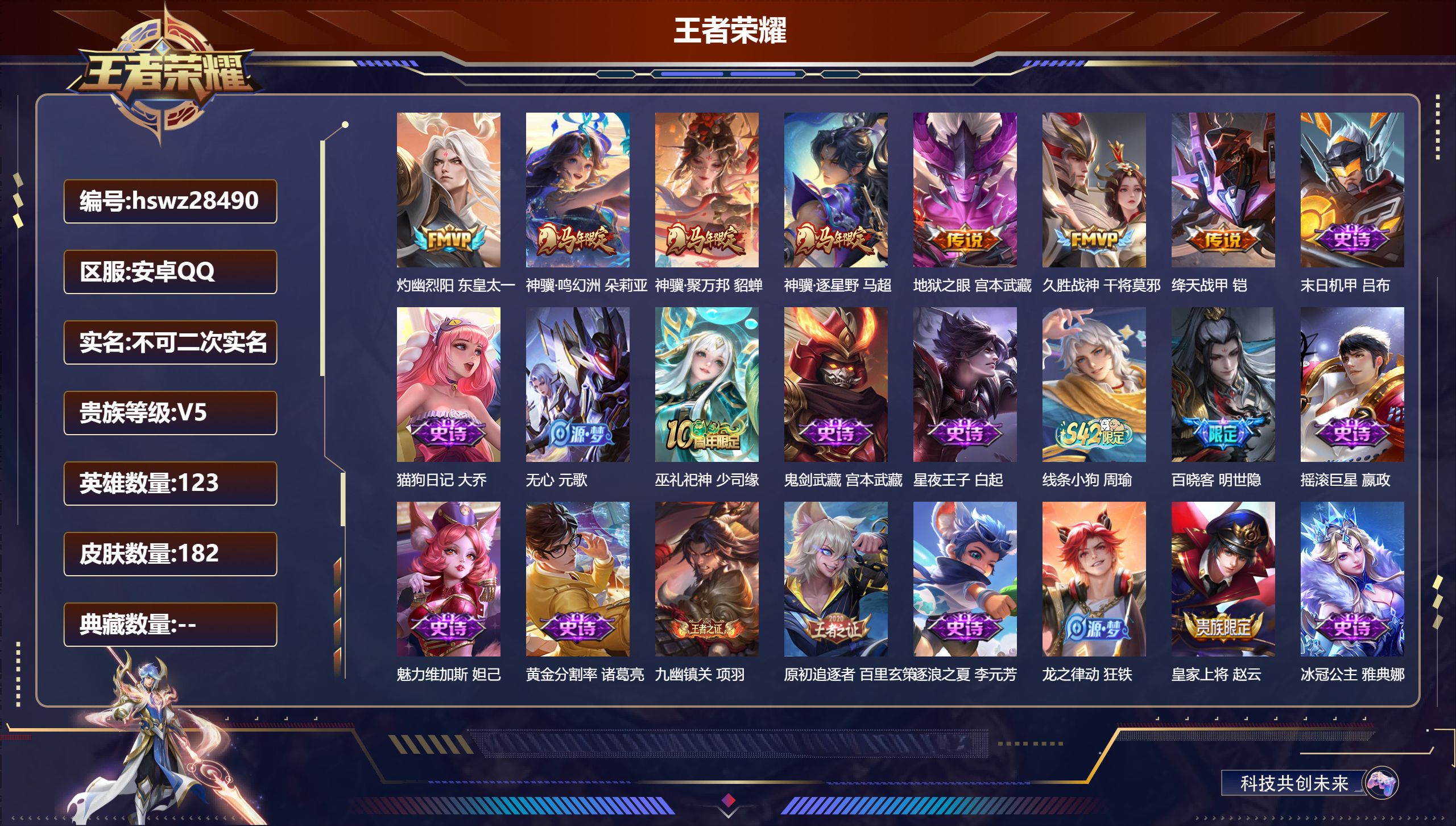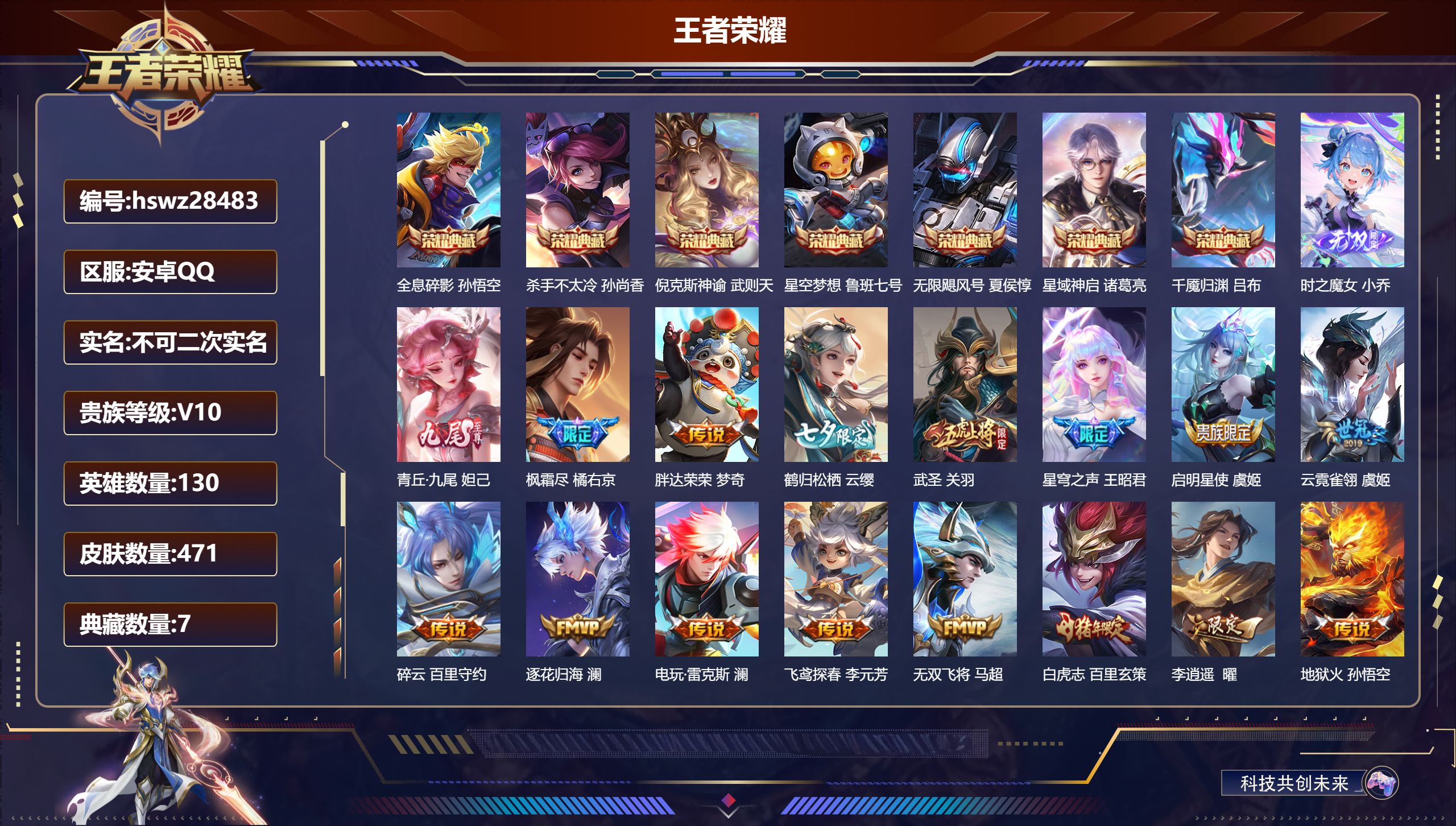 PX_2562006-,可二次,V8,贵族积分73348,安卓QQ/314皮肤/129英雄/2典藏/0珍品无双/0无双/1珍品传说/23传说/83史诗/9稀有英雄 【1,星传说皮肤】,星际治安官,狄仁杰, 【1,珍品传说】,时之奇旅,孙策, 【2,典藏皮肤】,银白咏叹调,铠,赤影疾锋,关羽, 【23,传说皮肤】,启明星使,虞姬,逐花归海,澜,云鹰飞将,曜,神器·狴犴令,狄仁杰,落雪白狼,亚连,黄金射手座,后羿,乘龙·问璇玑,孙尚香,久胜战神,干将莫邪,乘龙·淬吴钩,孙策,一念神魔,李信,乘龙·铭钟鼎,赵云,绛天战甲,铠,超时空战士,狄仁杰,愿照·九州拓,澜,群星魔术团,云中君,愿照·众生和,妲己,愿照·福禄聚,蔡文姬,幻光神枪,云缨,愿照·山河定,司空震,愿照·岁时盈,虞姬,愿照·千秋盛,女娲,鸣野蒿,桑启,云诺千山,公孙离, 【83,史诗皮肤】,电玩小子,鲁班七号,末日机甲,吕布,白昼王子,嬴政,蔬乡物语,鲁班七号,紫霞仙子,露娜,百解令,蒙犽,银河之约,李元芳,雪夜绮愿,周瑜,乘龙·忆丹青,大乔,暗影游猎,马可波罗,燃音魔法,高渐离,苍穹之光,项羽,狮舞东方,鲁班七号,德古拉伯爵,刘邦,山海·玄木吟,马可波罗,心灵战警,亚瑟,五谷丰年,鬼谷子,无心,元歌,鬼剑武藏,宫本武藏,星夜王子,白起,无限星赏官,公孙离,地狱燃心,司空震,线条小狗,周瑜,遇见飞天,杨玉环,摇滚巨星,嬴政,拒霜思,嫦娥,魅力维加斯,妲己,黄金分割率,诸葛亮,荣光圣徽,蒙恬,鹰眼统帅,狄仁杰,纤云弄巧,云中君,金属风暴,墨子,匿光侦查者,李元芳,猫狗日记,孙策,逐浪之夏,李元芳,奇幻香踪,扁鹊,未来纪元,赵云,引擎之心,赵云,灵蛊蚀心,扁鹊,优雅恋人,嬴政,驭风魔法,戈娅,魔术师,狄仁杰,龙之律动,狂铁,皇家上将,赵云,冰冠公主,雅典娜,功夫厨神,程咬金,电玩·爆裂旋风,刘禅,天才门将,刘禅,圣诞恋歌,貂蝉,水晶猎龙者,花木兰,决胜骁骑,关羽,破空之剑,亚连,心动手记,海诺,怒海争锋,黄忠,圣诞狂欢,吕布,青焰无极,镜,魅语,不知火舞,群星魔术团,上官婉儿,器灵·浮梦炉,赵怀真,浮光幕影,芈月,天狼运算者,孙膑,星界战将,牛魔,地狱岩魂,廉颇,茶境仙,孙膑,冰雪圆舞曲,甄姬,千年之狐,李白,曙光守护者,铠,乘龙·聚宝船,安琪拉,箭羽风息,伽罗,乱世虎臣,张飞,琥珀纪元,伽罗,绅士熊喵,刘禅,缤纷独角兽,小乔,百相守梦,百里守约,蓝屏警告,典韦,水果甜心,孙尚香,化蝶舞,阿轲,江河有灵,阿古朵,狼魂孤将,苍,绮世丹青,狄仁杰,幽灵船长,曹操,乘风破浪,夏侯惇,暗隐猎兽者,兰陵王, 【133,勇者皮肤】,时空谍影,海诺,玲珑珍味,西施,胡桃夹子,干将莫邪,圆桌骑士,盾山,爱心护理,阿轲,太极少年,赵怀真,沙漠行僧,达摩,大漠名商,沈梦溪,暖冬絮语,程咬金,纽约教父,刘备,拳王,达摩,大发明家,达摩,龙舞盛年,沈梦溪,乐园追猎者,白起,功夫炙烤,廉颇,海盐诗旅,桑启,幻泉雾影,海月,归虚梦演,孙膑,白色死神,白起,黄金武士,典韦,王牌新星,海月,阴阳师,狄仁杰,径山谋武,孙权,次元突破,哪吒,古海寻踪,张良,牛运亨通,牛魔,功夫老勺,老夫子,西部大镖客,牛魔,鲨炮海盗猫,沈梦溪,海滩派对,项羽,完美运算,后羿,红桃皇后,芈月,西部游侠,莱西奥,野性能量,吕布,哥特玫瑰,露娜,守护之力,大乔,无双福将,程咬金,瓷语鉴心,露娜,潮玩探月行,猪八戒,鸿运当头,亚瑟,天穹祈灯,鬼谷子,决胜大满贯,曹操,化身博士,扁鹊,阿尔法小队,后羿,无尽旅途,扁鹊,五福同心,张飞,金色潮汐,朵莉亚,幻乐之宴,鬼谷子,虹云星官,明世隐,雾影缉谜,兰陵王,救世之瞳,扁鹊,潮玩骑兵,杨戬,死亡骑士,亚瑟,浪漫序章,刘备,胡桃狂想曲,蒙犽,破局者,亚连,幽兰居士,张良,玩偶对对碰,安琪拉,掌控之力,诸葛亮,海滩丽影,钟无艳,坚韧之力,苏烈,唤灵魔甲,刘禅,万事如意,刘备,逐霄战戟,吕布,擒涛扼浪,裴擒虎,溯影追猎,虞姬,探海日志,鲁班大师,女武神,艾琳,天使之翼,孙膑,雾都夜雨,干将莫邪,兔女郎,花木兰,龙腾万里,关羽,流音漫舞,艾琳,金庭之子,兰陵王,幻夜行动,兰陵王,未来纪元,宫本武藏,零食大作战,姬小满,荣光之誓,亚瑟,花好人间,甄姬,万象初新,宫本武藏,聚星闪耀,钟无艳,潮玩造梦师,刘备,时尚教父,姜子牙,春野之旅,钟无艳,秘密基地,刘禅,教廷特使,韩信,街头霸王,韩信,云中旅人,李元芳,妄想特派,李元芳,西部大镖客,孙悟空,神迹守卫,墨子,蔬乡物语,李元芳,少女阿狸,妲己,灵卜魔法,妲己,蔚蓝守将,蒙恬,春野闲踪,苏烈,契约魔法,米莱狄,布丁狗之约,阿古朵,暖冬·兔眠,嫦娥,命运加冕,露娜,幻想奇妙夜,王昭君,灵野札记,张良,命运角斗场,狂铁,特工战影,狂铁,虚灵犬护,钟馗,漠中幻影,嫦娥,白执事,赵云,劲辣红锅,太乙真人,神迹守卫,孙悟空,剑破天穹,刘邦,异域游侠,刘备,苍威无极,项羽,铁骨偃魂,典韦,熔金海岸,周瑜,苍林狼骑,苍,长夏之忆,貂蝉,访茗客,马超,星梦巡礼,姜子牙,破阵·退雄兵,杨戬,谧流熔炉,太乙真人,金福满堂,东皇太一,群星魔术团,程咬金,经纬探寻者,盘古,暗都幽影,大司命,夏日便利店,虞姬,线条小狗,周瑜,线条小狗,桑启,百相守梦,老夫子,噬灭天穹,东皇太一,灵卦秘语,少司缘,爆裂喵拳,达摩,玫蓝誓约,戈娅,景韶洛都,明世隐, 【76,其他皮肤】,伊势巫女,大乔,金属狂潮,高渐离,前尘,金蝉,战争骑士,夏侯惇,圣殿之光,刘邦,芝加哥教父,黄忠,潮流仙人,老夫子,三太子,哪吒,棒球奇才,沈梦溪,极冰防御线,盾山,龙域领主,铠,生化警戒,钟无艳,死神来了,曹操,花见巫女,伽罗,未来旅行,孙膑,第七人偶,干将莫邪,万圣前夜,小乔,灼热之刃,李信,熊喵少女,阿古朵,海