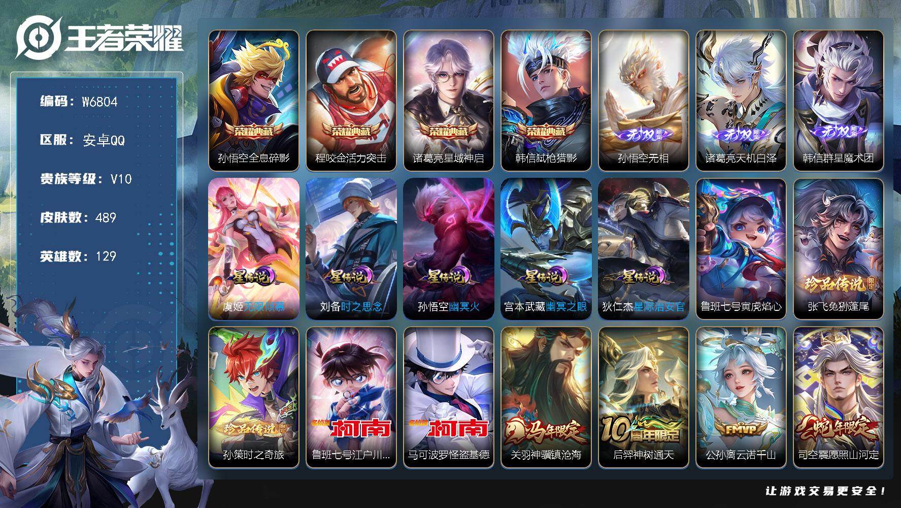 PX_2561828-【W6804】安卓Q区-可二次-贵10-129英雄-489皮肤-4典藏-3无双-4珍品传说-65传说-4专属播报-6星元-61按键-1天幕-满(蛇/鸡)年限定套-弑枪猎影/星域神启/活力突击/全息碎影/无相/天机白泽/群星魔术团/怪盗基德/江户川柯南/神骥·镇沧海/白虎志/至尊宝/东方月初/天魔缭乱-贵族积分24W-营地ID:1799684504 【星元皮肤】:虞姬无限倾慕,鲁班七号寅虎焰心,刘备时之思念,宫本武藏幽冥之眼,孙悟空幽冥火,狄仁杰星际治安官