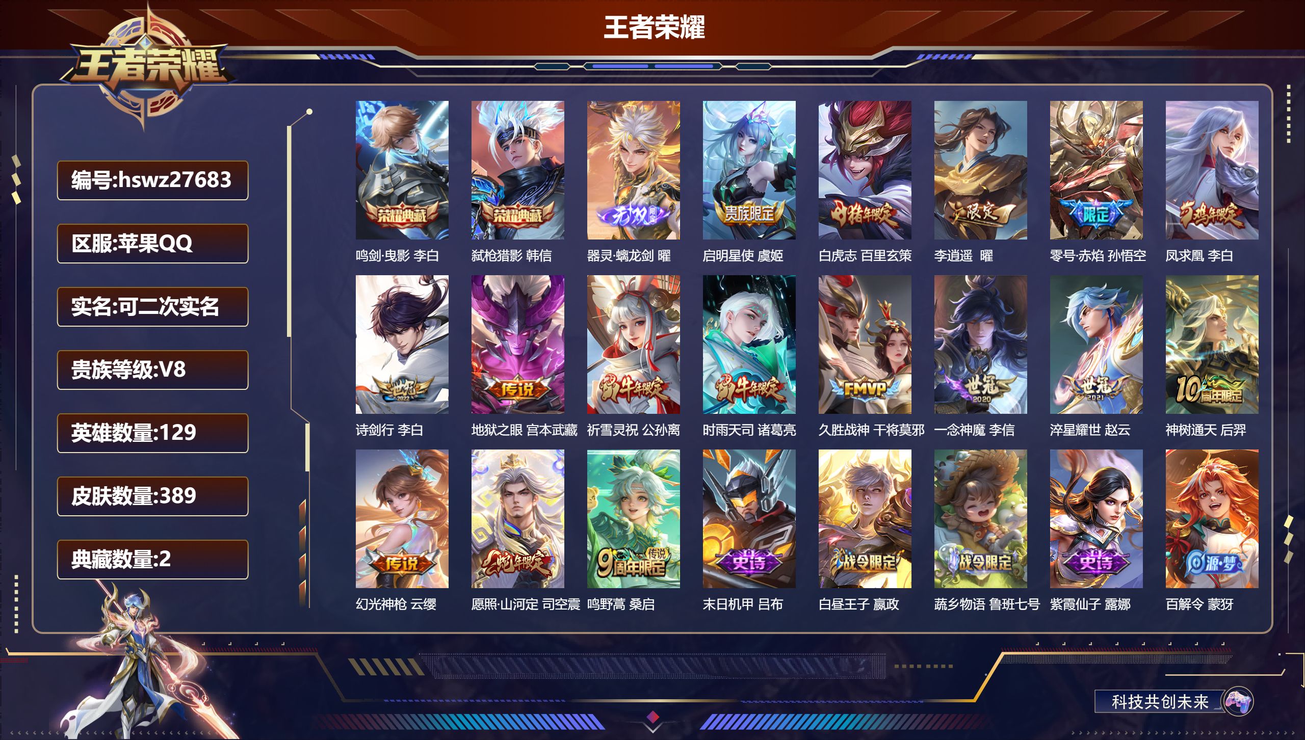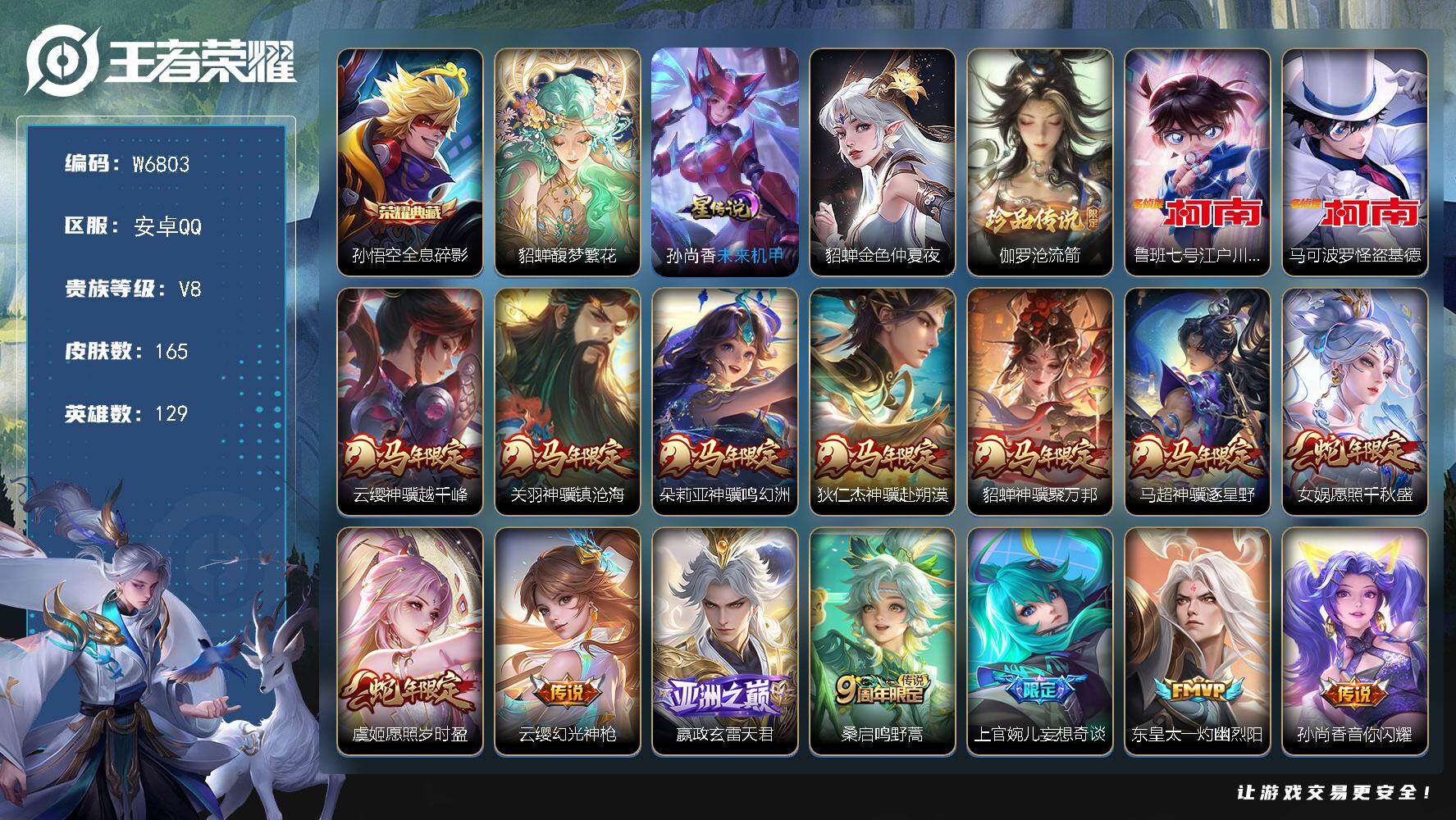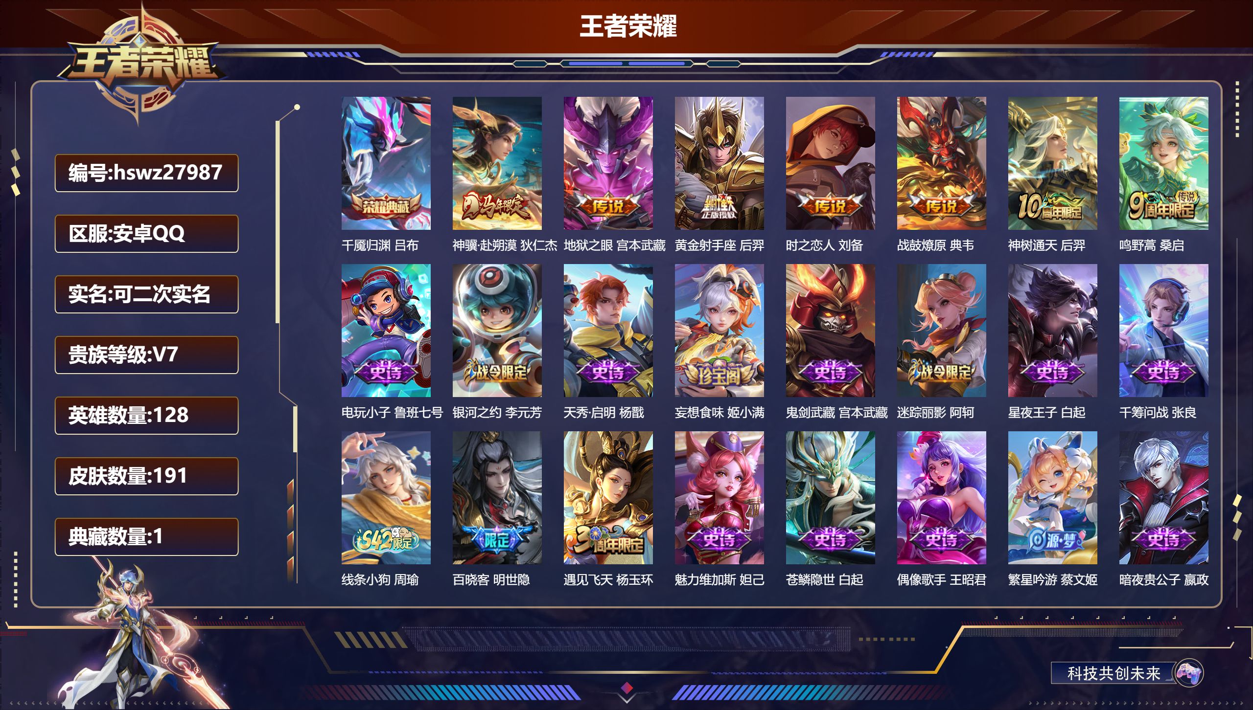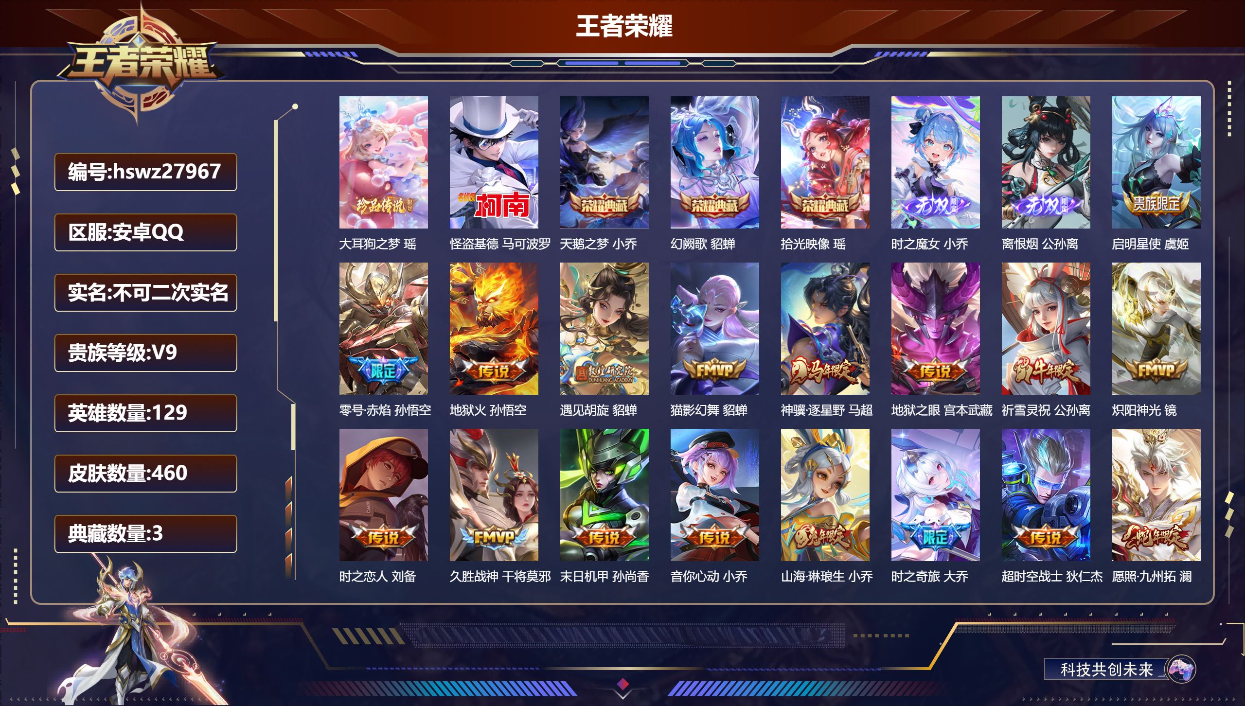 PX_2561822-【W6803】安卓Q区-可二次-贵8-129英雄-165皮肤-1珍品无双-2典藏(1水晶)-3珍品传说-25传说-2星元-8按键-满马年限定套-馥梦繁花/沧流箭/全息碎影/怪盗基德/江户川柯南/愿照·千秋盛/愿照·岁时盈/末日机甲-贵族积分6.9W-营地ID:476932497 【星元皮肤】:孙尚香未来机甲,貂蝉金色仲夏夜