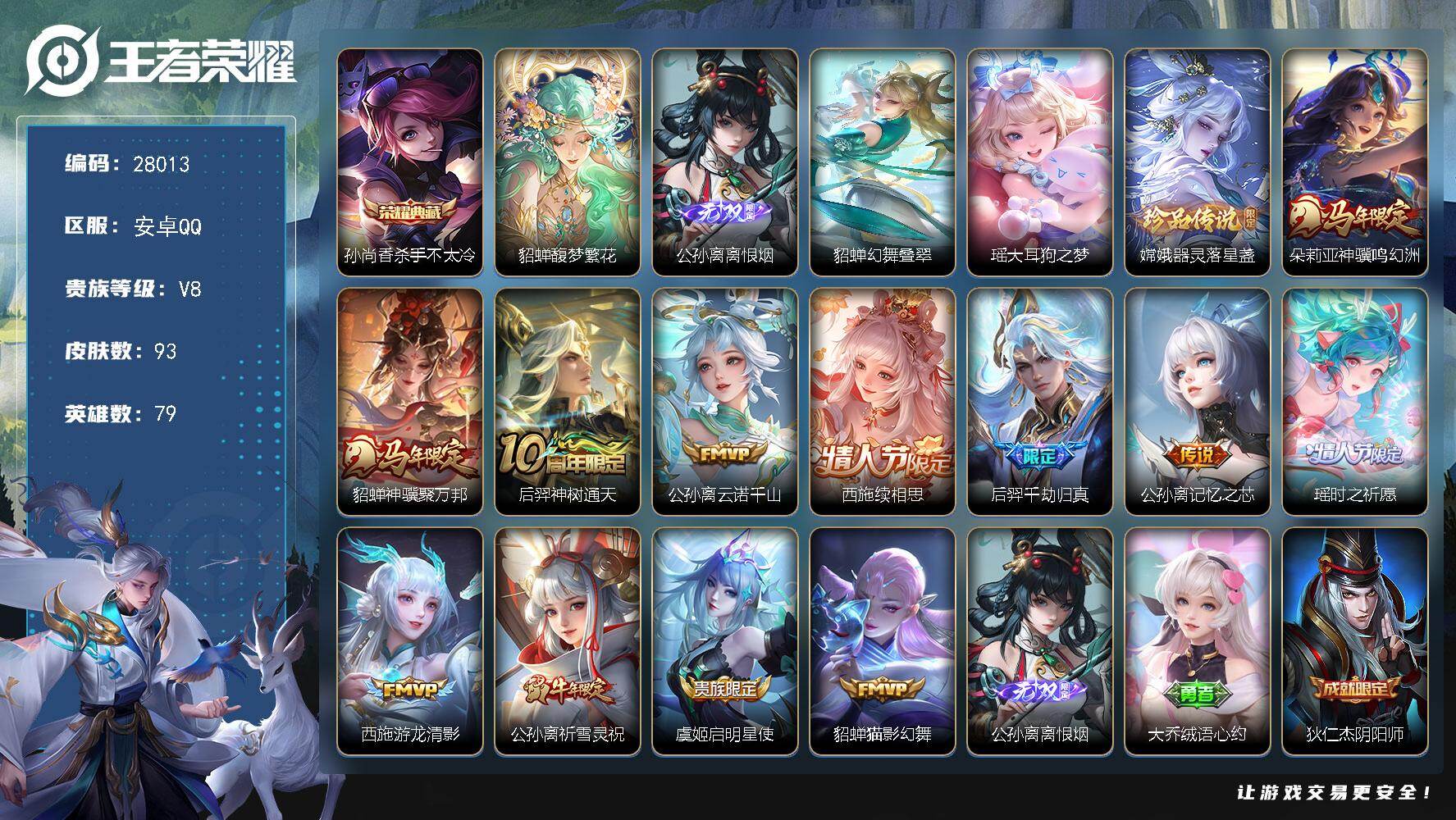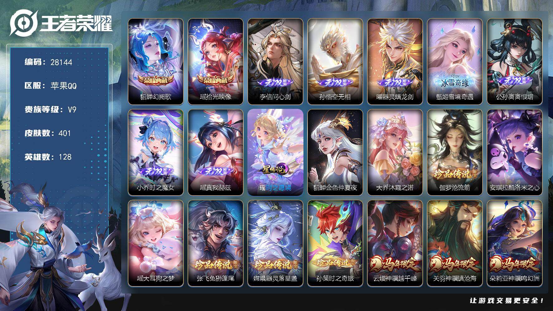 PX_2542651-可换绑【V9高质量精品女号·7无双·瑶大乔西施全皮·马年蛇年龙年全套·2典藏·6珍品·千山共赴·心动手记·小乔兔限·鹤归松栖·星穹之声·孙尚香异界灵契·白虎志·3星传说紫瑶·14万贵族积分】3856星币,52按键,3星传说,1王者印记,五级铭文150,无二次苹果Q-V9-401皮肤-2典藏皮肤-7无双-6珍品传说-39传说-111史诗【英雄全皮】:孙权全皮,朵莉亚全皮,大乔全皮,瑶全皮,敖隐全皮,西施全皮,司空震全皮,云缨全皮,赵怀真全皮,戈娅全皮,空空儿全皮,影全皮,海诺全皮,少司缘全皮【荣耀典藏】:貂蝉幻阙歌,瑶拾光映像【无双皮肤】:李信问心剑,孙悟空无相,曜器灵螭龙剑,甄姬雪境奇遇,公孙离离恨烟,小乔时之魔女,瑶真我赫兹【珍品传说】:伽罗沧流箭,安琪拉酷洛米之心,瑶大耳狗之梦,张飞兔狲蓬尾,嫦娥器灵落星盏,孙策时之奇旅【星元皮肤】:貂蝉金色仲夏夜,瑶时之愿境,大乔沐霞之诺【传说皮肤】:云缨神骥越千峰,关羽神骥镇沧海,朵莉亚神骥鸣幻洲,狄仁杰神骥赴朔漠,貂蝉神骥聚万邦,马超神骥逐星野,花木兰异界灵契,杨戬纵目迁山,后羿神树通天,干将莫邪千山共赴,司马懿九山相柳,西施续相思,杨玉环星之鸣奏,司空震愿照山河定,女娲愿照千秋盛,妲己愿照众生和,澜愿照九州拓,蔡文姬愿照福禄聚,虞姬愿照岁时盈,云缨幻光神枪,桑启鸣野蒿,朵莉亚心动手记,貂蝉曦玄引,孙尚香乘龙问璇玑,孙策乘龙淬吴钩,赵云乘龙铭钟鼎,大乔时之奇旅,云缨鹤归松栖,小乔山海琳琅生,王昭君星穹之声,大乔挚爱花嫁,孙策挚爱之约,露娜启示之音,瑶时之祈愿,孙尚香异界灵契,西施游龙清影,虞姬启明星使,张良黄金白羊座,百里玄策白虎志【限定皮肤】:公孙离离恨烟,蒙犽顽岩魄,蔡文姬夏日便利店,大乔绒语心约,虞姬夏日便利店,姜子牙天穹之誓,杨戬破阵退雄兵,李白谪仙醉月,狄仁杰阴阳师,小乔山海琳琅生,赵云皇家上将,妲己时之奇旅,孙尚香蔷薇恋人,孙尚香异界灵契,钟无艳超时空战士,扁鹊奇幻香踪,白起夜都怪侠,周瑜赤莲之焰,元歌无心,甄姬落雪兰心,狄仁杰魔术师,狄仁杰万华元夜,达摩沙漠行僧,项羽海滩派对,安琪拉魔法小厨娘,露娜启示之音,韩信飞衡,王昭君午后时光,王昭君星穹之声,兰陵王金庭之子,李元芳云中旅人,虞姬启明星使,钟馗神迹守卫,钟馗驱傩正仪,杨戬潮玩骑兵,鬼谷子五谷丰年,大乔白鹤梁神女,大乔挚爱花嫁,大乔时之奇旅,苏烈千军破阵,百里玄策白虎志,公孙离玉兔公主,沈梦溪大漠名商,明世隐吟游魔法,裴擒虎擒涛扼浪,狂铁电玩高手,米莱狄胡桃异想国,瑶时之祈愿,瑶山海碧波行,云中君纤云弄巧,孙策挚爱之约,上官婉儿梁祝,嫦娥如梦令,嫦娥拒霜思,嫦娥暖冬兔眠,西施玲珑珍味,西施至美乘鲤谣,鲁班大师探海日志,桑启海盐诗旅,暃星界游侠,戈娅驭风魔法,艾琳流音漫舞,赵怀真鹤归松栖,云缨鹤归松栖,司空震地狱燃心,阿古朵江河有灵,张良古海寻踪,蒙犽百解令,高渐离燃音魔法,妲己灵卜魔法,鬼谷子天穹祈灯,姬小满妄想食味,小乔时之魔女,大乔乘龙忆丹青,安琪拉乘龙聚宝船,孙尚香乘龙问璇玑,孙策乘龙淬吴钩,赵云乘龙铭钟鼎,貂蝉曦玄引,沈梦溪龙舞盛年,鲁班七号蔬乡物语,李元芳蔬乡物语,刘邦剑破天穹,镜青焰无极,项羽苍威无极,朵莉亚心动手记,海诺心动手记,刘备异域游侠,芈月浮光幕影,周瑜熔金海岸【年限皮肤】:百里玄策白虎志,韩信飞衡,小乔山海琳琅生,瑶山海碧波行,孙尚香乘龙问璇玑,孙策乘龙淬吴钩,赵云乘龙铭钟鼎,大乔乘龙忆丹青,安琪拉乘龙聚宝船,司空震愿照山河定,女娲愿照千秋盛,妲己愿照众生和,澜愿照九州拓,蔡文姬愿照福禄聚,虞姬愿照岁时盈【赛季限定】:狄仁杰万华元夜,钟馗驱傩正仪,苏烈千军破阵,达摩沙漠行僧,兰陵王金庭之子,沈梦溪大漠名商,李元芳云中旅人,桑启海盐诗旅,裴擒虎擒涛扼浪,鲁班大师探海日志,张良古海寻踪,鬼谷子天穹祈灯,刘邦剑破天穹,姜子牙天穹之誓,东皇太一噬灭天穹,太乙真人谧流熔炉,钟馗虚灵犬护,甄姬逆浪荇歌,亚瑟荣光之誓【战令限定】:钟馗神迹守卫,周瑜赤莲之焰,米莱狄胡桃异想国,明世隐吟游魔法,白起夜都怪侠,狂铁电玩高手,王昭君午后时光,钟无艳超时空战士,甄姬落雪兰心,暃星界游侠,嫦娥暖冬兔眠,扁鹊奇幻香踪,杨戬潮玩骑兵,戈娅驭风魔法,西施玲珑珍味,司空震地狱燃心,艾琳流音漫舞,高渐离燃音魔法,妲己灵卜魔法,鲁班七号蔬乡物语,李元芳蔬乡物语,镜青焰无极,项羽苍威无极,蔡文姬夏日便利店,虞姬夏日便利店,孙悟空神迹守卫,百里守约百相守梦,老夫子百相守梦,孙膑茶境仙,马超访茗客,刘禅鸭鸭历险记,沈梦溪鸭鸭历险记,周瑜百相守梦,孙策百相守梦,兰陵王傩神司,莱西奥光弋星穹,明世隐往忆晖光,周瑜线条小狗,小乔线条小狗【史诗皮肤】:太乙真人瓦猫非猫,明世隐百晓客,周瑜线条小狗,小乔线条小狗,少司缘巫礼祀神,女娲万灵启世,兰陵王傩神司,莱西奥光弋星穹,公孙离涂山容容,西施织梦人,朵莉亚幻珠鲛人,黄忠百相守梦,云缨赞萌露比,周瑜百相守梦,亚瑟布丁狗之誓,老夫子藏狐褐绒,百里守约雪豹霜爪,扁鹊灵蛊蚀心,狂铁龙之律动,刘禅鸭鸭历险记,阿轲化蝶舞,赵怀真器灵浮梦炉,弈星万物之道,孙膑茶境仙,百里守约百相守梦,艾琳陌上桑,李白谪仙醉月,姬小满战舞者,大司命东方月初,少司缘涂山红红,蒙犽顽岩魄,蔡文姬夏日便利店,芈月浮光幕影,海诺心动手记,镜青焰无极,