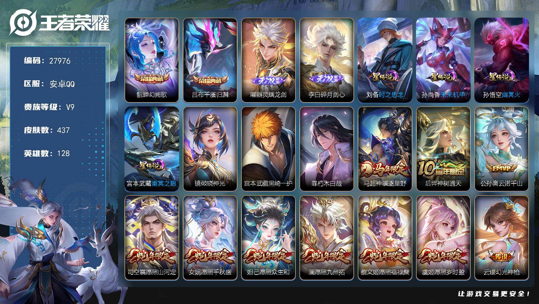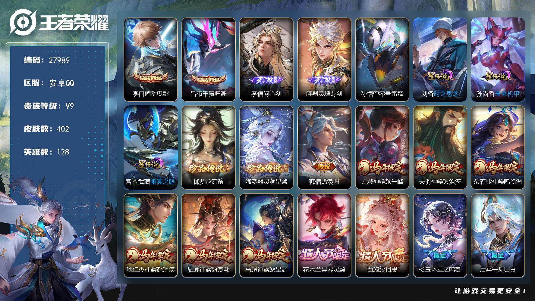PX_2504588-可换绑【V9精品号·贵族积分14.6万·8典藏·李白无双·马年关羽·画中仙·傲雪梅枪·墨上江山天幕·多传说限定号】7439星币,10按键,2星传说,1天幕,16王者印记,满级铭文,可二次CD18257,安卓Q-V9-349皮肤-8典藏皮肤-1无双-21传说-105史诗【英雄全皮】:苏烈全皮,敖隐全皮,蒙恬全皮【荣耀典藏】:孙悟空全息碎影,夏侯惇无限飓风号,孙尚香杀手不太冷,芈月大秦宣太后,程咬金活力突击,花木兰九霄神辉,韩信弑枪猎影,瑶拾光映像【无双皮肤】:李白碎月剑心【天幕】:墨上江山天幕【星元皮肤】:宫本武藏幽冥之眼,孙悟空幽冥火【传说皮肤】:关羽神骥镇沧海,后羿神树通天,桑启鸣野蒿,诸葛亮鹤羽星尊,干将莫邪画中仙,伽罗炽翼辉光,孙悟空齐天大圣,百里守约碎云,孙策末日机甲,孙尚香异界灵契,赵云淬星耀世,虞姬启明星使,李信一念神魔,张良黄金白羊座,虞姬云霓雀翎,达摩黄金狮子座,花木兰冠军飞将,梦奇胖达荣荣,后羿黄金射手座,宫本武藏地狱之眼,孙悟空地狱火【限定皮肤】:蒙犽顽岩魄,蔡文姬夏日便利店,姜子牙天穹之誓,李白谪仙醉月,狄仁杰阴阳师,赵云皇家上将,赵云百木心枪,墨子神迹守卫,孙尚香蔷薇恋人,孙尚香异界灵契,庄周高山流水,钟无艳超时空战士,白起夜都怪侠,芈月幻夜卜梦,元歌无心,甄姬落雪兰心,典韦蓝屏警告,典韦岱宗,狄仁杰魔术师,狄仁杰万华元夜,达摩星际陆战队,达摩沙漠行僧,项羽海滩派对,老夫子航海奇遇记,程咬金演武夺筹,韩信傲雪梅枪,王昭君午后时光,兰陵王金庭之子,花木兰瑞麟志,孙悟空孙行者,孙悟空齐天大圣,后羿圣弓游侠,李元芳云中旅人,虞姬启明星使,钟馗驱傩正仪,杨玉环遇见飞天,干将莫邪真爱魔法,干将莫邪画中仙,雅典娜黎明之约,鬼谷子五谷丰年,诸葛亮鹤羽星尊,黄忠火炮绅士,铠青龙志,苏烈玄武志,苏烈千军破阵,百里玄策原初追逐者,梦奇顽趣,沈梦溪大漠名商,明世隐吟游魔法,裴擒虎擒涛扼浪,狂铁电玩高手,米莱狄胡桃异想国,伽罗炽翼辉光,嫦娥拒霜思,嫦娥暖冬兔眠,鲁班大师探海日志,桑启海盐诗旅,暃星界游侠,艾琳女武神,阿古朵江河有灵,张良古海寻踪,蒙恬荣光圣徽,高渐离燃音魔法,妲己灵卜魔法,鬼谷子天穹祈灯,李白碎月剑心,沈梦溪龙舞盛年,刘邦剑破天穹,程咬金群星魔术团,周瑜熔金海岸【年限皮肤】:花木兰瑞麟志,苏烈玄武志,铠青龙志,典韦岱宗【赛季限定】:狄仁杰万华元夜,程咬金演武夺筹,钟馗驱傩正仪,苏烈千军破阵,达摩沙漠行僧,兰陵王金庭之子,沈梦溪大漠名商,李元芳云中旅人,桑启海盐诗旅,裴擒虎擒涛扼浪,鲁班大师探海日志,张良古海寻踪,鬼谷子天穹祈灯,刘邦剑破天穹,姜子牙天穹之誓,东皇太一噬灭天穹,太乙真人谧流熔炉,钟馗虚灵犬护,亚瑟荣光之誓,百里玄策原初追逐者,雅典娜黎明之约,梦奇顽趣,蒙恬荣光圣徽,牛魔星界战将,项羽九幽镇关【战令限定】:典韦蓝屏警告,米莱狄胡桃异想国,达摩星际陆战队,老夫子航海奇遇记,墨子神迹守卫,干将莫邪真爱魔法,后羿圣弓游侠,黄忠火炮绅士,芈月幻夜卜梦,明世隐吟游魔法,白起夜都怪侠,狂铁电玩高手,王昭君午后时光,钟无艳超时空战士,甄姬落雪兰心,暃星界游侠,嫦娥暖冬兔眠,高渐离燃音魔法,妲己灵卜魔法,蔡文姬夏日便利店,莱西奥光弋星穹,明世隐往忆晖光,周瑜线条小狗,小乔线条小狗【史诗皮肤】:上官婉儿春霖将至,钟馗锁墨魂,明世隐百晓客,盘古撼世英歌,周瑜线条小狗,小乔线条小狗,项羽九幽镇关,百里玄策罗小黑战记,莱西奥光弋星穹,公孙离涂山容容,黄忠百相守梦,扁鹊灵蛊蚀心,狂铁龙之律动,牛魔星界战将,李白谪仙醉月,蒙犽顽岩魄,蔡文姬夏日便利店,蒙恬荣光圣徽,高渐离燃音魔法,妲己灵卜魔法,阿古朵江河有灵,刘禅电玩爆裂旋风,暃星界游侠,梦奇顽趣,元歌无心,鬼谷子五谷丰年,钟无艳超时空战士,狂铁电玩高手,明世隐吟游魔法,澜赏金猎手,赵云百木心枪,夏洛特永昼,韩信傲雪梅枪,雅典娜黎明之约,黄忠火炮绅士,嫦娥拒霜思,司马懿暗渊魔法,庄周高山流水,孙悟空孙行者,钟馗乐园奇幻夜,沈梦溪月团寄思,干将莫邪真爱魔法,杨戬天秀启明,老夫子航海奇遇记,西施诗语江南,米莱狄胡桃异想国,百里玄策原初追逐者,孙尚香时之恋人,橘右京修罗,不知火舞魅语,小乔青蛇,大乔白蛇,典韦岱宗,娜可露露晚萤,公孙离无限星赏官,狄仁杰鹰眼统帅,伽罗箭羽风息,典韦蓝屏警告,花木兰瑞麟志,苏烈玄武志,铠青龙志,大乔猫狗日记,孙策猫狗日记,杨玉环遇见飞天,阿轲节奏热浪,白起星夜王子,程咬金功夫厨神,李元芳逐浪之夏,刘禅天才门将,蔡文姬舞动绿茵,铠曙光守护者,百里守约特工魅影,安琪拉心灵骇客,雅典娜冰冠公主,亚瑟心灵战警,诸葛亮黄金分割率,兰陵王暗隐猎兽者,小乔缤纷独角兽,夏侯惇乘风破浪,刘邦德古拉伯爵,花木兰水晶猎龙者,张飞乱世虎臣,吕布末日机甲,李白千年之狐,曹操幽灵船长,刘禅绅士熊喵,吕布圣诞狂欢,墨子金属风暴,墨子龙骑士,妲己女仆咖啡,妲己魅力维加斯,嬴政摇滚巨星,嬴政暗夜贵公子,孙尚香水果甜心,孙尚香蔷薇恋人,宫本武藏鬼剑武藏,廉颇地狱岩魂,狄仁杰魔术师,王昭君偶像歌手,甄姬冰雪圆舞曲,貂蝉圣诞恋歌,赵云未来纪元,赵云皇家上将,阿轲暗夜猫娘,露娜紫霞仙子,项羽苍穹之光,鲁班七号电玩小子【其他皮肤】:吕布舞狮寰,兰陵王雾影缉谜,鲁班七号班班快跑,妲己线条小狗,桑启线条小狗,蒙恬苍云