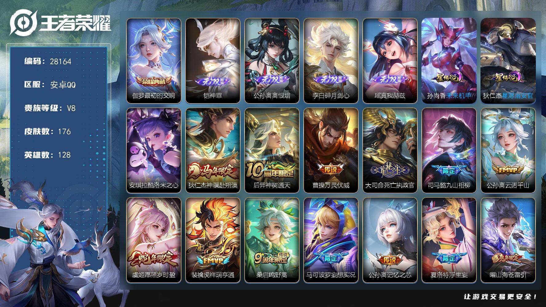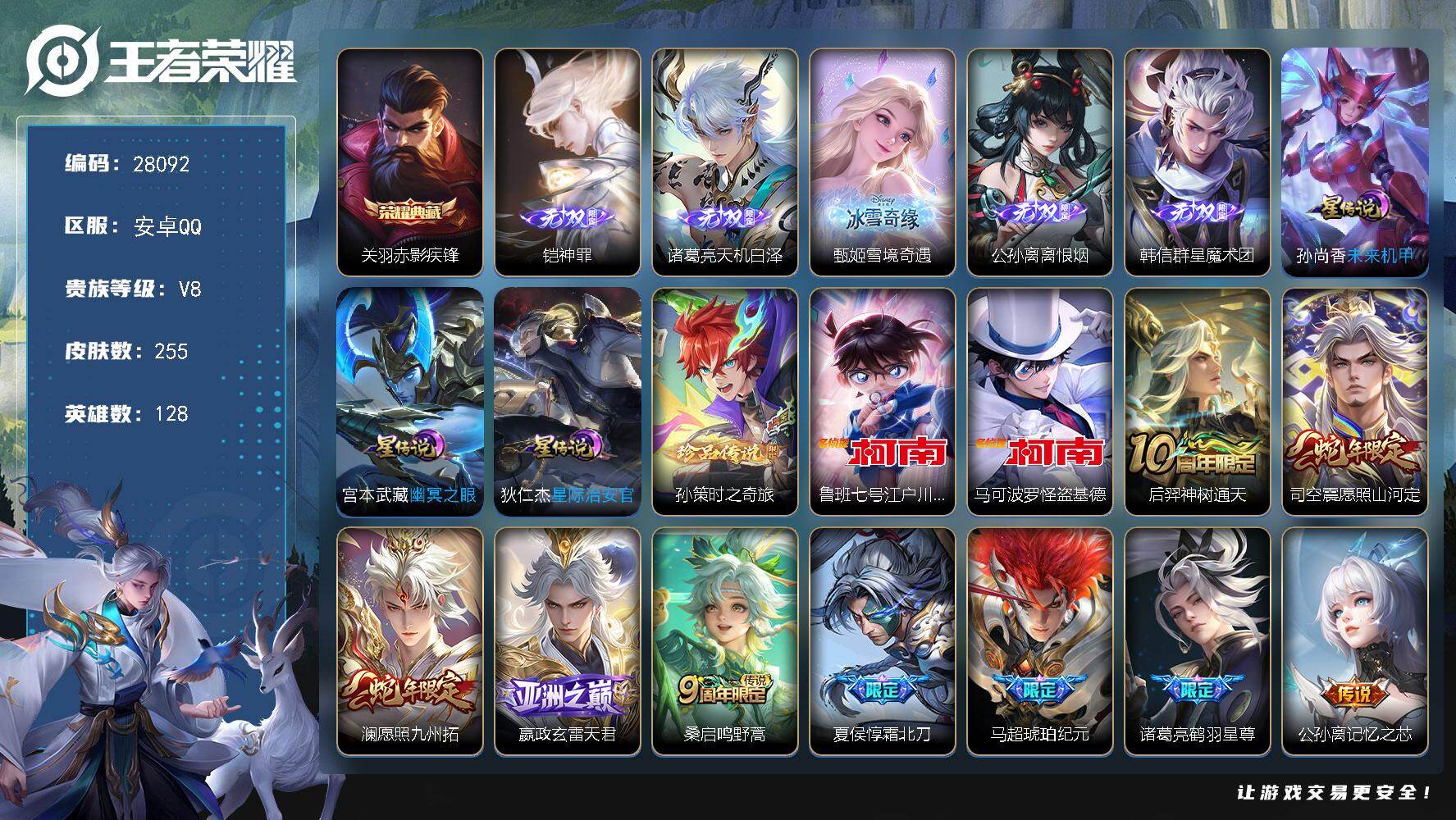 PX_2542602-可换绑,【高质量精品号·差1669点卷v9·5个无双·典藏关羽·3珍品孙策柯南怪盗基德·霜北刀·琥珀纪元·项羽情限·鹤羽星尊·神威·傲雪梅枪·冰霜恋舞曲·】3292星币,幸运值290,51按键,3星传说,1天幕,11王者印记,五级铭文150,无二次,安卓Q-V8-255皮肤-1典藏皮肤-5无双-3珍品传说-26传说-74史诗【英雄全皮】:孙权全皮,苍全皮,莱西奥全皮【荣耀典藏】:关羽赤影疾锋【无双皮肤】:铠神罪,诸葛亮天机白泽,甄姬雪境奇遇,公孙离离恨烟,韩信群星魔术团【珍品传说】:孙策时之奇旅,鲁班七号江户川柯南,马可波罗怪盗基德【星元皮肤】:宫本武藏幽冥之眼,孙尚香未来机甲,狄仁杰星际治安官【天幕】:箭叩九天天幕【传说皮肤】:后羿神树通天,司空震愿照山河定,澜愿照九州拓,嬴政玄雷天君,桑启鸣野蒿,夏侯惇霜北刀,马超琥珀纪元,诸葛亮鹤羽星尊,公孙离记忆之芯,项羽无限倾心,孙悟空齐天大圣,吕布怒海麟威,百里守约碎云,马超无双飞将,王昭君乞巧织情,西施游龙清影,铠绛天战甲,镜炽阳神光,虞姬启明星使,李信一念神魔,张良黄金白羊座,达摩黄金狮子座,花木兰冠军飞将,孙尚香末日机甲,宫本武藏地狱之眼,狄仁杰超时空战士【限定皮肤】:公孙离离恨烟,夏侯惇霜北刀,暃埋骨钱,蒙犽顽岩魄,姜子牙天穹之誓,李白谪仙醉月,狄仁杰阴阳师,赵云皇家上将,庄周高山流水,高渐离玩趣恶龙,元歌无心,狄仁杰魔术师,达摩星际陆战队,达摩沙漠行僧,项羽海滩派对,项羽无限倾心,关羽冰锋战神,韩信傲雪梅枪,兰陵王金庭之子,孙悟空齐天大圣,李元芳云中旅人,虞姬启明星使,钟馗驱傩正仪,杨玉环遇见飞天,干将莫邪冰霜恋舞曲,雅典娜黎明之约,鬼谷子五谷丰年,诸葛亮鹤羽星尊,黄忠烈魂,苏烈千军破阵,梦奇顽趣,沈梦溪大漠名商,沈梦溪匿光破解者,裴擒虎擒涛扼浪,桑启海盐诗旅,艾琳流音漫舞,鬼谷子天穹祈灯,马超琥珀纪元,沈梦溪龙舞盛年,刘邦剑破天穹,程咬金群星魔术团,韩信群星魔术团,关羽决胜骁骑,周瑜熔金海岸【年限皮肤】:司空震愿照山河定,澜愿照九州拓【赛季限定】:钟馗驱傩正仪,苏烈千军破阵,达摩沙漠行僧,兰陵王金庭之子,沈梦溪大漠名商,李元芳云中旅人,桑启海盐诗旅,裴擒虎擒涛扼浪,鬼谷子天穹祈灯,刘邦剑破天穹,姜子牙天穹之誓,东皇太一噬灭天穹,太乙真人谧流熔炉,钟馗虚灵犬护,甄姬逆浪荇歌,亚瑟荣光之誓,雅典娜黎明之约,梦奇顽趣,牛魔星界战将,项羽九幽镇关【战令限定】:达摩星际陆战队,艾琳流音漫舞,百里守约百相守梦,老夫子百相守梦,周瑜百相守梦,孙策百相守梦,兰陵王傩神司,莱西奥光弋星穹,明世隐往忆晖光,周瑜线条小狗,小乔线条小狗【史诗皮肤】:周瑜线条小狗,小乔线条小狗,项羽九幽镇关,女娲万灵启世,兰陵王傩神司,莱西奥光弋星穹,公孙离涂山容容,黄忠百相守梦,周瑜百相守梦,牛魔小牛鸭,狂铁龙之律动,阿轲化蝶舞,苍狼魂孤将,弈星万物之道,白起苍鳞隐世,牛魔星界战将,百里守约百相守梦,李白谪仙醉月,马可波罗星界特工,暃埋骨钱,蒙犽顽岩魄,关羽决胜骁骑,莱西奥末日机甲,沈梦溪匿光破解者,梦奇顽趣,元歌无心,鬼谷子五谷丰年,韩信傲雪梅枪,雅典娜黎明之约,司马懿暗渊魔法,庄周高山流水,沈梦溪月团寄思,黄忠烈魂,马超神威,橘右京修罗,不知火舞魅语,小乔青蛇,狄仁杰鹰眼统帅,伽罗箭羽风息,干将莫邪冰霜恋舞曲,孙策猫狗日记,杨玉环遇见飞天,阿轲节奏热浪,白起星夜王子,李元芳逐浪之夏,蔡文姬舞动绿茵,铠曙光守护者,百里守约特工魅影,安琪拉心灵骇客,亚瑟心灵战警,诸葛亮黄金分割率,兰陵王暗隐猎兽者,小乔缤纷独角兽,刘邦德古拉伯爵,花木兰水晶猎龙者,关羽冰锋战神,张飞乱世虎臣,吕布末日机甲,曹操幽灵船长,刘禅绅士熊喵,吕布圣诞狂欢,墨子金属风暴,妲己女仆咖啡,妲己魅力维加斯,嬴政暗夜贵公子,孙尚香水果甜心,宫本武藏鬼剑武藏,廉颇地狱岩魂,狄仁杰魔术师,甄姬冰雪圆舞曲,貂蝉圣诞恋歌,赵云未来纪元,赵云皇家上将,露娜紫霞仙子,项羽苍穹之光【其他皮肤】:影百相守梦,兰陵王雾影缉谜,虞姬溯影追猎,蚩奼极光幻客,曹操逐霄之志,艾琳鹤鸣心笺,孙权径山谋武,明世隐往忆晖光,亚瑟荣光之誓,哪吒罗小黑战记,鬼谷子克喵,莱西奥踏浪烽翎,庄周锦麟游梦,孙策百相守梦,甄姬逆浪荇歌,白起死霸装,姬小满小满鸭,露娜命运加冕,阿古朵布丁狗之约,张良灵野札记,苏烈春野闲踪,钟馗虚灵犬护,刘备浪漫序章,戈娅玫蓝誓约,明世隐景韶洛都,姜子牙星梦巡礼,西施雪境奇遇,典韦铁骨偃魂,太乙真人谧流熔炉,苍苍林狼骑,干将莫邪雾都夜雨,米莱狄怪诞之夜,老夫子百相守梦,亚瑟动物派对,东皇太一噬灭天穹,盘古敬我三分,周瑜熔金海岸,姜子牙天穹之誓,大司命暗都幽影,程咬金群星魔术团,刘邦剑破天穹,钟无艳春野之旅,沈梦溪龙舞盛年,朵莉亚金色潮汐,鬼谷子天穹祈灯,亚连破局者,艾琳流音漫舞,李元芳妄想特派,姬小满零食大作战,莱西奥西部游侠,太乙真人劲辣红锅,裴擒虎擒涛扼浪,赵怀真太极少年,牛魔牛运亨通,猪八戒潮玩探月行,桑启海盐诗旅,李元芳云中旅人,蒙恬蔚蓝守将,沈梦溪大漠名商,刘禅唤灵魔甲,兰陵王金庭之子,达摩沙漠行僧,苏烈千军破阵,鲁班大师乓乓大师,钟馗驱傩正仪,盘古重装意志,张良缤纷绘卷,达摩星际陆战队,盾山圆桌骑士,鲁班七号黑桃队长,哪吒次元突破,沈梦溪鲨炮海盗猫,高渐离玩趣恶龙,孙