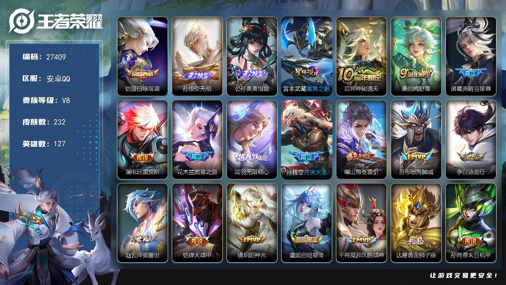 PX_2528413-可换绑【精品小号·孙策珍品·澜司空震虞姬蛇限·曜李信年限·齐天大圣·大圣娶妻·多年限号·无二次】1星传说,幸运值253,按键7,1王者印记,满级铭文,无二次安卓Q-V7-260皮肤-1珍品传说-15传说-67史诗【珍品传说】:孙策时之奇旅【星元皮肤】:宫本武藏幽冥之眼【传说皮肤】:后羿神树通天,司空震愿照山河定,澜愿照九州拓,虞姬愿照岁时盈,云缨幻光神枪,桑启鸣野蒿,孙悟空齐天大圣,小乔山海琳琅生,曜山海苍雷引,李信山海炽霜斩,孙尚香音你闪耀,孙悟空零号赤焰,达摩黄金狮子座,后羿黄金射手座,宫本武藏地狱之眼【限定皮肤】:狄仁杰阴阳师,小乔山海琳琅生,赵云皇家上将,孙尚香蔷薇恋人,高渐离玩趣恶龙,阿轲迷踪丽影,钟无艳超时空战士,元歌云间偶戏,元歌无心,夏侯惇朔风刀,甄姬落雪兰心,典韦蓝屏警告,马可波罗暗影游猎,马可波罗山海玄木吟,狄仁杰魔术师,狄仁杰万华元夜,项羽海滩派对,老夫子醍醐杖,关羽冰锋战神,程咬金演武夺筹,刘邦夺宝奇兵,兰陵王金庭之子,亚瑟潮玩骑士王,孙悟空大圣娶亲,孙悟空零号赤焰,孙悟空齐天大圣,李元芳云中旅人,钟馗驱傩正仪,女娲朔望之晖,干将莫邪真爱魔法,雅典娜单词大作战,蔡文姬繁星吟游,太乙真人饕餮,东皇太一逐梦之光,鬼谷子原初探秘者,鬼谷子五谷丰年,苏烈玄武志,弈星混沌棋,沈梦溪大漠名商,明世隐疑决卦,裴擒虎李小龙,裴擒虎擒涛扼浪,瑶山海碧波行,云中君纤云弄巧,李信山海炽霜斩,盾山御銮,猪八戒西部大镖客,上官婉儿梁祝,嫦娥暖冬兔眠,曜山海苍雷引,蒙犽狂想玩偶喵,鲁班大师探海日志,桑启海盐诗旅,暃星界游侠,阿古朵江河有灵,张良古海寻踪,高渐离燃音魔法,妲己灵卜魔法,鬼谷子天穹祈灯,伽罗琥珀纪元,沈梦溪龙舞盛年,刘邦剑破天穹【年限皮肤】:苏烈玄武志,小乔山海琳琅生,曜山海苍雷引,李信山海炽霜斩,瑶山海碧波行,马可波罗山海玄木吟,司空震愿照山河定,澜愿照九州拓,虞姬愿照岁时盈【赛季限定】:太乙真人饕餮,盾山御銮,夏侯惇朔风刀,弈星混沌棋,明世隐疑决卦,老夫子醍醐杖,鬼谷子原初探秘者,狄仁杰万华元夜,程咬金演武夺筹,钟馗驱傩正仪,兰陵王金庭之子,沈梦溪大漠名商,李元芳云中旅人,桑启海盐诗旅,裴擒虎擒涛扼浪,鲁班大师探海日志,张良古海寻踪,鬼谷子天穹祈灯,刘邦剑破天穹,东皇太一噬灭天穹,太乙真人谧流熔炉,钟馗虚灵犬护,亚瑟荣光之誓【战令限定】:典韦蓝屏警告,女娲朔望之晖,阿轲迷踪丽影,刘邦夺宝奇兵,马可波罗暗影游猎,猪八戒西部大镖客,蒙犽狂想玩偶喵,雅典娜单词大作战,元歌云间偶戏,亚瑟潮玩骑士王,干将莫邪真爱魔法,钟无艳超时空战士,甄姬落雪兰心,暃星界游侠,嫦娥暖冬兔眠,高渐离燃音魔法,妲己灵卜魔法,百里守约百相守梦,老夫子百相守梦,周瑜线条小狗【史诗皮肤】:周瑜线条小狗,少司缘巫礼祀神,女娲万灵启世,百里玄策罗小黑战记,黄忠百相守梦,扁鹊灵蛊蚀心,狂铁龙之律动,赵怀真器灵浮梦炉,弈星万物之道,百里守约百相守梦,伽罗琥珀纪元,高渐离燃音魔法,妲己灵卜魔法,阿古朵江河有灵,刘禅电玩爆裂旋风,瑶山海碧波行,马可波罗山海玄木吟,暃星界游侠,元歌无心,鬼谷子五谷丰年,钟无艳超时空战士,干将莫邪真爱魔法,元歌云间偶戏,云中君纤云弄巧,裴擒虎李小龙,蒙犽狂想玩偶喵,马可波罗暗影游猎,橘右京修罗,阿轲迷踪丽影,蔡文姬繁星吟游,上官婉儿梁祝,狄仁杰鹰眼统帅,典韦蓝屏警告,苏烈玄武志,孙悟空大圣娶亲,孙策猫狗日记,东皇太一逐梦之光,白起星夜王子,程咬金功夫厨神,李元芳逐浪之夏,蔡文姬舞动绿茵,铠曙光守护者,百里守约特工魅影,雅典娜冰冠公主,兰陵王暗隐猎兽者,小乔缤纷独角兽,夏侯惇乘风破浪,刘邦德古拉伯爵,花木兰水晶猎龙者,关羽冰锋战神,张飞乱世虎臣,曹操幽灵船长,吕布圣诞狂欢,墨子金属风暴,妲己女仆咖啡,嬴政摇滚巨星,孙尚香水果甜心,孙尚香蔷薇恋人,宫本武藏鬼剑武藏,廉颇地狱岩魂,狄仁杰魔术师,王昭君偶像歌手,甄姬冰雪圆舞曲,貂蝉圣诞恋歌,赵云未来纪元,赵云皇家上将,阿轲暗夜猫娘,露娜紫霞仙子,项羽苍穹之光【其他皮肤】:兰陵王雾影缉谜,鲁班七号班班快跑,桑启线条小狗,虞姬溯影追猎,艾琳鹤鸣心笺,亚瑟荣光之誓,哪吒罗小黑战记,鬼谷子克喵,莱西奥踏浪烽翎,白起死霸装,姬小满小满鸭,露娜命运加冕,阿古朵布丁狗之约,张良灵野札记,苏烈春野闲踪,钟馗虚灵犬护,刘备浪漫序章,戈娅玫蓝誓约,明世隐景韶洛都,姜子牙星梦巡礼,西施雪境奇遇,典韦铁骨偃魂,太乙真人谧流熔炉,苍苍林狼骑,干将莫邪雾都夜雨,老夫子百相守梦,东皇太一噬灭天穹,刘邦剑破天穹,钟无艳春野之旅,沈梦溪龙舞盛年,廉颇功夫炙烤,妲己灵卜魔法,鬼谷子天穹祈灯,后羿完美运算,张良古海寻踪,李元芳妄想特派,鲁班大师探海日志,裴擒虎擒涛扼浪,牛魔牛运亨通,猪八戒潮玩探月行,嫦娥暖冬兔眠,桑启海盐诗旅,李元芳云中旅人,甄姬落雪兰心,蒙恬蔚蓝守将,沈梦溪大漠名商,兰陵王金庭之子,程咬金无双福将,鲁班大师乓乓大师,钟馗驱傩正仪,盘古重装意志,张良缤纷绘卷,程咬金演武夺筹,露娜瓷语鉴心,杨戬次元傲视,刘禅秘密基地,亚瑟潮玩骑士王,狄仁杰万华元夜,雅典娜单词大作战,鬼谷子原初探秘者,廉颇无尽征程,狂铁特工战影,猪八戒西部大镖客,老夫子醍醐杖,盾山圆桌骑士,刘邦夺宝奇兵,明世隐疑决卦,哪吒次元