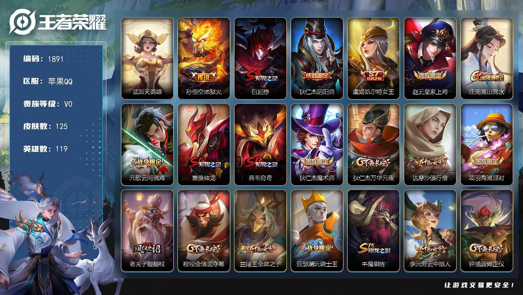 PX_2555935-【武则天,地狱火小号】苹果Q-V0-荣耀黄金IV段位-119英雄-125皮肤-1典藏英雄-1传说-17史诗 【荣耀典藏】:武则天英雄 【传说皮肤】:孙悟空地狱火 【限定皮肤】:白起狰,狄仁杰阴阳师,虞姬凯尔特女王,赵云皇家上将,庄周高山流水,元歌云间偶戏,曹操烛龙,典韦穷奇,狄仁杰魔术师,狄仁杰万华元夜,达摩沙漠行僧,项羽海滩派对,老夫子醍醐杖,程咬金演武夺筹,兰陵王金庭之子,亚瑟潮玩骑士王,牛魔御旌,李元芳云中旅人,钟馗驱傩正仪,干将莫邪胡桃夹子,雅典娜单词大作战,太乙真人饕餮,鬼谷子原初探秘者,鬼谷子五谷丰年,苏烈千军破阵,弈星混沌棋,沈梦溪大漠名商,明世隐疑决卦,裴擒虎李小龙,裴擒虎擒涛扼浪,狂铁御狮,米莱狄御霄,上官婉儿梁祝,蒙犽狂想玩偶喵,鲁班大师探海日志,桑启海盐诗旅 【赛季限定】:虞姬凯尔特女王,白起狰,太乙真人饕餮,曹操烛龙,典韦穷奇,狂铁御狮,米莱狄御霄,牛魔御旌,弈星混沌棋,明世隐疑决卦,老夫子醍醐杖,鬼谷子原初探秘者,狄仁杰万华元夜,程咬金演武夺筹,钟馗驱傩正仪,苏烈千军破阵,达摩沙漠行僧,兰陵王金庭之子,沈梦溪大漠名商,李元芳云中旅人,桑启海盐诗旅,裴擒虎擒涛扼浪,鲁班大师探海日志 【战令限定】:蒙犽狂想玩偶喵,雅典娜单词大作战,元歌云间偶戏,亚瑟潮玩骑士王 【史诗皮肤】:鬼谷子五谷丰年,庄周高山流水,安琪拉时之奇旅,元歌云间偶戏,裴擒虎李小龙,蒙犽狂想玩偶喵,橘右京修罗,上官婉儿梁祝,狄仁杰鹰眼统帅,雅典娜冰冠公主,妲己魅力维加斯,孙尚香水果甜心,廉颇地狱岩魂,狄仁杰魔术师,王昭君偶像歌手,甄姬冰雪圆舞曲,赵云皇家上将 【其他皮肤】:鲁班大师探海日志,裴擒虎擒涛扼浪,猪八戒潮玩探月行,桑启海盐诗旅,李元芳云中旅人,沈梦溪大漠名商,兰陵王金庭之子,程咬金无双福将,达摩沙漠行僧,干将莫邪胡桃夹子,苏烈千军破阵,鲁班大师乓乓大师,钟馗驱傩正仪,张良缤纷绘卷,程咬金演武夺筹,露娜瓷语鉴心,杨戬次元傲视,刘禅秘密基地,亚瑟潮玩骑士王,狄仁杰万华元夜,雅典娜单词大作战,鬼谷子原初探秘者,老夫子醍醐杖,盾山圆桌骑士,明世隐疑决卦,哪吒次元突破,弈星混沌棋,姜子牙炽热元素使,沈梦溪鲨炮海盗猫,吕布野性能量,小乔丁香结,牛魔御旌,明世隐虹云星官,米莱狄御霄,项羽科学大爆炸,苏烈坚韧之力,狂铁御狮,典韦穷奇,老夫子功夫老勺,王昭君幻想奇妙夜,曹操烛龙,宫本武藏霸王丸,太乙真人饕餮,钟无艳海滩丽影,白起狰,墨子进击墨子号,虞姬凯尔特女王,刘备汉昭烈帝,狄仁杰阴阳师,宫本武藏万象初新,花木兰兔女郎,达摩拳王,亚瑟死亡骑士,妲己少女阿狸,安琪拉玩偶对对碰,扁鹊救世之瞳,扁鹊化身博士,程咬金星际陆战队,芈月红桃皇后,赵云忍炎影,达摩大发明家,阿轲致命风华,露娜哥特玫瑰,韩信街头霸王,韩信教廷特使,项羽海滩派对,金蝉前尘,司空震启蛰,澜孤猎,蒙恬秩序猎龙将,镜冰刃幻境,西施归虚梦演,马超幸存者,曜归虚梦演,云中君荷鲁斯之眼,盘古创世神祝,伽罗花见巫女,盾山极冰防御线,司马懿魇语军师,弈星踏雪寻梅,裴擒虎街头旋风,公孙离花间舞,明世隐占星师,百里玄策威尼斯狂欢,百里守约绝影神枪,铠龙域领主,干将莫邪第七人偶,东皇太一东海龙王,黄忠芝加哥教父,诸葛亮星航指挥官,杨戬埃及法老,马可波罗激情绿茵,雅典娜战争女神,关羽天启骑士,李元芳特种部队,李白范海辛,兰陵王隐刃,刘禅英喵野望,后羿精灵王,周瑜海军大将,孙悟空西部大镖客,小乔万圣前夜,曹操死神来了,貂蝉异域舞娘,钟无艳生化警戒,露娜绯红之刃,鲁班七号福禄兄弟 【内测皮肤】:干将莫邪胡桃夹子 【营地ID】:92188632