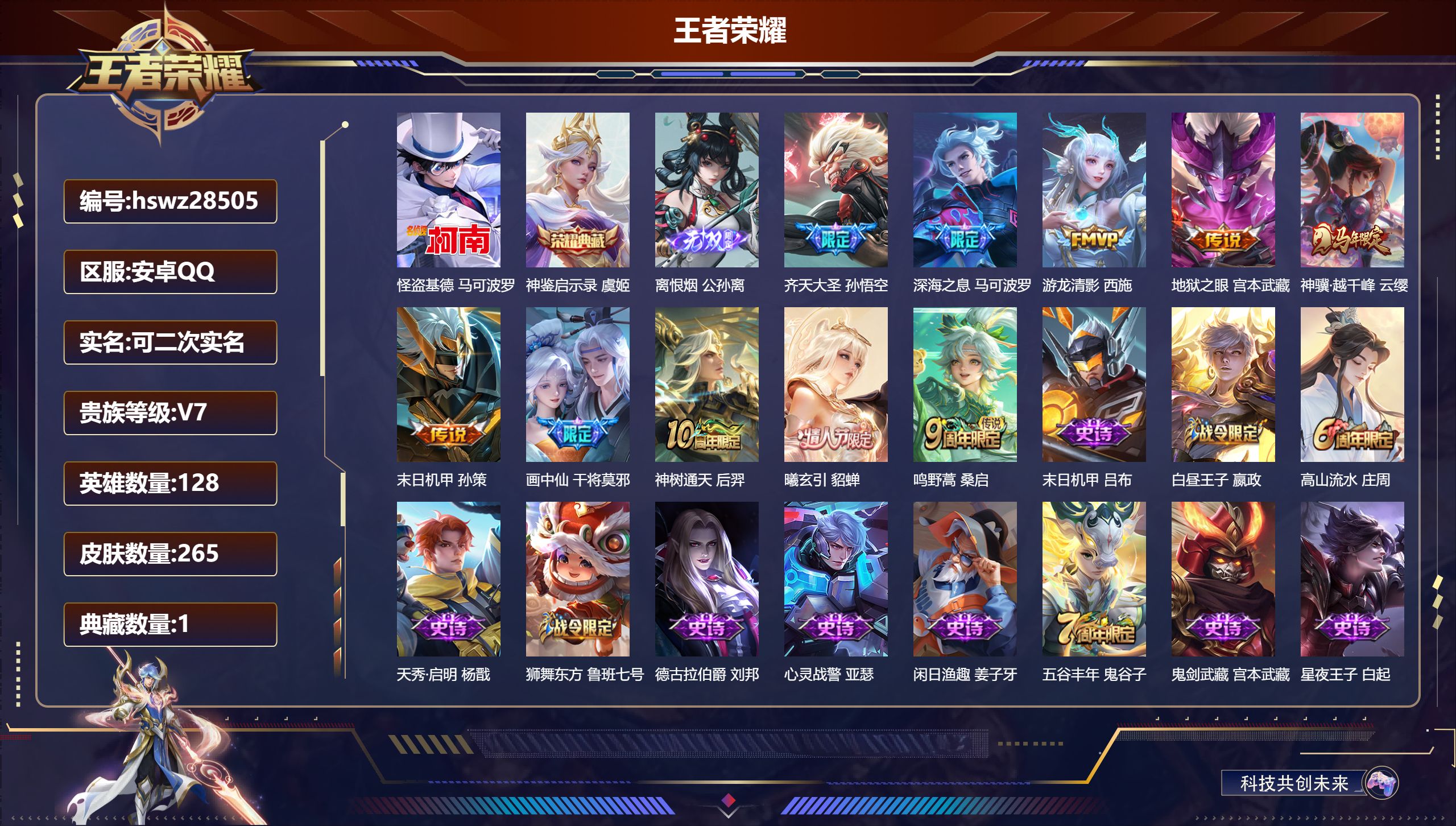 PX_2563333-Q/至尊星耀/265皮肤/128英雄/1典藏/0珍品无双/1无双/1珍品传说/10传说/71史诗/8稀有英雄 【1,珍品传说】怪盗基德,马可波罗, 【1,典藏皮肤】神鉴启示录,虞姬, 【1,无双皮肤】离恨烟,公孙离, 【10,传说皮肤】齐天大圣,孙悟空,深海之息,马可波罗,游龙清影,西施,地狱之眼,宫本武藏,神骥·越千峰,云缨,末日机甲,孙策,画中仙,干将莫邪,神树通天,后羿,曦玄引,貂蝉,鸣野蒿,桑启, 【71,史诗皮肤】末日机甲,吕布,白昼王子,嬴政,高山流水,庄周,天秀·启明,杨戬,狮舞东方,鲁班七号,德古拉伯爵,刘邦,心灵战警,亚瑟,闲日渔趣,姜子牙,五谷丰年,鬼谷子,鬼剑武藏,宫本武藏,星夜王子,白起,线条小狗,周瑜,遇见飞天,杨玉环,摇滚巨星,嬴政,拒霜思,嫦娥,魅力维加斯,妲己,黄金分割率,诸葛亮,乐园奇幻夜,钟馗,偶像歌手,王昭君,女仆咖啡,妲己,赏金猎手,澜,九幽镇关,项羽,鹰眼统帅,狄仁杰,大圣娶亲,孙悟空,李小龙,裴擒虎,光弋星穹,莱西奥,金属风暴,墨子,傲雪梅枪,韩信,特工魅影,百里守约,原初追逐者,百里玄策,逐浪之夏,李元芳,未来纪元,赵云,雪豹·霜爪,百里守约,黎明之约,雅典娜,魔术师,狄仁杰,皇家上将,赵云,冰冠公主,雅典娜,功夫厨神,程咬金,梁祝,上官婉儿,天才门将,刘禅,圣诞恋歌,貂蝉,水晶猎龙者,花木兰,破空之剑,亚连,圣诞狂欢,吕布,魅语,不知火舞,顽趣,阿古朵,星界战将,牛魔,地狱岩魂,廉颇,蔷薇恋人,孙尚香,火炮绅士,黄忠,航海奇遇记,老夫子,千年之狐,李白,节奏热浪,阿轲,暗夜猫娘,阿轲,游园惊梦,甄姬,曙光守护者,铠,心灵骇客,安琪拉,箭羽风息,伽罗,乱世虎臣,张飞,绅士熊喵,刘禅,缤纷独角兽,小乔,百相守梦,百里守约,蓝屏警告,典韦,天狼狩猎者,裴擒虎,真爱魔法,干将莫邪,水果甜心,孙尚香,化蝶舞,阿轲,江河有灵,阿古朵,幽灵船长,曹操,乘风破浪,夏侯惇,暗隐猎兽者,兰陵王, 【130,勇者皮肤】时空谍影,海诺,圆桌骑士,盾山,烛龙,曹操,爱心护理,阿轲,沙漠行僧,达摩,大漠名商,沈梦溪,暖冬絮语,程咬金,缤纷绘卷,张良,拳王,达摩,大发明家,达摩,龙舞盛年,沈梦溪,丁香结,小乔,功夫炙烤,廉颇,铁甲之心,典韦,沉稳之力,孙尚香,幻夜卜梦,芈月,海盐诗旅,桑启,幻泉雾影,海月,朔风刀,夏侯惇,醍醐杖,老夫子,朔望之晖,女娲,归虚梦演,孙膑,汉昭烈帝,刘备,白色死神,白起,黑桃队长,鲁班七号,黄金武士,典韦,御旌,牛魔,阴阳师,狄仁杰,径山谋武,孙权,次元突破,哪吒,古海寻踪,张良,牛运亨通,牛魔,科学大爆炸,项羽,功夫老勺,老夫子,西部大镖客,牛魔,鲨炮海盗猫,沈梦溪,海滩派对,项羽,万华元夜,狄仁杰,踏浪烽翎,莱西奥,演武夺筹,程咬金,红桃皇后,芈月,猎兽之王,吕布,野性能量,吕布,哥特玫瑰,露娜,守护之力,大乔,无双福将,程咬金,原初探秘者,鬼谷子,潮玩探月行,猪八戒,天穹祈灯,鬼谷子,疑决卦,明世隐,如懿,安琪拉,化身博士,扁鹊,阿尔法小队,后羿,五福同心,张飞,次元傲视,杨戬,星际陆战队,程咬金,幻乐之宴,鬼谷子,霸王丸,宫本武藏,虹云星官,明世隐,雾影缉谜,兰陵王,潮玩牛仔,马可波罗,救世之瞳,扁鹊,死亡骑士,亚瑟,敏锐之力,李白,玩偶对对碰,安琪拉,掌控之力,诸葛亮,海滩丽影,钟无艳,圣弓游侠,后羿,忍·炎影,赵云,雪境奇遇,西施,炽热元素使,姜子牙,坚韧之力,苏烈,唤灵魔甲,刘禅,万事如意,刘备,乓乓大师,鲁班大师,溯影追猎,虞姬,探海日志,鲁班大师,玩趣恶龙,高渐离,兔女郎,花木兰,龙腾万里,关羽,金庭之子,兰陵王,未来纪元,宫本武藏,罗小黑战记,哪吒,千军破阵,苏烈,往忆晖光,明世隐,零食大作战,姬小满,荣光之誓,亚瑟,花好人间,甄姬,万象初新,宫本武藏,聚星闪耀,钟无艳,御銮,盾山,时尚教父,姜子牙,春野之旅,钟无艳,秘密基地,刘禅,穷奇,典韦,教廷特使,韩信,街头霸王,韩信,云中旅人,李元芳,西部大镖客,孙悟空,紫罗兰之誓,妲己,神迹守卫,墨子,少女阿狸,妲己,混沌棋,弈星,御霄,米莱狄,蔚蓝守将,蒙恬,布丁狗之约,阿古朵,命运加冕,露娜,灵野札记,张良,驱傩正仪,钟馗,神迹守卫,钟馗,死霸装,白起,特工战影,狂铁,虚灵犬护,钟馗,御狮,狂铁,劲辣红锅,太乙真人,神迹守卫,孙悟空,剑破天穹,刘邦,熔金海岸,周瑜,天穹之誓,姜子牙,魅影绮裳,影,星梦巡礼,姜子牙,谧流熔炉,太乙真人,暗都幽影,大司命,鹤鸣心笺,艾琳,逆浪荇歌,甄姬,海之女神,海月,线条小狗,周瑜,百相守梦,老夫子,噬灭天穹,东皇太一,动物派对,亚瑟, 【54,其他皮肤】伊势巫女,大乔,金属狂潮,高渐离,前尘,金蝉,战争骑士,夏侯惇,芝加哥教父,黄忠,潮流仙人,老夫子,三太子,哪吒,棒球奇才,沈梦溪,极冰防御线,盾山,龙域领主,铠,第七人偶,干将莫邪,万圣前夜,小乔,熊喵少女,阿古朵,海之征途,孙策,精灵王,后羿,冰刃幻境,镜,海军大将,周瑜,星航指挥官,诸葛亮,魇语军师,司马懿,启蛰,司空震,花间舞,公孙离,异域舞娘,貂蝉,街头旋风,裴擒虎,东海龙王,东皇太一,剑舞者,花木兰,范海辛,李白,维京掠夺者,苍,占星师,明世隐,归虚梦演,蒙犽,激情绿茵,马可波罗,归虚梦演,西施,阿摩司公爵,鬼谷子,画中游,桑启,年年有余,猪八戒,一千零一夜,张良,归虚梦演,曜,幸存者,马超,战争女神,雅典娜,荷鲁斯之眼,云中君,特种部队,李元芳,绝影神枪,百里守约,蔷薇王座,蔡文姬,森,瑶,孤猎,澜,加勒比小姐,虞姬,踏雪寻梅,弈星,精灵公主,王昭君,赤焰之缨,云缨,地府判官,钟馗,美梦成真,梦奇,天启骑士,关羽,圆桌骑士,太乙真人,怪盗基德,马可波罗,西部大镖客,孙悟空, 【8,