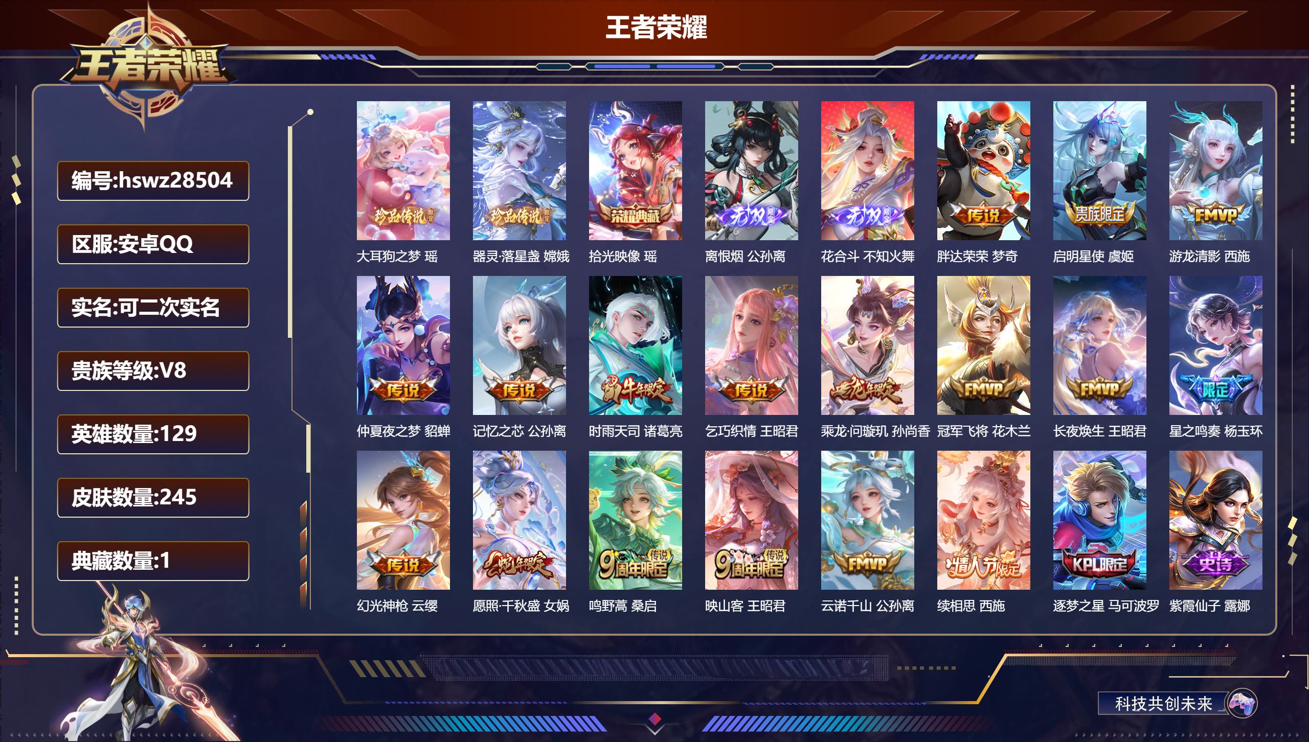 PX_2563326-Q/最强王者/245皮肤/129英雄/1典藏/0珍品无双/2无双/2珍品传说/17传说/74史诗/9稀有英雄 【2,珍品传说】大耳狗之梦,瑶,器灵·落星盏,嫦娥, 【1,典藏皮肤】拾光映像,瑶, 【2,无双皮肤】离恨烟,公孙离,花合斗,不知火舞, 【17,传说皮肤】胖达荣荣,梦奇,启明星使,虞姬,游龙清影,西施,仲夏夜之梦,貂蝉,记忆之芯,公孙离,时雨天司,诸葛亮,乞巧织情,王昭君,乘龙·问璇玑,孙尚香,冠军飞将,花木兰,长夜焕生,王昭君,星之鸣奏,杨玉环,幻光神枪,云缨,愿照·千秋盛,女娲,鸣野蒿,桑启,映山客,王昭君,云诺千山,公孙离,续相思,西施, 【74,史诗皮肤】逐梦之星,马可波罗,紫霞仙子,露娜,乘龙·忆丹青,大乔,燃音魔法,高渐离,冰霜恋舞曲,干将莫邪,猫狗日记,大乔,妄想食味,姬小满,诗语江南,西施,巫礼祀神,少司缘,鬼剑武藏,宫本武藏,百相守梦,黄忠,幻珠鲛人,朵莉亚,星夜王子,白起,至美·乘鲤谣,西施,无限星赏官,公孙离,线条小狗,周瑜,遇见飞天,杨玉环,顽趣,梦奇,冰锋战神,关羽,拒霜思,嫦娥,魅力维加斯,妲己,偶像歌手,王昭君,荣光圣徽,蒙恬,女仆咖啡,妲己,白蛇,大乔,九幽镇关,项羽,遇见神鹿,瑶,繁星吟游,蔡文姬,鹰眼统帅,狄仁杰,胡桃异想国,米莱狄,李小龙,裴擒虎,纤云弄巧,云中君,原初追逐者,百里玄策,黎明之约,雅典娜,石田雨龙,后羿,驭风魔法,戈娅,魔术师,狄仁杰,皇家上将,赵云,冰冠公主,雅典娜,涂山红红,少司缘,战舞者,姬小满,梁祝,上官婉儿,天才门将,刘禅,圣诞恋歌,貂蝉,云间偶戏,元歌,涂山容容,公孙离,圣诞狂欢,吕布,魅语,不知火舞,浮梦罗烟,海月,夏日便利店,蔡文姬,星界战将,牛魔,茶境仙,孙膑,蔷薇恋人,孙尚香,冰雪圆舞曲,甄姬,青蛇,小乔,月团寄思,沈梦溪,航海奇遇记,老夫子,千年之狐,李白,节奏热浪,阿轲,织梦人,西施,游园惊梦,甄姬,万灵启世,女娲,心灵骇客,安琪拉,箭羽风息,伽罗,琥珀纪元,伽罗,缤纷独角兽,小乔,陌上桑,艾琳,百相守梦,百里守约,线条小狗,小乔,水果甜心,孙尚香,化蝶舞,阿轲,江河有灵,阿古朵,乘风破浪,夏侯惇,暗隐猎兽者,兰陵王, 【110,勇者皮肤】玲珑珍味,西施,爱心护理,阿轲,星际陆战队,达摩,缤纷绘卷,张良,拳王,达摩,大发明家,达摩,龙舞盛年,沈梦溪,丁香结,小乔,幻泉雾影,海月,朔风刀,夏侯惇,醍醐杖,老夫子,归虚梦演,孙膑,汉昭烈帝,刘备,黑桃队长,鲁班七号,黄金武士,典韦,王牌新星,海月,御旌,牛魔,阴阳师,狄仁杰,径山谋武,孙权,古海寻踪,张良,戏梦巡演,空空儿,西部大镖客,牛魔,鲨炮海盗猫,沈梦溪,海滩派对,项羽,完美运算,后羿,万华元夜,狄仁杰,克喵,鬼谷子,踏浪烽翎,莱西奥,演武夺筹,程咬金,红桃皇后,芈月,奇妙博物学,庄周,哥特玫瑰,露娜,守护之力,大乔,瓷语鉴心,露娜,百相守梦,影,原初探秘者,鬼谷子,天穹祈灯,鬼谷子,决胜大满贯,曹操,疑决卦,明世隐,化身博士,扁鹊,潮玩骑士王,亚瑟,五福同心,张飞,金色潮汐,朵莉亚,次元傲视,杨戬,幻乐之宴,鬼谷子,东方不败,武则天,虹云星官,明世隐,雾影缉谜,兰陵王,赤刃凌霄,敖隐,死亡骑士,亚瑟,危途狂花,戈娅,破局者,亚连,玩偶对对碰,安琪拉,海滩丽影,钟无艳,雪境奇遇,西施,炽热元素使,姜子牙,坚韧之力,苏烈,乓乓大师,鲁班大师,溯影追猎,虞姬,探海日志,鲁班大师,女武神,艾琳,雾都夜雨,干将莫邪,兔女郎,花木兰,未来纪元,宫本武藏,罗小黑战记,哪吒,千军破阵,苏烈,零食大作战,姬小满,荣光之誓,亚瑟,花好人间,甄姬,万象初新,宫本武藏,御銮,盾山,时尚教父,姜子牙,秘密基地,刘禅,妄想特派,李元芳,神迹守卫,墨子,少女阿狸,妲己,灵卜魔法,妲己,混沌棋,弈星,御霄,米莱狄,春野闲踪,苏烈,布丁狗之约,阿古朵,绒语心约,大乔,幻想奇妙夜,王昭君,灵野札记,张良,驱傩正仪,钟馗,虚灵犬护,钟馗,漠中幻影,嫦娥,罗小黑战记,张良,剑破天穹,刘邦,铁骨偃魂,典韦,熔金海岸,周瑜,苍林狼骑,苍,天穹之誓,姜子牙,魅影绮裳,影,访茗客,马超,星梦巡礼,姜子牙,谧流熔炉,太乙真人,夏日便利店,虞姬,鹤鸣心笺,艾琳,锦麟游梦,庄周,逆浪荇歌,甄姬,海之女神,海月,微风如诗,大乔,线条小狗,周瑜,线条小狗,桑启,百相守梦,老夫子,噬灭天穹,东皇太一,灵卦秘语,少司缘,玫蓝誓约,戈娅,景韶洛都,明世隐, 【43,其他皮肤】伊势巫女,大乔,前尘,金蝉,棒球奇才,沈梦溪,极冰防御线,盾山,龙域领主,铠,第七人偶,干将莫邪,幻珠鲛人,朵莉亚,万圣前夜,小乔,木偶奇遇记,鲁班七号,福禄兄弟,鲁班七号,帝国元帅,项羽,精灵王,后羿,绯红之刃,露娜,冰刃幻境,镜,碧珀绯影,暃,海军大将,周瑜,星航指挥官,诸葛亮,霓裳曲,杨玉环,花间舞,公孙离,异域舞娘,貂蝉,东海龙王,东皇太一,修竹墨客,上官婉儿,归虚梦演,蒙犽,归虚梦演,西施,阿摩司公爵,鬼谷子,画中游,桑启,尼罗河女神,女娲,锦衣卫,狄仁杰,一千零一夜,张良,大耳狗之梦,瑶,荷鲁斯之眼,云中君,特种部队,李元芳,绝影神枪,百里守约,蔷薇王座,蔡文姬,森,瑶,加勒比小姐,虞姬,踏雪寻梅,弈星,精灵公主,王昭君,赤焰之缨,云缨,露花倒影,嫦娥,地府判官,钟馗,美梦成真,梦奇,器灵·落星盏,嫦娥, 【9,稀有英雄】敖隐,嬴政,不知火舞,橘右京,夏洛特,娜可露露,韩信,艾琳,赵云, 营地ID:,