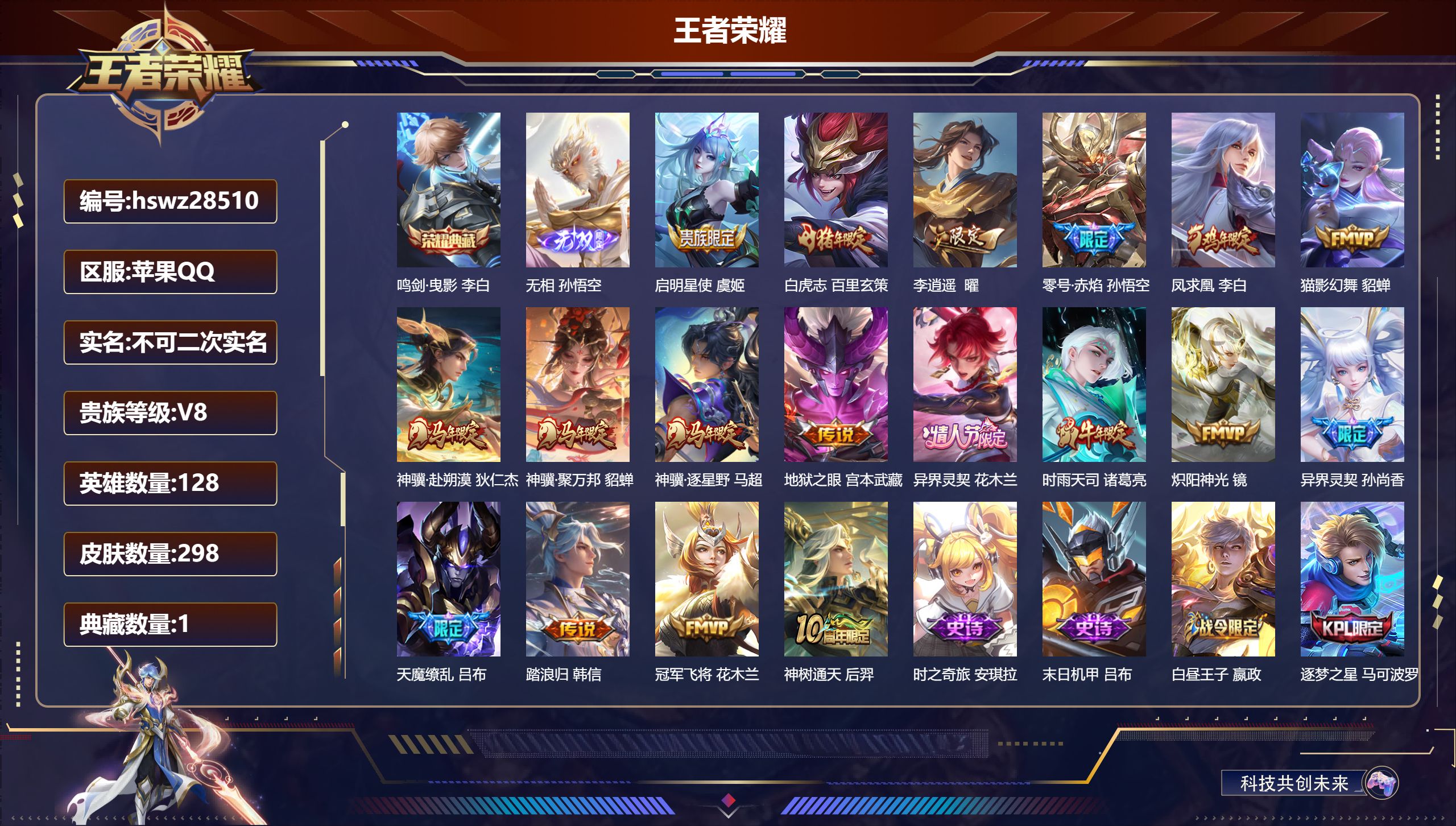 PX_2563379-Q/至尊星耀/298皮肤/128英雄/1典藏/0珍品无双/1无双/0珍品传说/18传说/82史诗/8稀有英雄 【1,典藏皮肤】鸣剑·曳影,李白, 【1,无双皮肤】无相,孙悟空, 【18,传说皮肤】启明星使,虞姬,白虎志,百里玄策,李逍遥,,曜,零号·赤焰,孙悟空,凤求凰,李白,猫影幻舞,貂蝉,神骥·赴朔漠,狄仁杰,神骥·聚万邦,貂蝉,神骥·逐星野,马超,地狱之眼,宫本武藏,异界灵契,花木兰,时雨天司,诸葛亮,炽阳神光,镜,异界灵契,孙尚香,天魔缭乱,吕布,踏浪归,韩信,冠军飞将,花木兰,神树通天,后羿, 【82,史诗皮肤】时之奇旅,安琪拉,末日机甲,吕布,白昼王子,嬴政,逐梦之星,马可波罗,紫霞仙子,露娜,高山流水,庄周,银河之约,李元芳,暗影游猎,马可波罗,苍穹之光,项羽,狮舞东方,鲁班七号,妄想食味,姬小满,德古拉伯爵,刘邦,山海·玄木吟,马可波罗,心灵战警,亚瑟,星君·亢金,达摩,五谷丰年,鬼谷子,无心,元歌,鬼剑武藏,宫本武藏,迷踪丽影,阿轲,无限星赏官,公孙离,瓦猫非猫,太乙真人,线条小狗,周瑜,摇滚巨星,嬴政,顽趣,梦奇,修罗,橘右京,拒霜思,嫦娥,魅力维加斯,妲己,黄金分割率,诸葛亮,偶像歌手,王昭君,女仆咖啡,妲己,猪悟能,猪八戒,繁星吟游,蔡文姬,鹰眼统帅,狄仁杰,大圣娶亲,孙悟空,飞衡,韩信,孙行者,孙悟空,李小龙,裴擒虎,光弋星穹,莱西奥,纤云弄巧,云中君,驯魔猎人,兰陵王,龙骑士,墨子,金属风暴,墨子,逐梦之影,韩信,猫狗日记,孙策,原初追逐者,百里玄策,逐浪之夏,李元芳,时之彼端,妲己,引擎之心,赵云,朱雀志,百里守约,黎明之约,雅典娜,魔术师,狄仁杰,龙之律动,狂铁,皇家上将,赵云,冰冠公主,雅典娜,至尊宝,孙悟空,辉光之辰,后羿,功夫厨神,程咬金,梁祝,上官婉儿,天才门将,刘禅,圣诞恋歌,貂蝉,云间偶戏,元歌,水晶猎龙者,花木兰,魅语,不知火舞,器灵·浮梦炉,赵怀真,罗小黑战记,百里玄策,虎魄,张飞,航海奇遇记,老夫子,千年之狐,李白,节奏热浪,阿轲,青龙志,铠,箭羽风息,伽罗,乱世虎臣,张飞,缤纷独角兽,小乔,线条小狗,小乔,蓝屏警告,典韦,真爱魔法,干将莫邪,水果甜心,孙尚香,狂想玩偶喵,蒙犽,江河有灵,阿古朵,幽灵船长,曹操,乘风破浪,夏侯惇,暗隐猎兽者,兰陵王, 【138,勇者皮肤】圆桌骑士,盾山,烛龙,曹操,爱心护理,阿轲,太极少年,赵怀真,沙漠行僧,达摩,大漠名商,沈梦溪,缤纷绘卷,张良,纽约教父,刘备,拳王,达摩,大发明家,达摩,龙舞盛年,沈梦溪,乐园追猎者,白起,丁香结,小乔,功夫炙烤,廉颇,沉稳之力,孙尚香,爱与正义,程咬金,海盐诗旅,桑启,朔风刀,夏侯惇,醍醐杖,老夫子,朔望之晖,女娲,归虚梦演,孙膑,汉昭烈帝,刘备,白色死神,白起,黑桃队长,鲁班七号,黄金武士,典韦,夺宝奇兵,刘邦,御旌,牛魔,阴阳师,狄仁杰,致命风华,阿轲,次元突破,哪吒,古海寻踪,张良,牛运亨通,牛魔,科学大爆炸,项羽,功夫老勺,老夫子,西部大镖客,牛魔,鲨炮海盗猫,沈梦溪,海滩派对,项羽,完美运算,后羿,万华元夜,狄仁杰,无尽征程,廉颇,制霸全明星,牛魔,演武夺筹,程咬金,奇妙博物学,庄周,西部游侠,莱西奥,猎兽之王,吕布,野性能量,吕布,哥特玫瑰,露娜,守护之力,大乔,无双福将,程咬金,原初探秘者,鬼谷子,星空之诺,沈梦溪,潮玩探月行,猪八戒,天穹祈灯,鬼谷子,西部大镖客,猪八戒,疑决卦,明世隐,化身博士,扁鹊,潮玩骑士王,亚瑟,阿尔法小队,后羿,五福同心,张飞,次元傲视,杨戬,幻乐之宴,鬼谷子,霸王丸,宫本武藏,虹云星官,明世隐,雾影缉谜,兰陵王,潮玩牛仔,马可波罗,救世之瞳,扁鹊,赤莲之焰,周瑜,死亡骑士,亚瑟,敏锐之力,李白,危途狂花,戈娅,幽兰居士,张良,玩偶对对碰,安琪拉,掌控之力,诸葛亮,海滩丽影,钟无艳,圣弓游侠,后羿,忍·炎影,赵云,狰,白起,雪境奇遇,西施,重明,芈月,炽热元素使,姜子牙,坚韧之力,苏烈,万事如意,刘备,擒涛扼浪,裴擒虎,乓乓大师,鲁班大师,死亡摇滚,高渐离,溯影追猎,虞姬,极光幻客,蚩奼,探海日志,鲁班大师,天使之翼,孙膑,玩趣恶龙,高渐离,兔女郎,花木兰,龙腾万里,关羽,金庭之子,兰陵王,未来纪元,宫本武藏,罗小黑战记,哪吒,千军破阵,苏烈,往忆晖光,明世隐,零食大作战,姬小满,荣光之誓,亚瑟,花好人间,甄姬,万象初新,宫本武藏,御銮,盾山,单词大作战,雅典娜,时尚教父,姜子牙,秘密基地,刘禅,穷奇,典韦,教廷特使,韩信,街头霸王,韩信,云中旅人,李元芳,西部大镖客,孙悟空,神迹守卫,墨子,凯尔特女王,虞姬,少女阿狸,妲己,混沌棋,弈星,御霄,米莱狄,布丁狗之约,阿古朵,幻想奇妙夜,王昭君,驱傩正仪,钟馗,神迹守卫,钟馗,命运角斗场,狂铁,特工战影,狂铁,虚灵犬护,钟馗,御狮,狂铁,班班快跑,鲁班七号,白执事,赵云,饕餮,太乙真人,华丽摇滚,太乙真人,罗小黑战记,张良,天穹之誓,姜子牙,星梦巡礼,姜子牙,谧流熔炉,太乙真人,暗都幽影,大司命,鹤鸣心笺,艾琳,线条小狗,妲己,云械蓝图,云中君,线条小狗,周瑜,线条小狗,桑启,玫蓝誓约,戈娅, 【60,其他皮肤】伊势巫女,大乔,金属狂潮,高渐离,圣殿之光,刘邦,芝加哥教父,黄忠,三太子,哪吒,棒球奇才,沈梦溪,龙域领主,铠,花见巫女,伽罗,爱与和平,苏烈,未来旅行,孙膑,第七人偶,干将莫邪,万圣前夜,小乔,灼热之刃,李信,海之征途,孙策,木偶奇遇记,鲁班七号,精灵王,后羿,绯红之刃,露娜,冰刃幻境,镜,海军大将,周瑜,星航指挥官,诸葛亮,魇语军师,司马懿,英喵野望,刘禅,午夜歌剧院,元歌,启蛰,司空震,隐刃,兰陵王,霓裳曲,杨玉环,花间舞,公孙离,异域舞娘,貂蝉,街头旋风,裴擒虎,东海