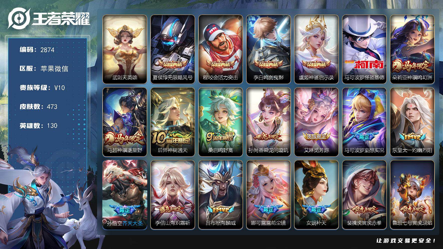 PX_2547762-限制-7星元3天幕10个性按键-极品ID【宝宝】苹果WX-V10-永恒钻石I段位-130英雄-473皮肤-4典藏皮肤-1典藏英雄-1珍品传说-39传说-156史诗 【英雄全皮】:刘邦全皮,孙权全皮,艾琳全皮,娜可露露全皮,鬼谷子全皮,狂铁全皮,盾山全皮,猪八戒全皮,敖隐全皮,空空儿全皮,影全皮 【荣耀典藏】:武则天英雄,夏侯惇无限飓风号,程咬金活力突击,李白鸣剑曳影,虞姬神鉴启示录 【珍品传说】:马可波罗怪盗基德 【传说皮肤】:朵莉亚神骥鸣幻洲,马超神骥逐星野,后羿神树通天,桑启鸣野蒿,孙尚香乘龙问璇玑,艾琳觅芳踪,马可波罗妄想实况,东皇太一灼幽烈阳,孙悟空齐天大圣,李信山海炽霜斩,吕布怒海麟威,娜可露露前尘镜,女娲补天,裴擒虎寅虎赤拳,鲁班七号寅虎瑞焰,孙尚香异界灵契,赵云淬星耀世,曜李逍遥,,周瑜音你心动,李元芳飞鸢探春,镜炽阳神光,虞姬启明星使,孙悟空零号赤焰,关羽武圣,李信一念神魔,刘备时之恋人,伽罗太华,张良黄金白羊座,干将莫邪久胜战神,百里玄策白虎志,花木兰冠军飞将,梦奇胖达荣荣,后羿黄金射手座,诸葛亮武陵仙君,貂蝉仲夏夜之梦,孙尚香末日机甲,宫本武藏地狱之眼,武则天海洋之心,狄仁杰超时空战士 【限定皮肤】:蔡文姬夏日便利店,姜子牙天穹之誓,李白谪仙醉月,狄仁杰阴阳师,廉颇寅虎御盾,赵云皇家上将,墨子神迹守卫,嬴政优雅恋人,嬴政白昼王子,孙尚香异界灵契,鲁班七号狮舞东方,鲁班七号乒乒小将,鲁班七号寅虎瑞焰,庄周云端筑梦师,庄周高山流水,阿轲迷踪丽影,钟无艳超时空战士,孙膑寅虎展翼,扁鹊奇幻香踪,白起夜都怪侠,芈月重明,芈月白晶晶,芈月幻夜卜梦,吕布猎兽之王,周瑜赤莲之焰,元歌云间偶戏,元歌无心,夏侯惇朔风刀,夏侯惇匿光决锋者,甄姬女儿国国王,甄姬落雪兰心,典韦穷奇,典韦蓝屏警告,典韦岱宗,马可波罗暗影游猎,马可波罗妄想实况,狄仁杰魔术师,狄仁杰万华元夜,达摩星际陆战队,达摩沙漠行僧,项羽海滩派对,老夫子醍醐杖,老夫子航海奇遇记,关羽武圣,程咬金演武夺筹,露娜一生所爱,刘邦夺宝奇兵,韩信傲雪梅枪,王昭君午后时光,兰陵王驯魔猎人,兰陵王金庭之子,花木兰青春决赛季,娜可露露前尘镜,亚瑟潮玩骑士王,孙悟空至尊宝,孙悟空大圣娶亲,孙悟空零号赤焰,孙悟空孙行者,孙悟空齐天大圣,牛魔御旌,后羿如梦令,后羿圣弓游侠,李元芳银河之约,李元芳云中旅人,虞姬启明星使,钟