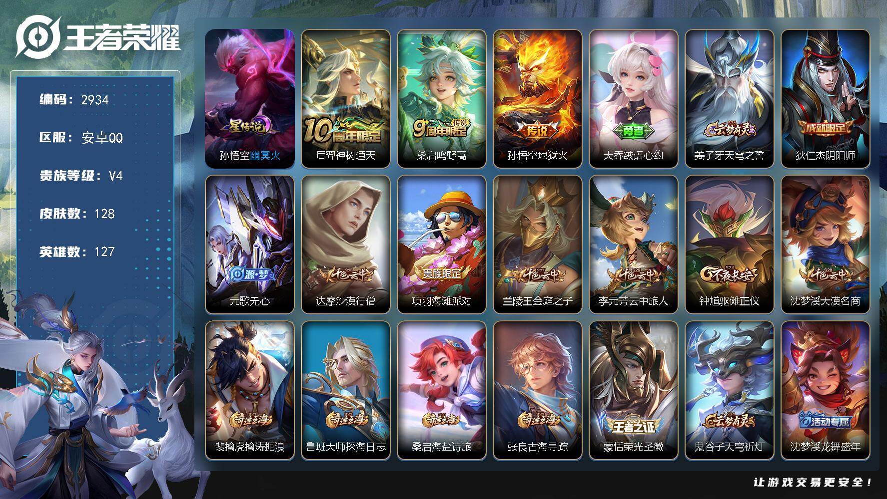 PX_2536621-实名:,可修改,贵族等级:,V6,英雄数:,128,皮肤数:,209,星传说:,幽冥之眼,传说皮:,黄金狮子座,云鹰飞将,炽阳神光,地狱之眼,胖达荣荣,山海·苍雷引,幻光神枪,神树通天,神骥·逐星野,限定皮:,李小龙,五谷丰年,鸣野蒿,愿照·九州拓