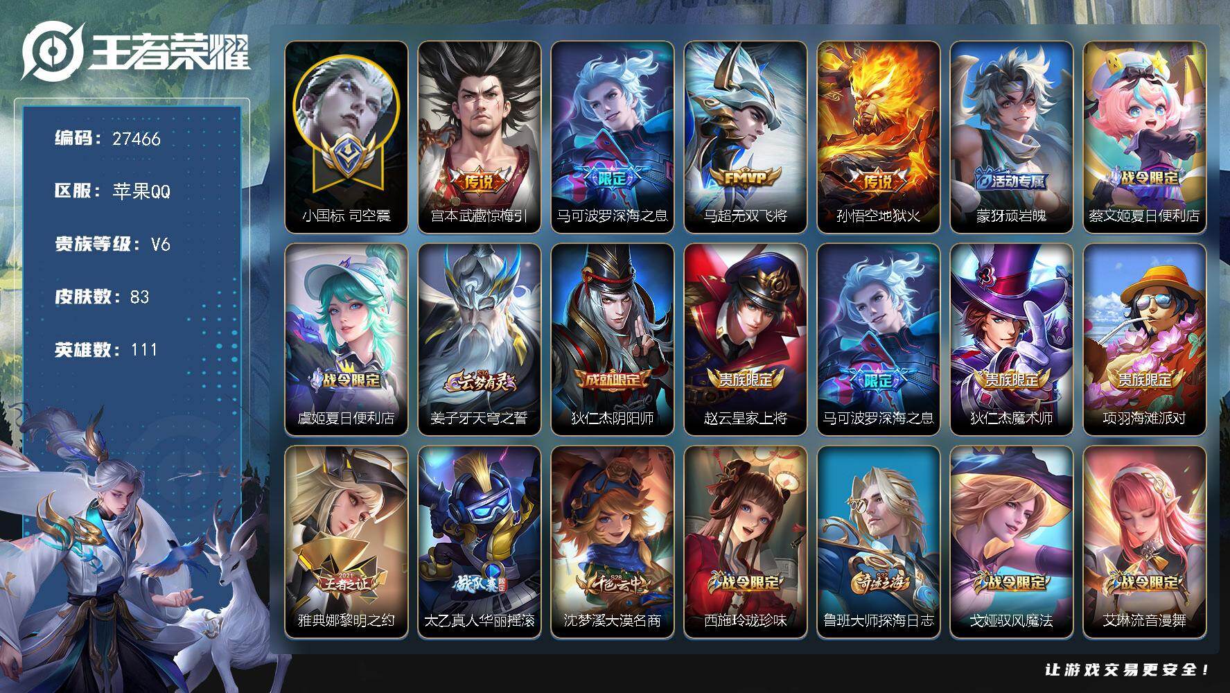 PX_2531362-可换绑,【精品战力号·巅峰对抗路·小国司空震·1.29w深海之息·无二次】1按键,6王者印记,70五级铭文,无二次,苹果Q-V6-83皮肤-4传说-27史诗【小国标】:小国标司空震【传说皮肤 【小国标】:小国标司空震