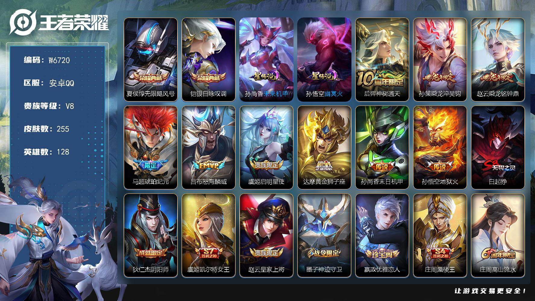 PX_2557884-【W6720】品质号.幻夜逐光天幕-幽冥火.未来机甲星元-铠银白咏叹调.夏侯惇无限飓风号典藏-马超琥珀纪元.FMVP怒海麟威.孙策乘龙·淬吴钩.赵云乘龙·铭钟鼎.安琪拉乘龙,聚宝船-安卓Q-无二次-贵8-128英雄-255皮肤-2典藏-9传说-92限定-65史诗-2星元-3561星币-4按键-2天幕-122夺宝幸运值-满铭文-13印记-贵族积分50166-营地ID:361998088 【星元皮肤】:孙悟空幽冥火,孙尚香未来机甲