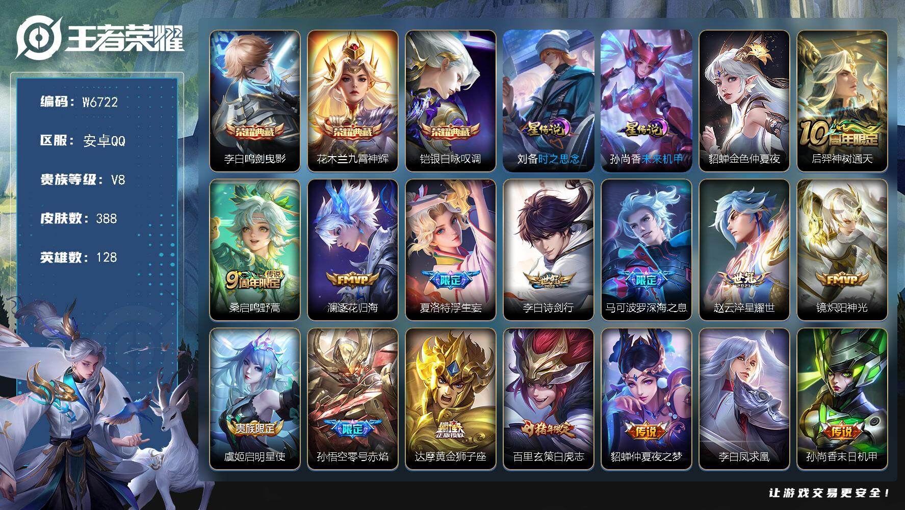 PX_2557900-【W6722】安卓Q区-无二次-贵8-128英雄-388皮肤-3典藏-15传说-3星元-12按键-满铭文-绝版神奇女侠/银白咏叹调/鸣剑·曳影/九霄神辉/白虎志/至尊宝/炽阳神光/逐花归海/淬星耀世/深海之息/浮生妄/末日机甲/黄金狮子座/凤求凰/飞衡/修罗-贵族积分8.2W-营地ID:477182952 【星元皮肤】:貂蝉金色仲夏夜,孙尚香未来机甲,刘备时之思念