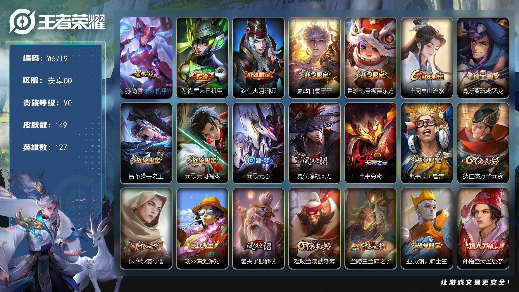 PX_2557784-【W6719】精品小号.末日机甲未来机甲星元-猴子大圣娶亲.无心.蓝屏警告.金属风暴.水晶猎龙者.电玩小子.街头霸王.黄金武士.死亡骑士-安卓Q-无二次-贵4-127英雄-149皮肤-1传说-51限定-35史诗-1星元-107夺宝幸运值-12印记-贵族积分2650-营地ID:328110903 【星元皮肤】:孙尚香未来机甲