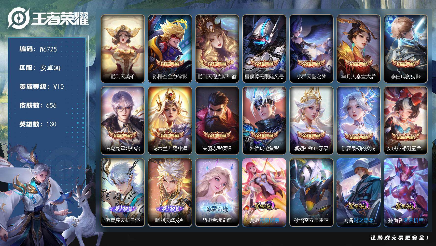 PX_2557921-【W6725】安卓Q区-无二次-贵10-130英雄-656皮肤-14典藏(武则天)-3无双-9珍品传说-128传说-32专属播报-3星元-34按键-绝版(神奇女侠/引擎之心)/颠倒童话·魔镜/倪克斯神谕/最初的交响/弑枪猎影/天机白泽/器灵·螭龙剑/大耳狗之梦/怪盗基德/江户川柯南-贵族积分31W-营地ID:236512268 【星元皮肤】:孙悟空零号雷霆,虞姬无限倾慕,刘备时之思念,武则天幻海之心,孙悟空幽冥火,宫本武藏幽冥之眼,狄仁杰星际治安官,孙尚香未来机甲,貂蝉金色仲夏夜