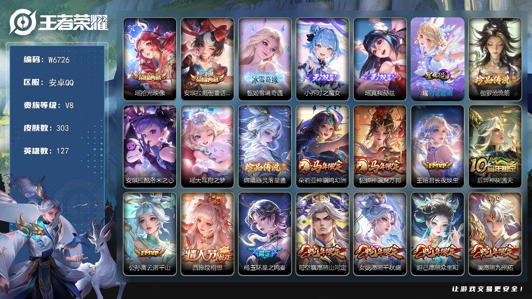 PX_2557925-【W6726】【亮点:4.2K低场次精品妹子号-瑶满皮-1荣耀水晶未兑换-满蛇年】安卓Q-不可二次-贵8-127英雄-303皮肤-3典藏(含水晶)1星元-3无双-4珍品传说-29传说-122限定-2天幕-34按键-贵族积分99654-营地ID:1782698259(热门:瑶拾光映像,安琪拉颠倒童话魔镜-甄姬雪境奇遇,小乔时之魔女,瑶真我赫兹-伽罗沧流箭,安琪拉酷洛米之心,瑶大耳狗之梦,嫦娥器灵落星盏) 【星元皮肤】:瑶时之愿境