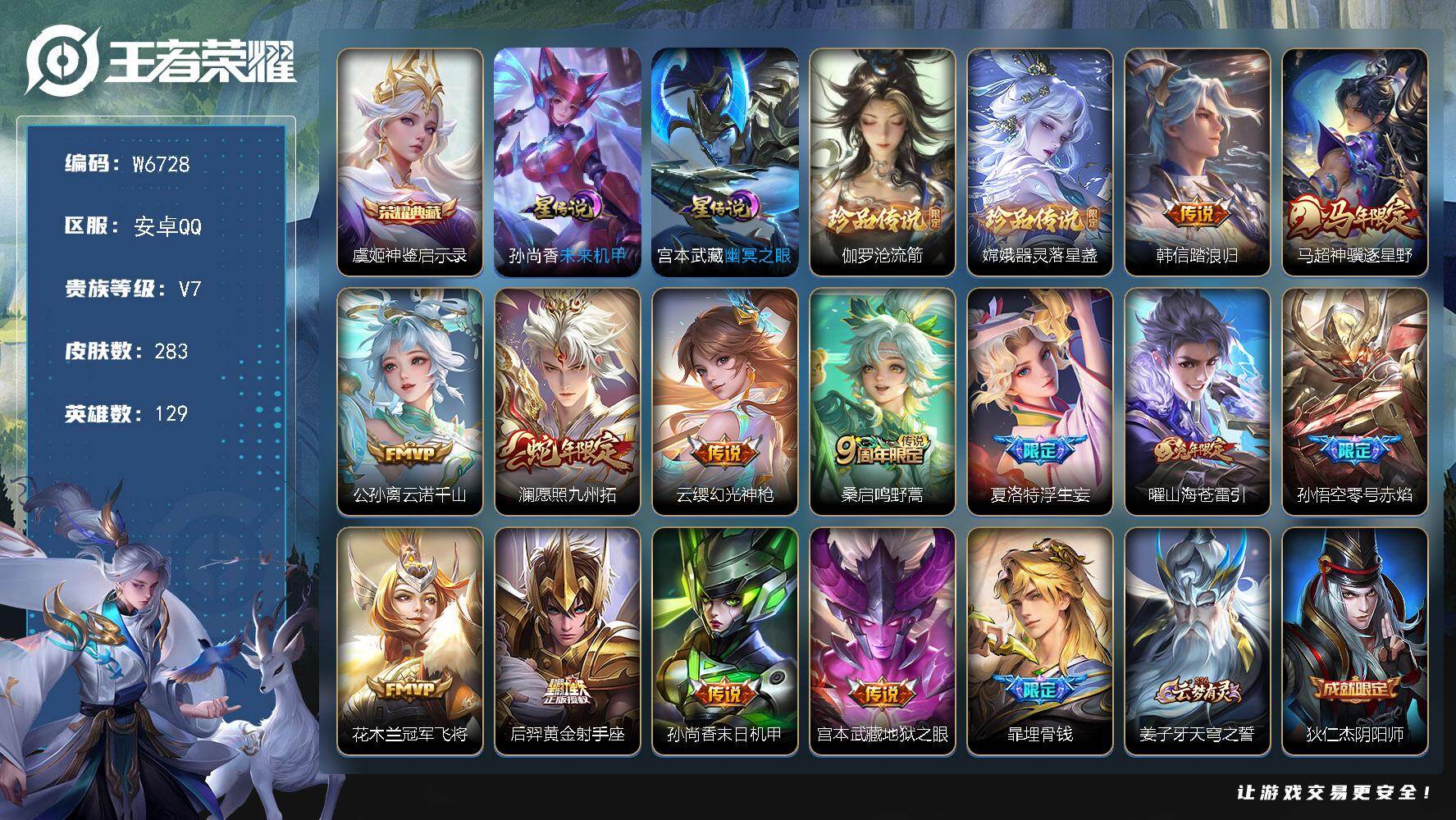 PX_2557975-【W6728】安卓Q-不可二次-贵7-129英雄-283皮肤-1典藏-2星元-2珍品传说-13传说-97限定-16按键-贵族积分46600-营地ID:479403224(热门:虞姬神鉴启示录-伽罗沧流箭,嫦娥器灵落星盏-韩信踏浪归,马超神骥逐星野,公孙离云诺千山,澜愿照九州拓,云缨幻光神枪-曜山海苍雷引-孙悟空至尊宝) 【星元皮肤】:宫本武藏幽冥之眼,孙尚香未来机甲