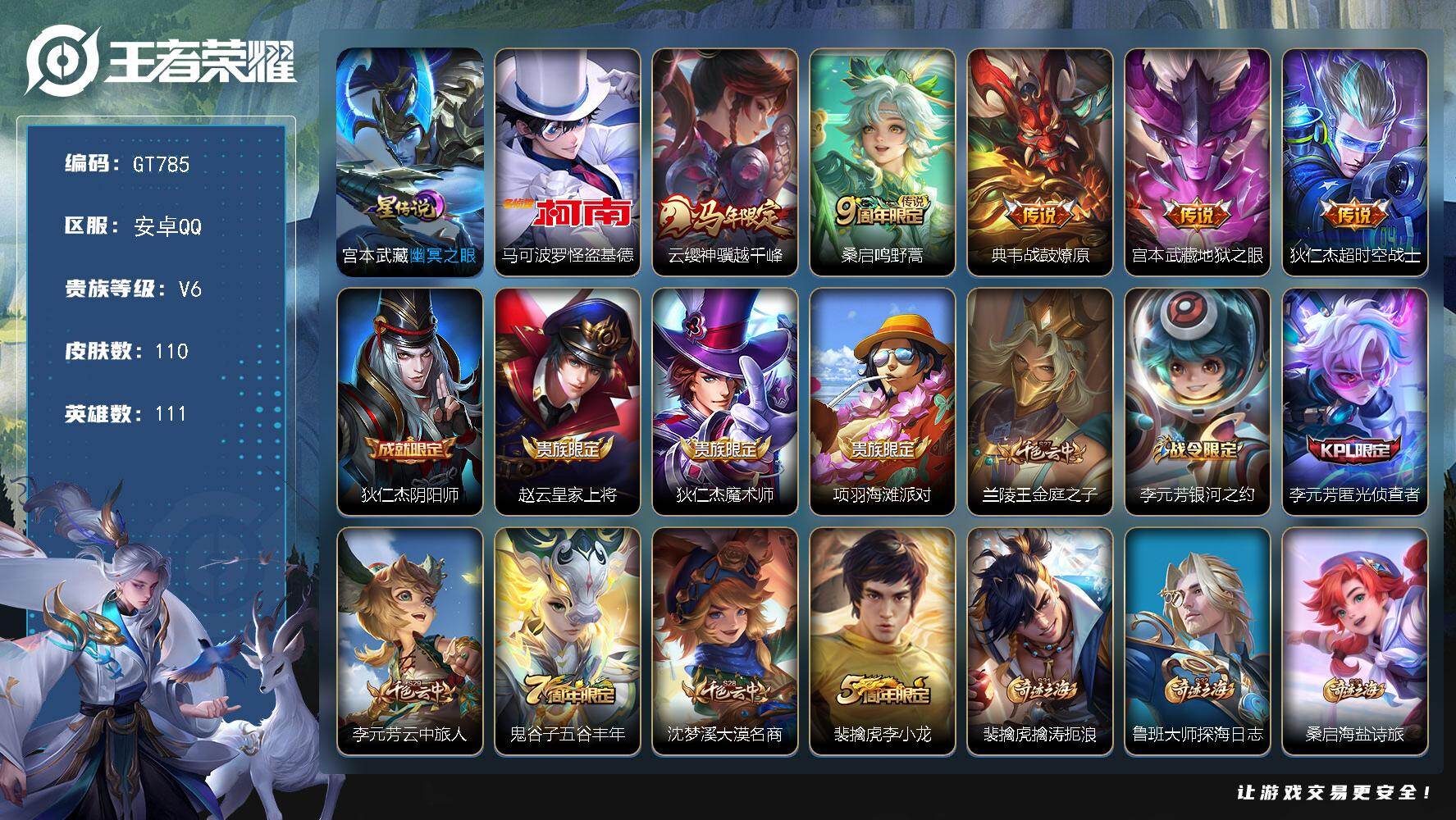 PX_2564700-可换绑【精品小号·怪盗基德·马年云嘤·】,4按键,1星传说,3王者印记,110五级铭文,可二次安卓Q-V6-110皮肤-1珍品传说-5传说-30史诗【珍品传说】:马可波罗怪盗基德【星元皮肤】:宫本武藏幽冥之眼【传说皮肤】:云缨神骥越千峰,桑启鸣野蒿,典韦战鼓燎原,宫本武藏地狱之眼,狄仁杰超时空战士【限定皮肤】:狄仁杰阴阳师,赵云皇家上将,狄仁杰魔术师,项羽海滩派对,兰陵王金庭之子,李元芳银河之约,李元芳匿光侦查者,李元芳云中旅人,鬼谷子五谷丰年,沈梦溪大漠名商,裴擒虎李小龙,裴擒虎擒涛扼浪,鲁班大师探海日志,桑启海盐诗旅,艾琳女武神,张良古海寻踪,蒙犽百解令,鬼谷子天穹祈灯,刘邦剑破天穹,刘备异域游侠【赛季限定】:兰陵王金庭之子,沈梦溪大漠名商,李元芳云中旅人,桑启海盐诗旅,裴擒虎擒涛扼浪,鲁班大师探海日志,张良古海寻踪,鬼谷子天穹祈灯,刘邦剑破天穹,东皇太一噬灭天穹,太乙真人谧流熔炉,钟馗虚灵犬护,甄姬逆浪荇歌,亚瑟荣光之誓,项羽九幽镇关【战令限定】:李元芳银河之约,亚连破空之剑,孙悟空神迹守卫,百里守约百相守梦,老夫子百相守梦,周瑜线条小狗【史诗皮肤】:周瑜线条小狗,项羽九幽镇关,黄忠百相守梦,后羿石田雨龙,狂铁龙之律动,阿轲化蝶舞,弈星万物之道,百里守约百相守梦,艾琳陌上桑,亚连破空之剑,蒙犽百解令,李元芳匿光侦查者,鬼谷子五谷丰年,裴擒虎李小龙,橘右京修罗,李元芳银河之约,狄仁杰鹰眼统帅,白起星夜王子,安琪拉心灵骇客,雅典娜冰冠公主,兰陵王暗隐猎兽者,曹操幽灵船长,刘禅绅士熊喵,墨子金属风暴,孙尚香水果甜心,宫本武藏鬼剑武藏,狄仁杰魔术师,甄姬冰雪圆舞曲,貂蝉圣诞恋歌,赵云皇家上将,露娜紫霞仙子【其他皮肤】:艾琳鹤鸣心笺,亚瑟荣光之誓,哪吒罗小黑战记,鬼谷子克喵,莱西奥踏浪烽翎,甄姬逆浪荇歌,白起死霸装,雅典娜潮玩士官长,钟馗虚灵犬护,戈娅玫蓝誓约,西施雪境奇遇,影魅影绮裳,典韦铁骨偃魂,太乙真人谧流熔炉,苍苍林狼骑,吕布逐霄战戟,干将莫邪雾都夜雨,老夫子百相守梦,东皇太一噬灭天穹,孙悟空神迹守卫,刘备异域游侠,刘邦剑破天穹,鬼谷子天穹祈灯,后羿完美运算,钟无艳聚星闪耀,张良古海寻踪,李元芳妄想特派,姬小满零食大作战,鲁班大师探海日志,裴擒虎擒涛扼浪,白起乐园追猎者,桑启海盐诗旅,戈娅危途狂花,李元芳云中旅人,蒙恬蔚蓝守将,蒙犽胡桃狂想曲,沈梦溪大漠名商,兰陵王金庭之子,盘古重装意志,狂铁特工战影,小乔丁香结,诸葛亮掌控之力,关羽龙腾万里,刘备纽约教父,狄仁杰阴阳师,宫本武藏万象初新,甄姬花好人间,达摩拳王,典韦黄金武士,孙膑天使之翼,安琪拉玩偶对对碰,宫本武藏未来纪元,武则天东方不败,艾琳女武神,芈月红桃皇后,赵云忍炎影,露娜哥特玫瑰,韩信街头霸王,韩信教廷特使,项羽海滩派对,马超幸存者,猪八戒年年有余,元歌午夜歌剧院,弈星踏雪寻梅,明世隐占星师,百里守约绝影神枪,大乔伊势巫女,苍维京掠夺者,马可波罗激情绿茵,钟馗地府判官,李白范海辛,露娜绯红之刃,鲁班七号木偶奇遇记