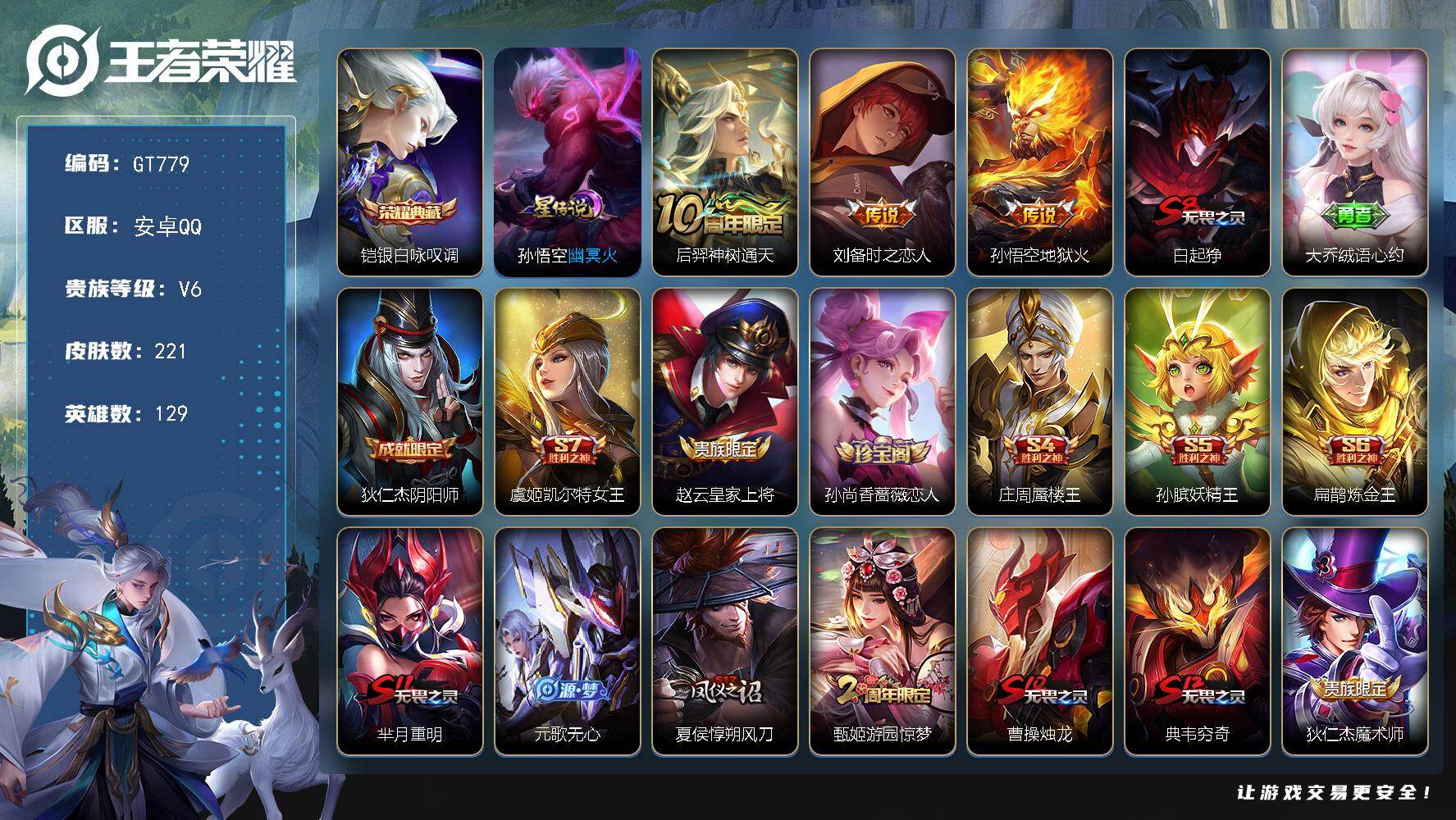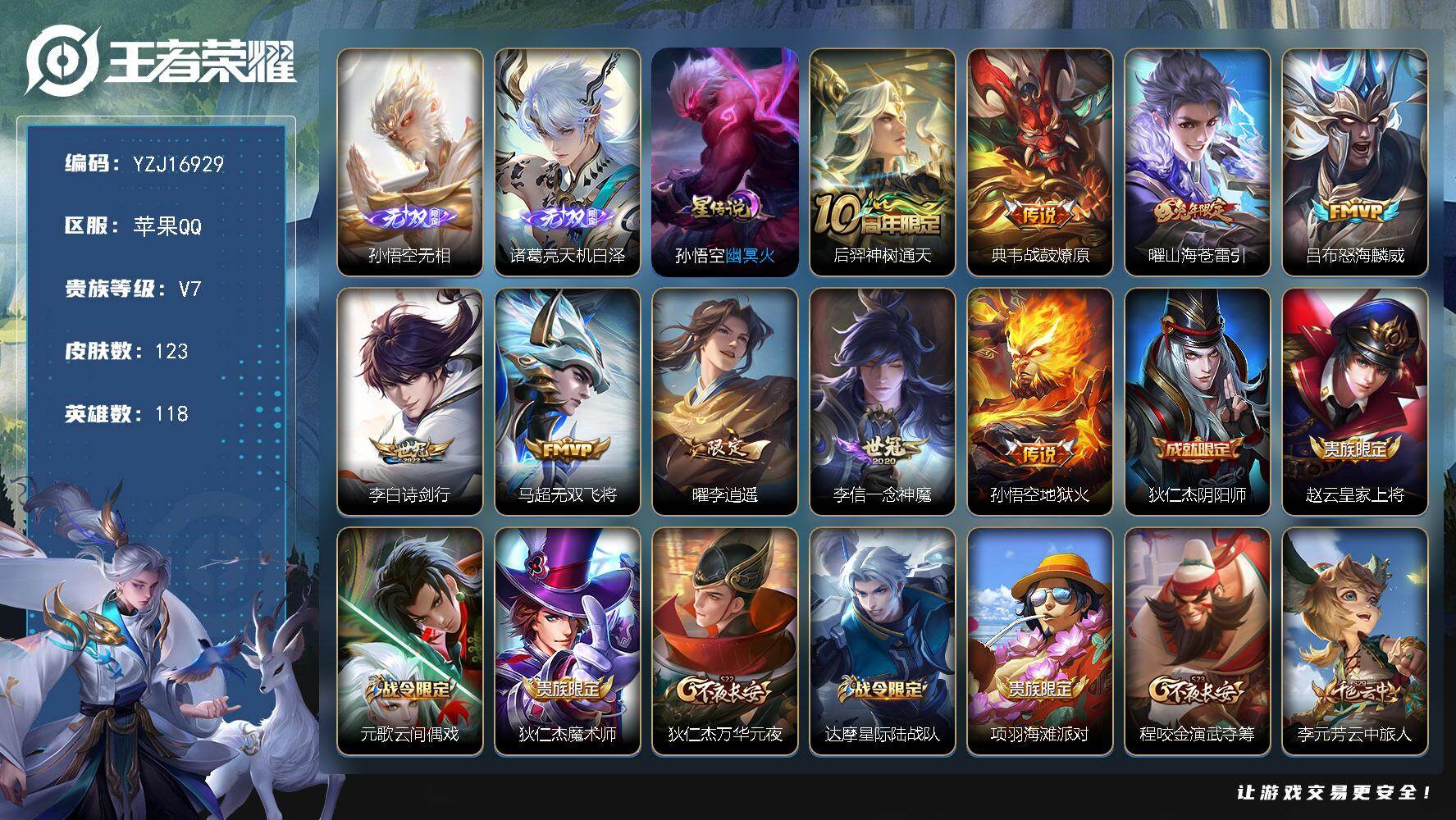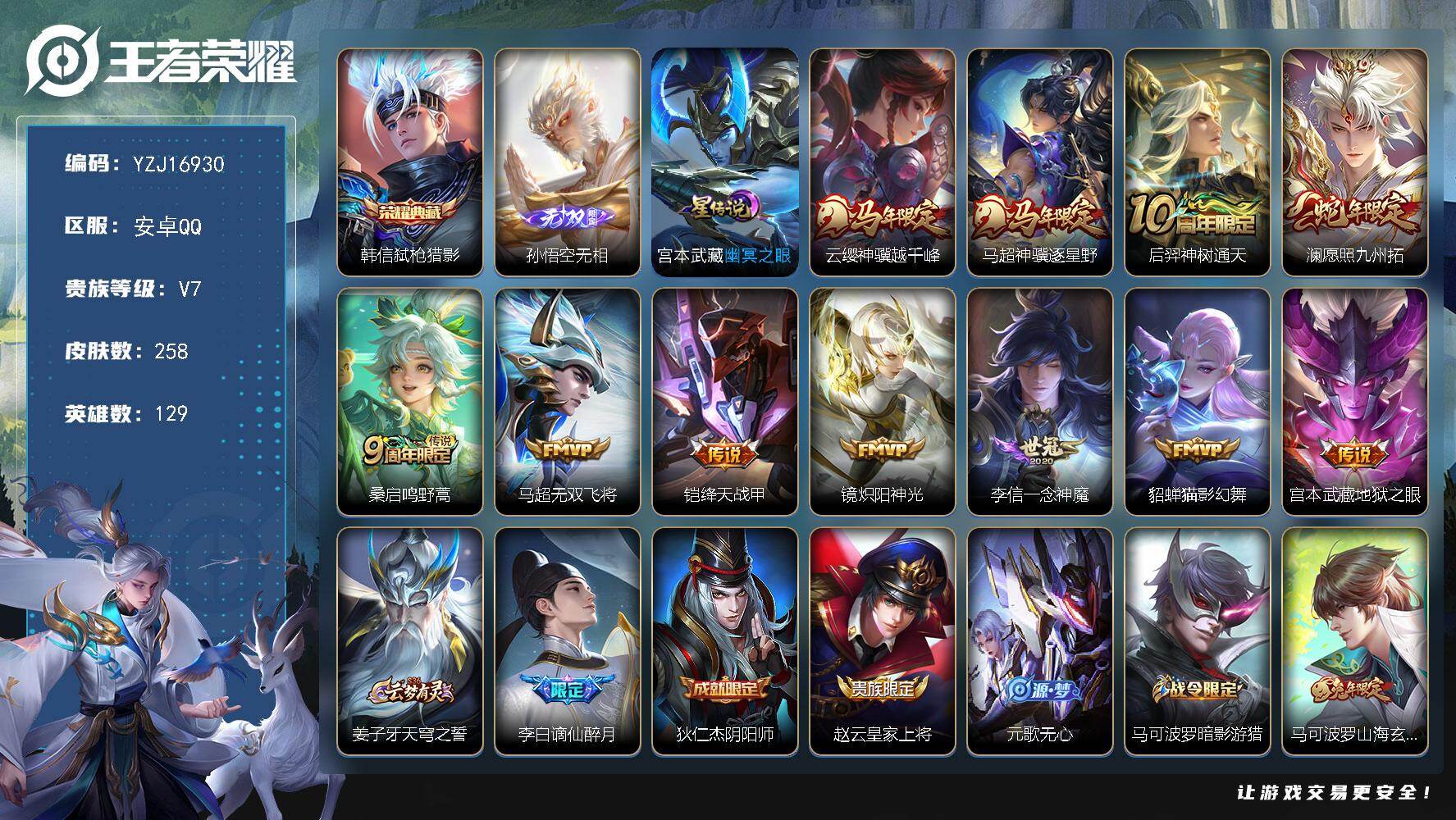 PX_2563019-实名:,可修改,贵族等级:,V5,英雄数:,128,皮肤数:,196,荣耀水晶:,千魇归渊,星传说:,幽冥火,传说皮:,久胜战神,地狱火,记忆之芯,限定皮:,李小龙,梁祝,五谷丰年,鸣野蒿